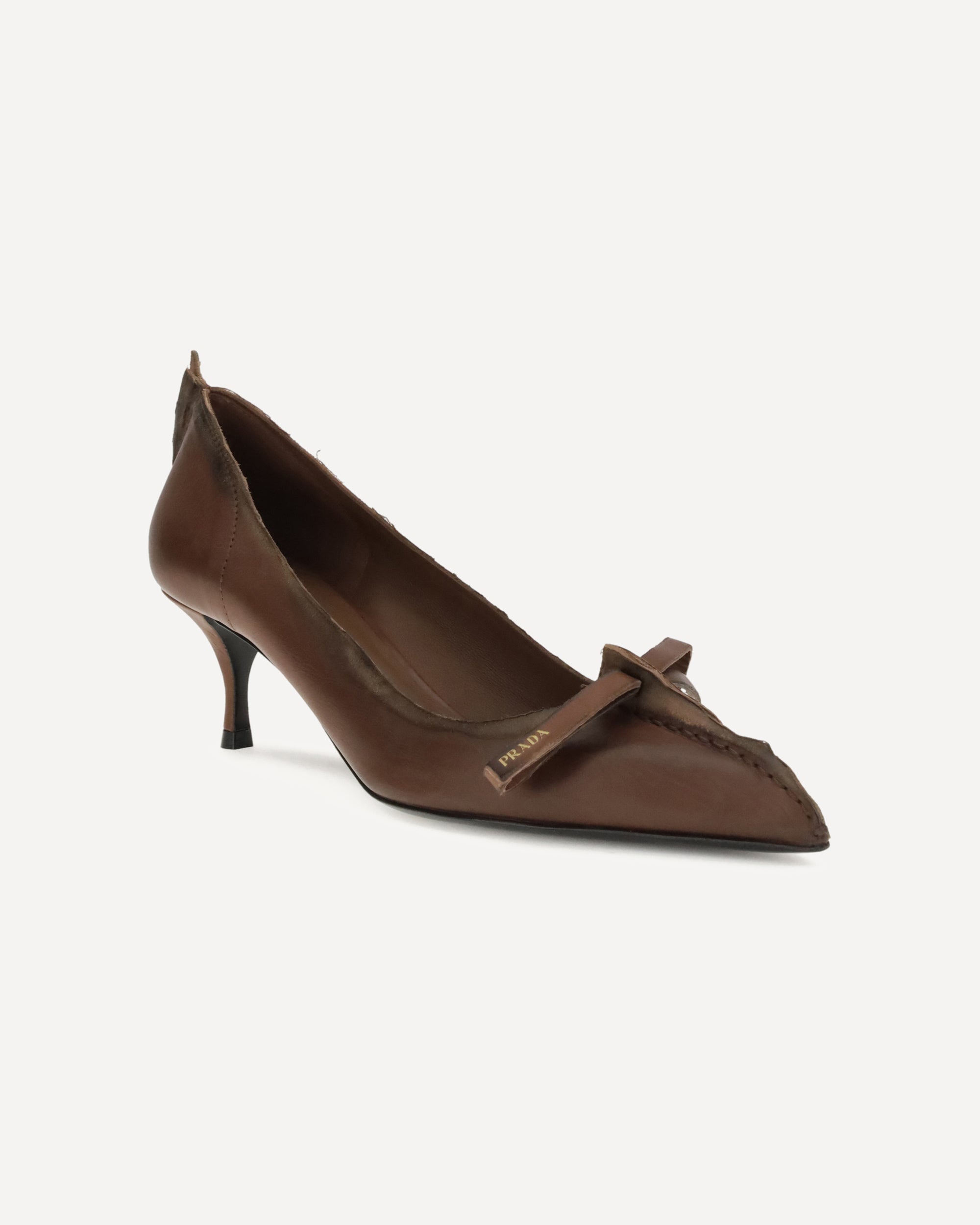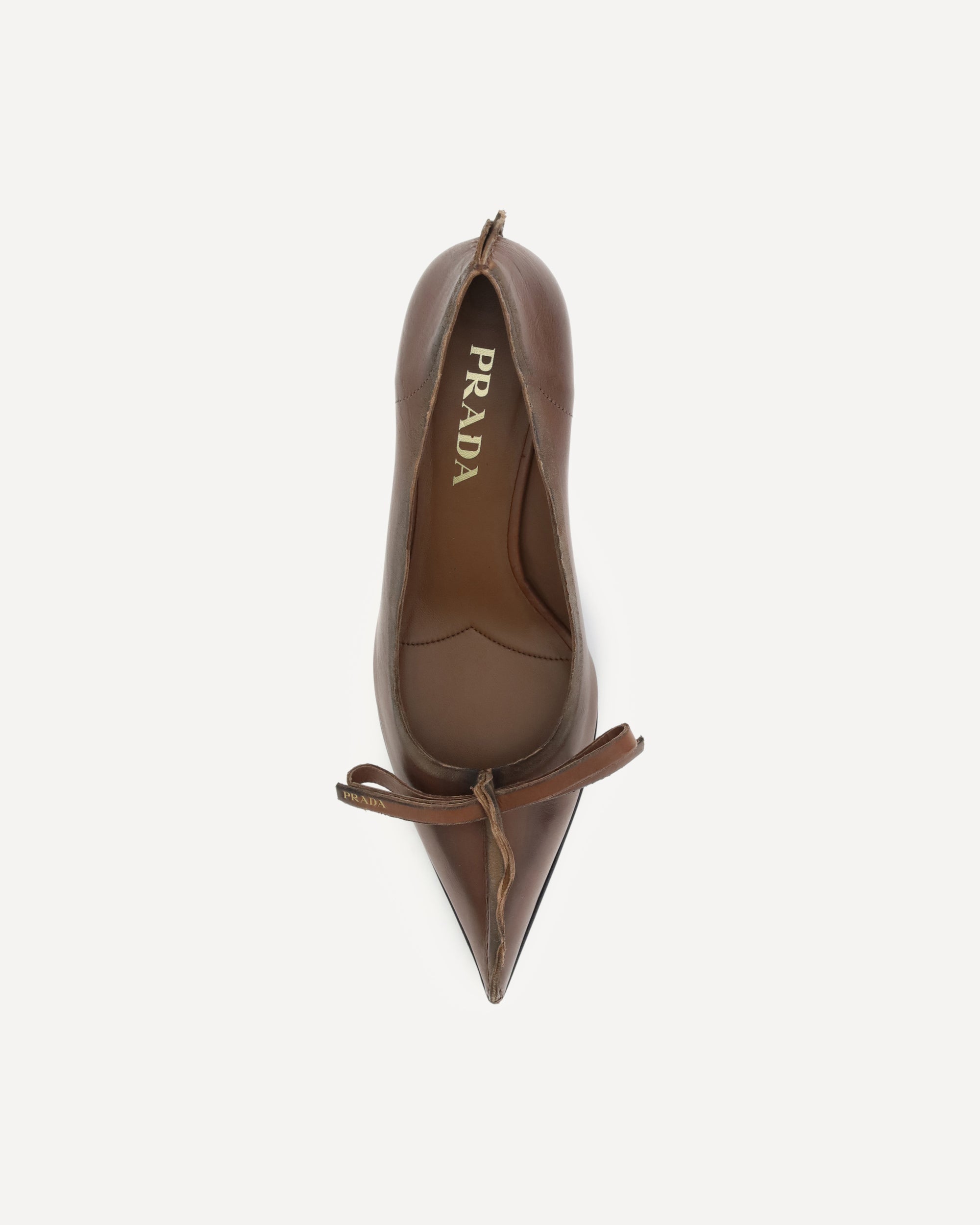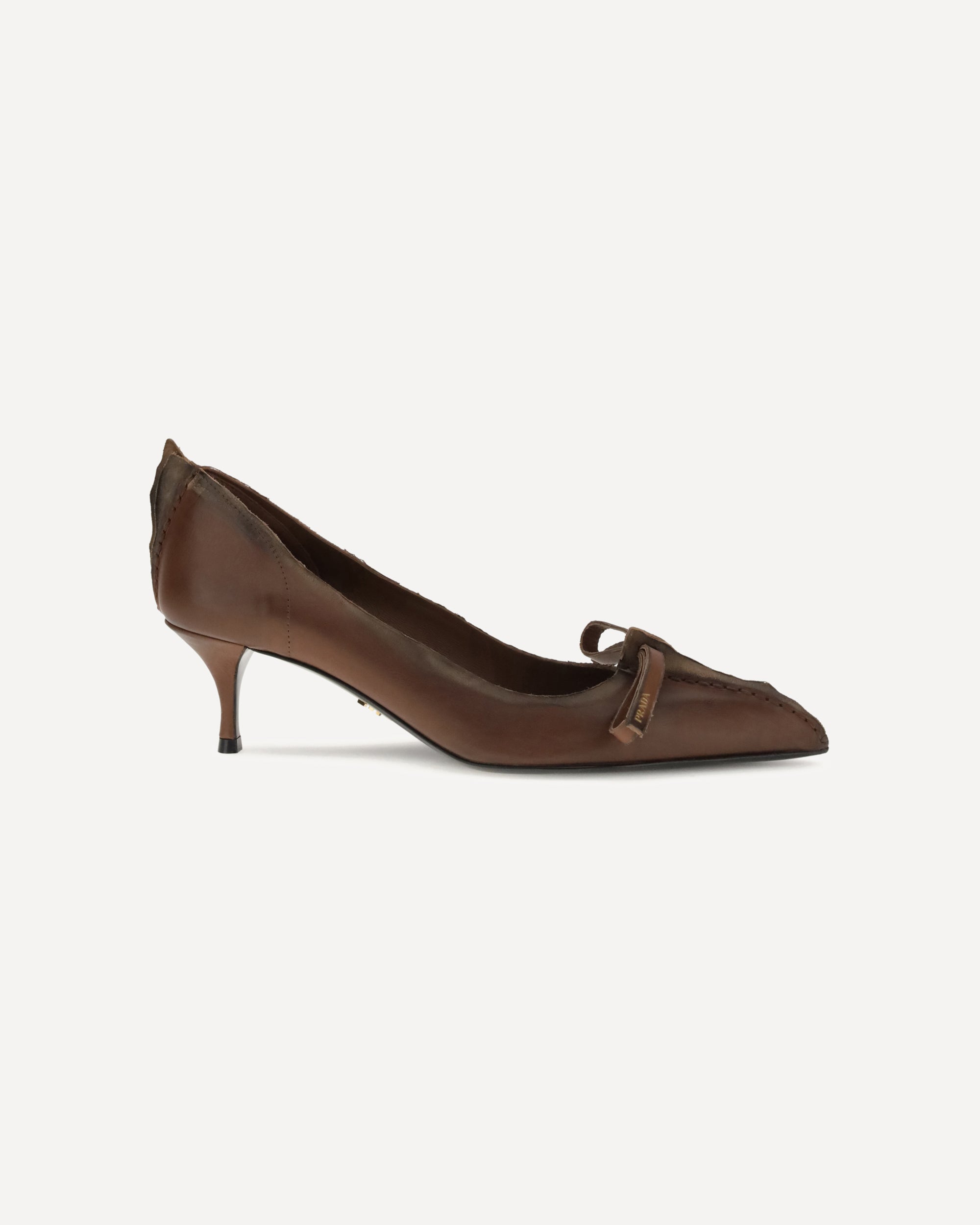 Le Décolleté in pelle anticata di Prada reinterpretano un classico della femminilità con un’estetica audace e non convenzionale. La silhouette a punta affusolata è realizzata in pelle con effetto anticato, arricchita da cuciture a vista e bordi grezzi volutamente lasciati incompiuti, per un look dall’eleganza imperfetta. Il tacco kitten, raffinato e discreto, completa il design con un tocco di sofisticata originalità.