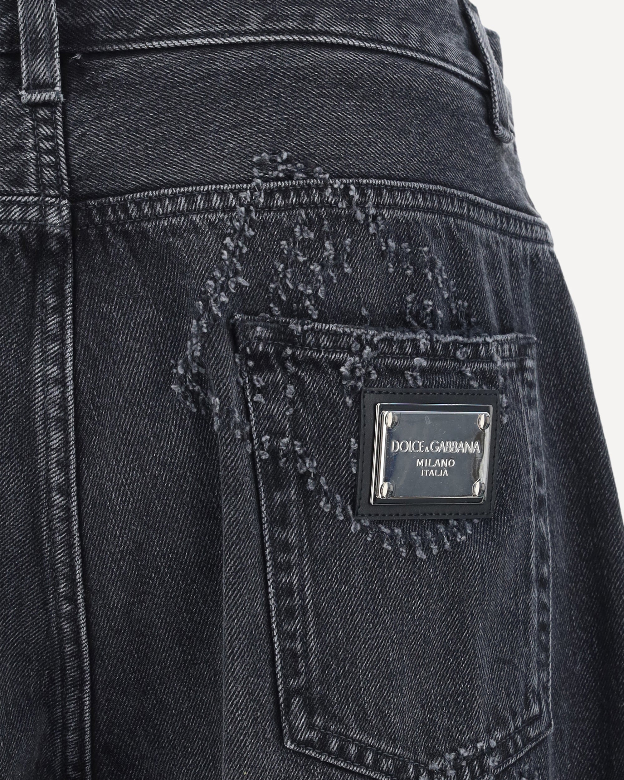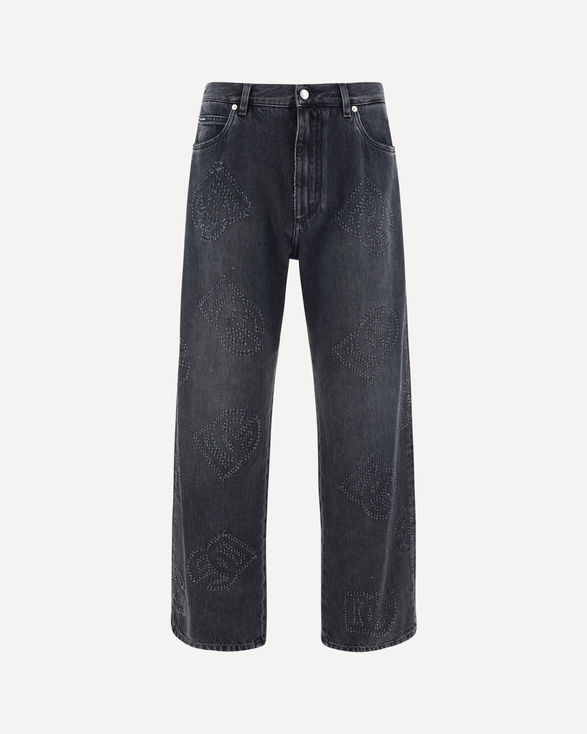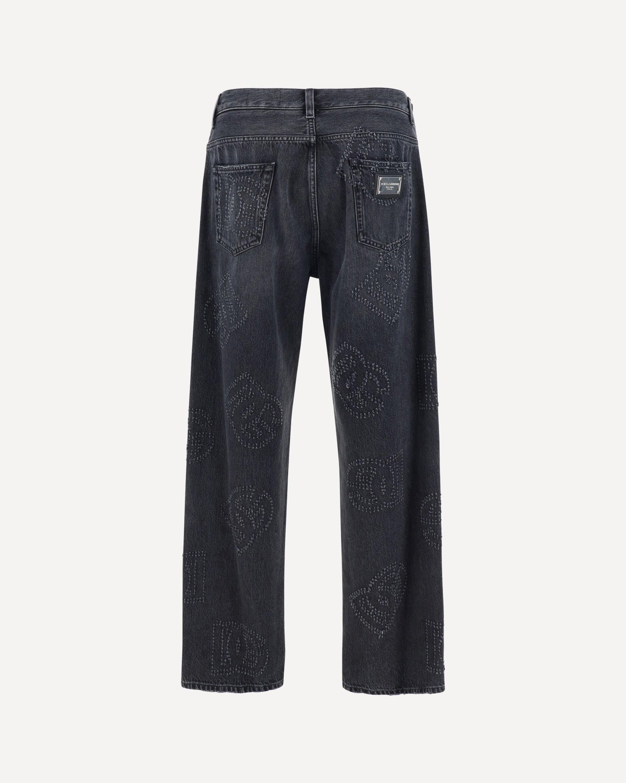 Pantaloni Denim in Cotone di Dolce&Gabbana, modello straight a cinque tasche, chiusura frontale con bottone e cerniera, passanti per cintura girovita, iconico monogramma D&G ricamato all-over sul fronte, iconico Hardware metallico con firma brand applicato sul retro.
