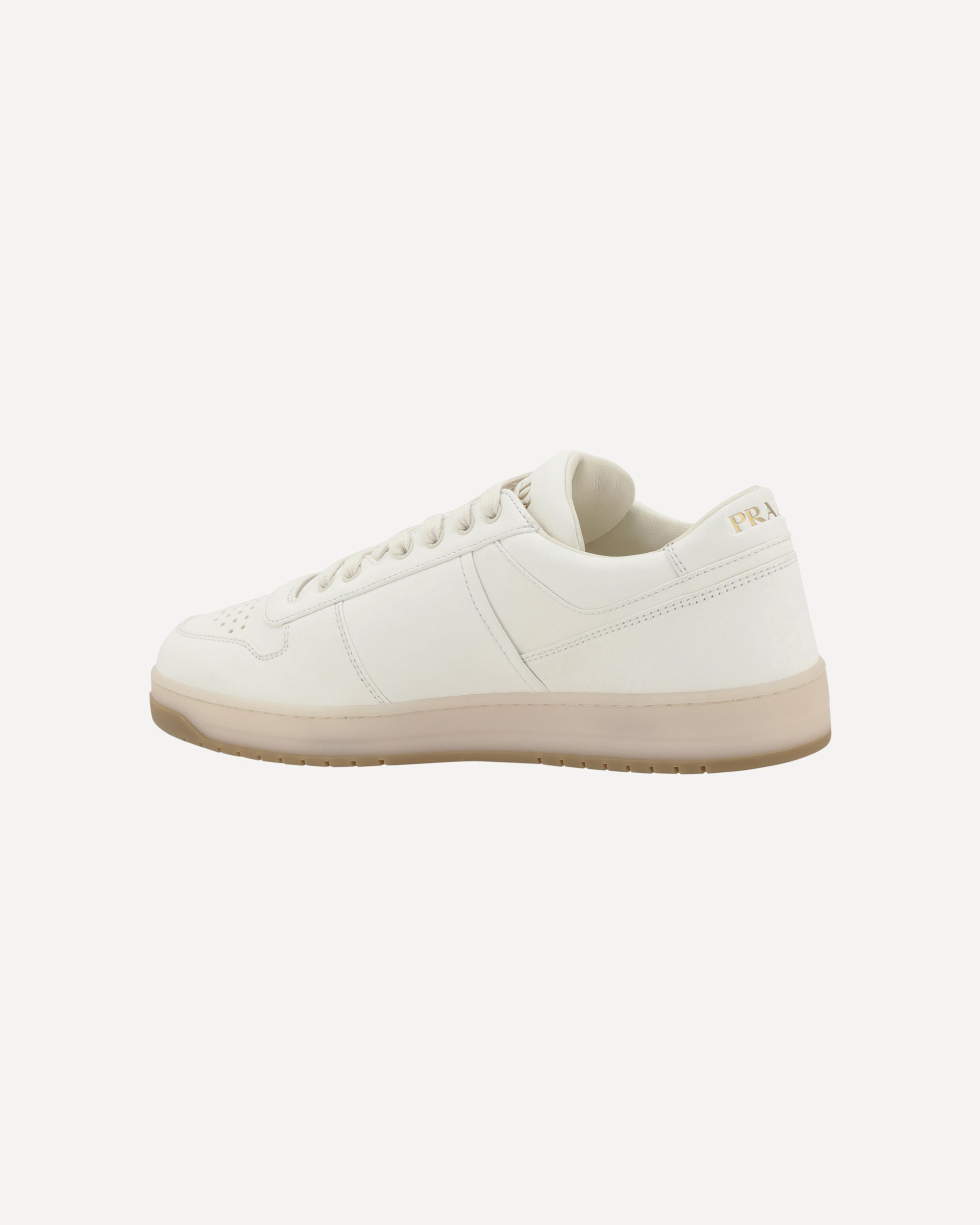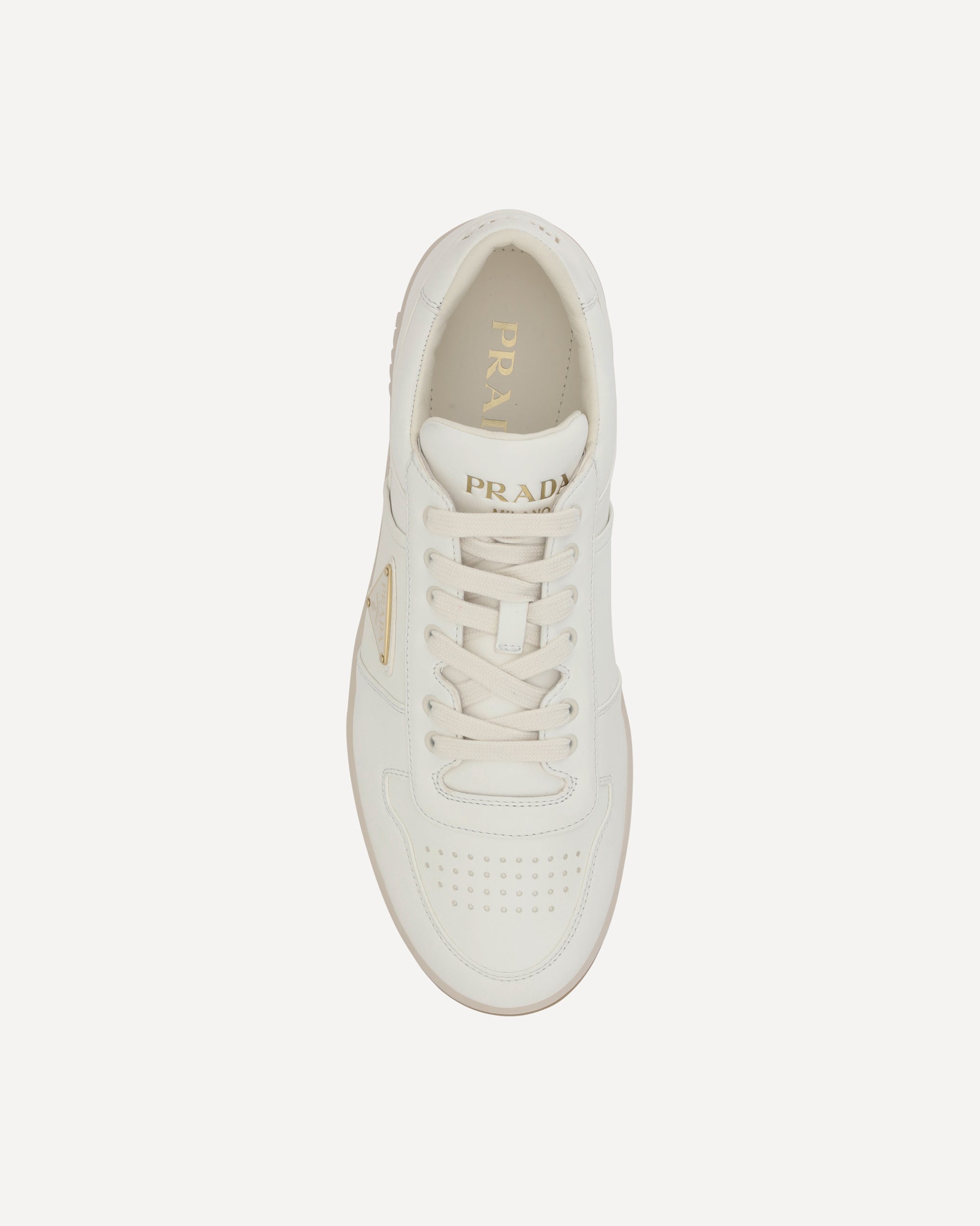 Le Sneakers Downtown in pelle di Prada combinano linee sportive e dettagli iconici in un design raffinato. Caratterizzate da una struttura a pannelli, presentano una chiusura frontale con lacci, punta tonda traforata e suola piatta. L’iconica placca triangolare smaltata con il logo Prada decora il pannello laterale esterno, mentre tallone e linguetta sono anch’essi logati. Un modello essenziale ma distintivo, perfetto per uno stile urbano ed elegante.
