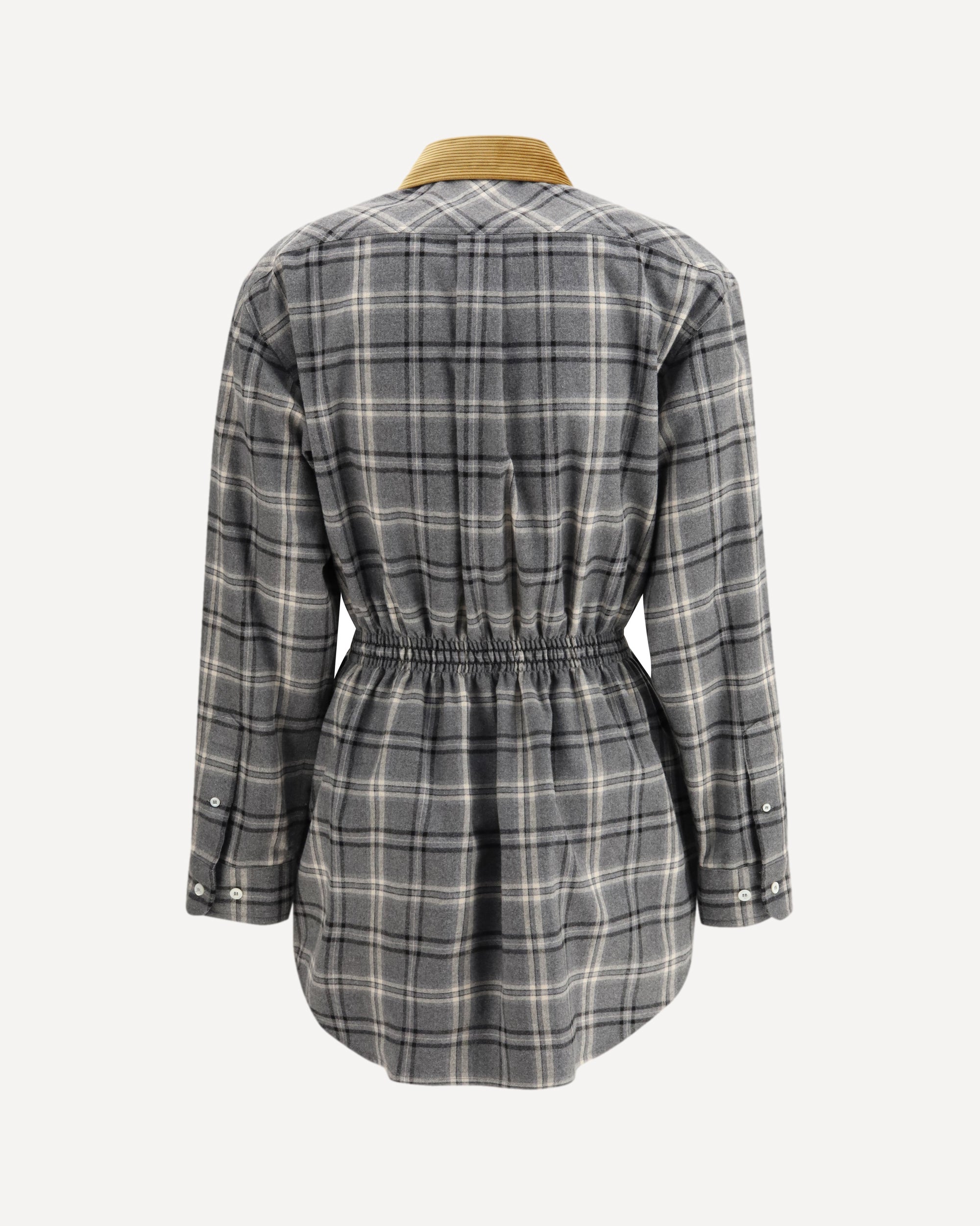 Il mini Abito in flanella di Miu Miu nasce dall’immaginario della camiceria maschile, trasformato in una silhouette femminile e definita che gioca con contrasti e richiami rétro. La vita leggermente aderente si unisce al colletto in velluto e ai polsini camicia, creando un equilibrio tra rigore sartoriale e delicatezza moderna. Le tasche inserite e quelle applicate aggiungono praticità, mentre il logo ricamato in pelle firma il capo con l’inconfondibile allure vintage del brand.