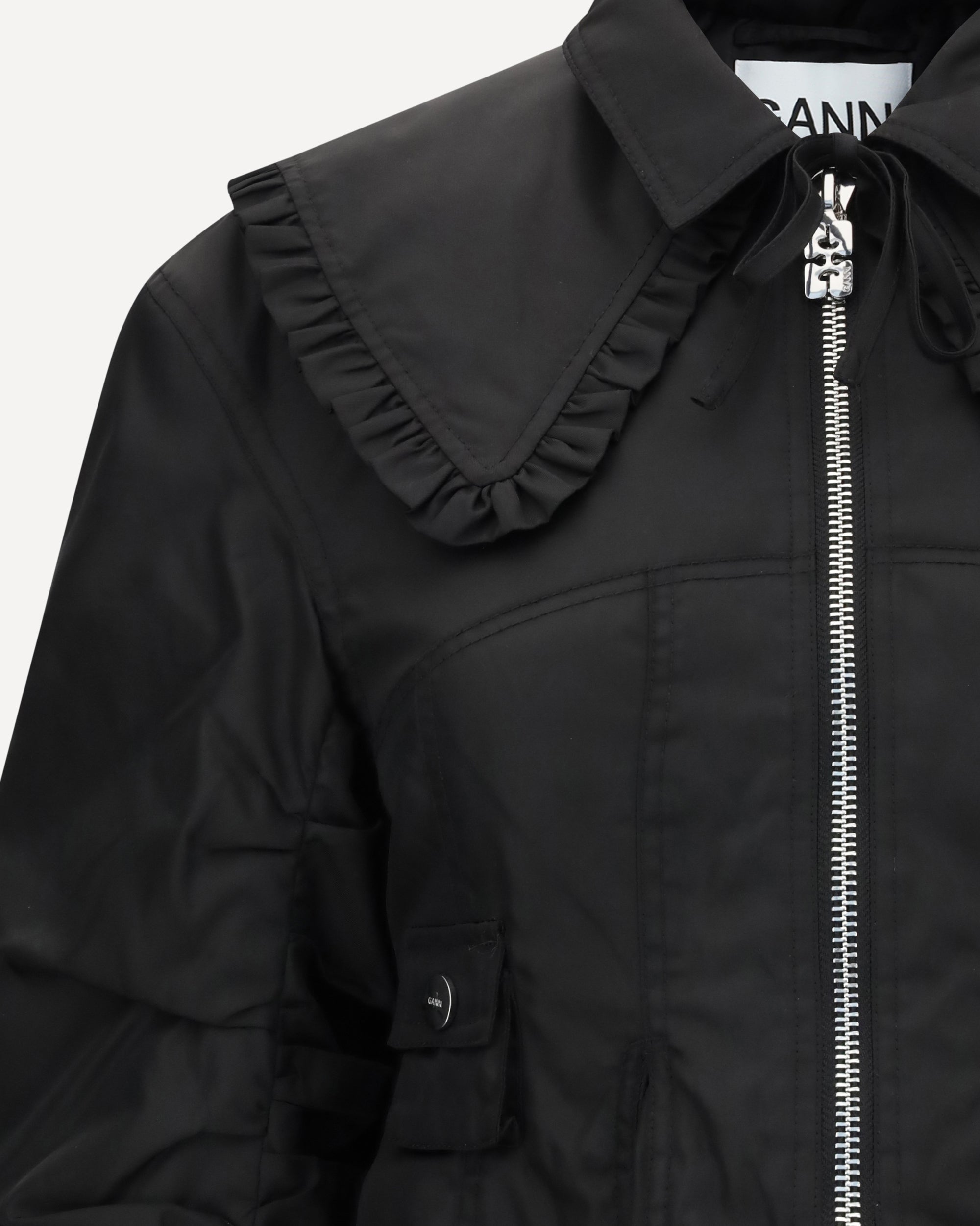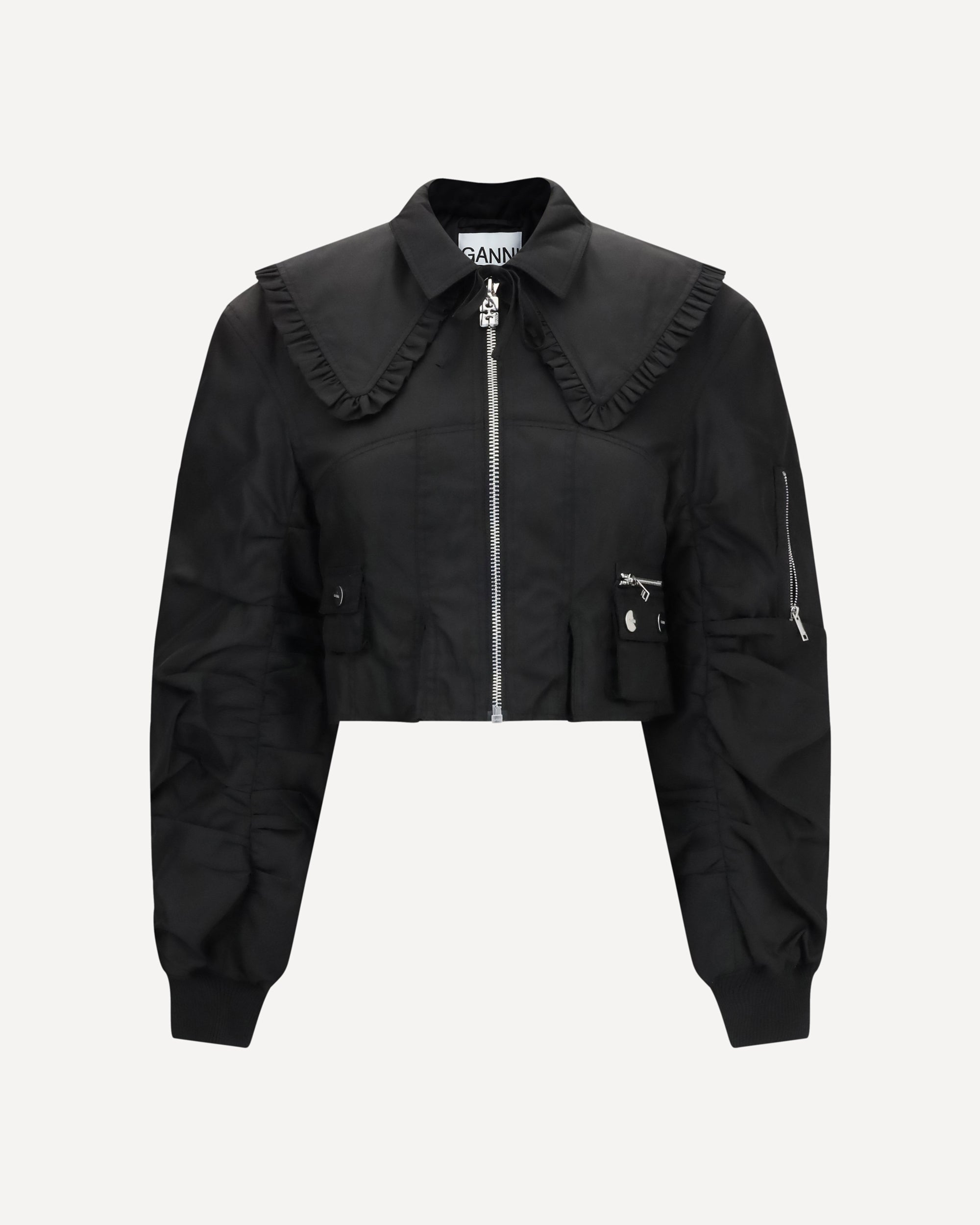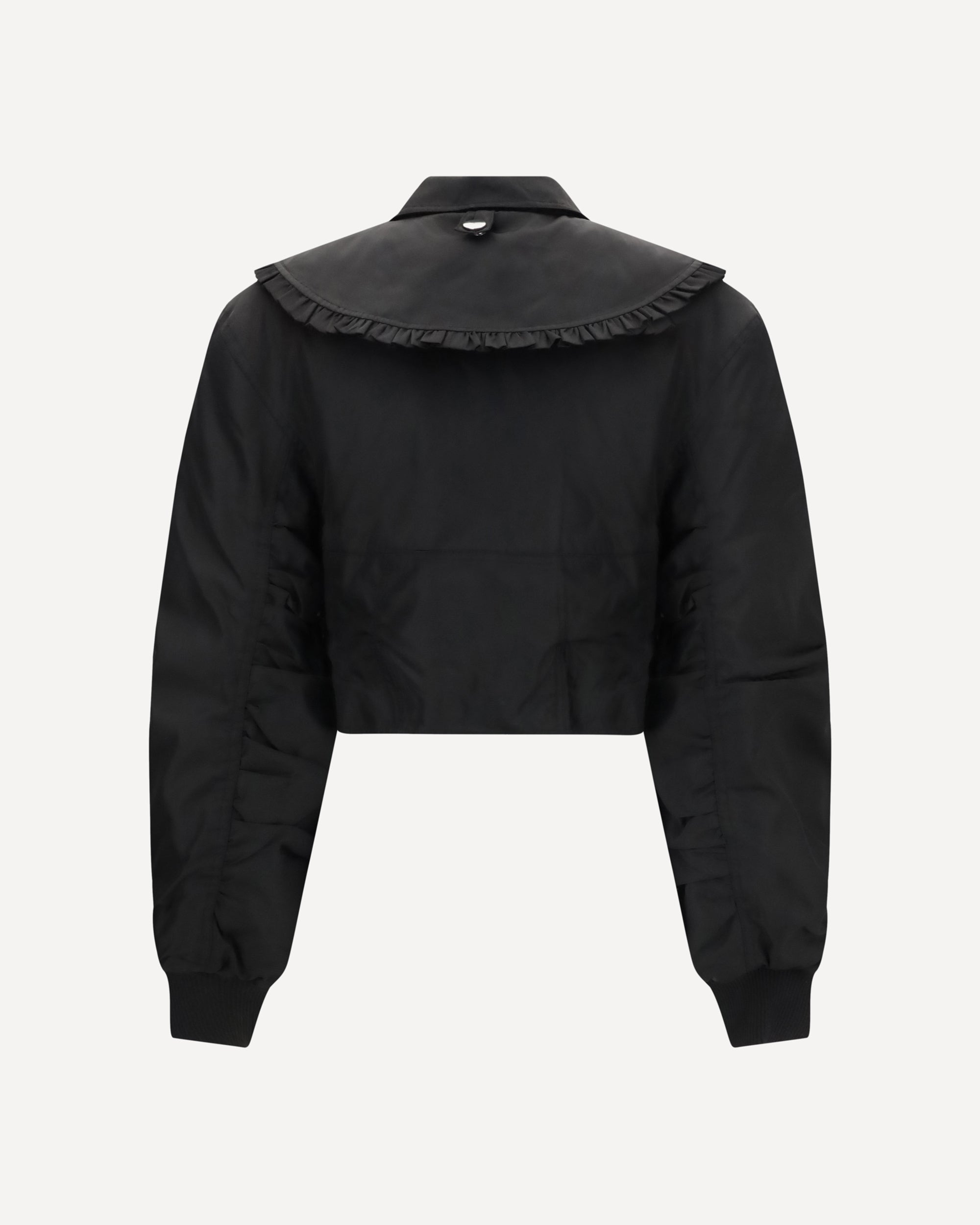 La Giacca bomber Duchesse di Ganni è un capo dallo stile audace e moderno, con un taglio crop che lo rende versatile e contemporaneo. La chiusura frontale con cerniera e le tasche applicate con cerniera e bottoni automatici aggiungono funzionalità e dettagli pratici, mentre le tasche a filetto sulle maniche offrono un tocco distintivo. I polsini a costine e l'ampio colletto a balze removibile completano il look, conferendo un tocco di eleganza e possibilità di personalizzazione.