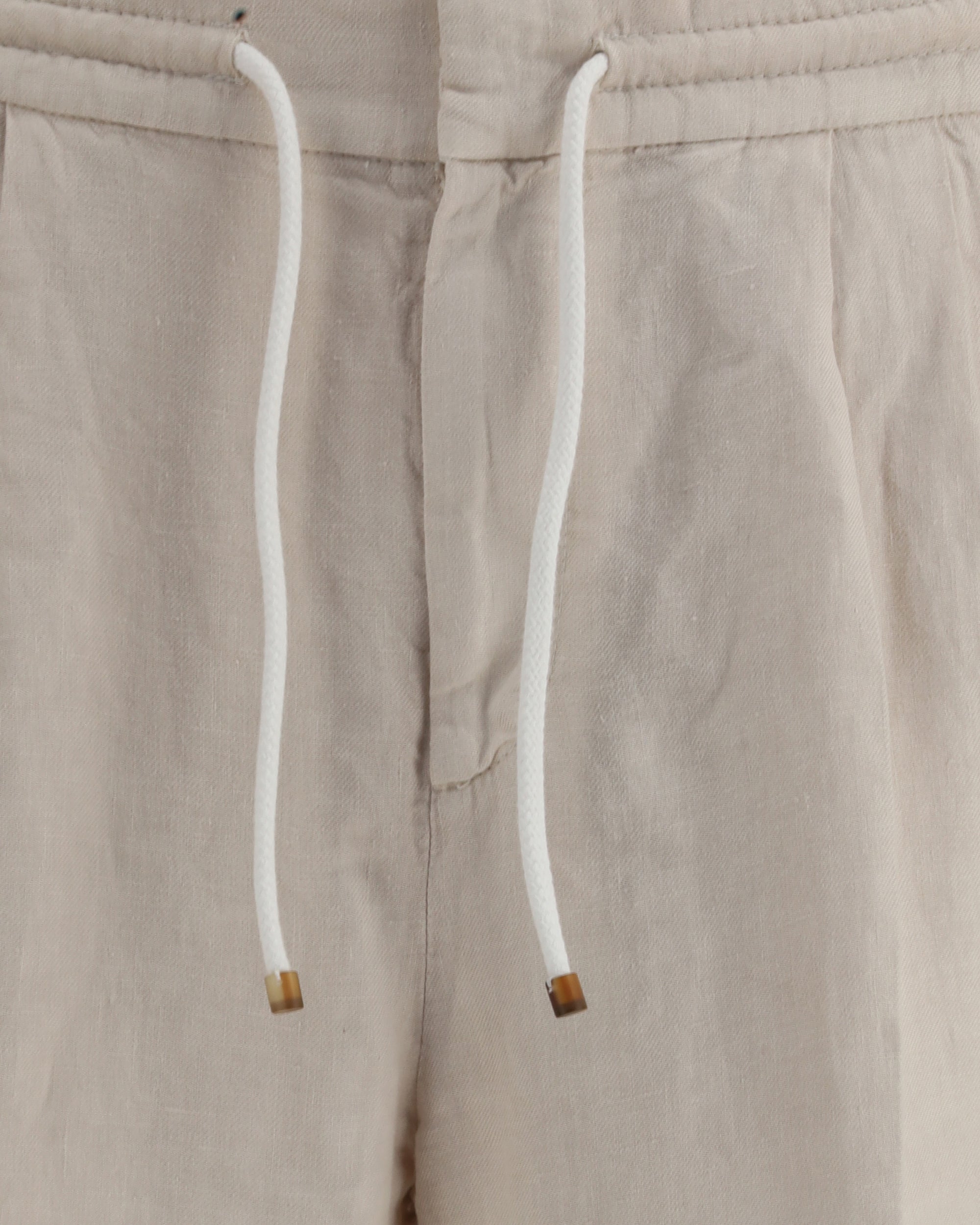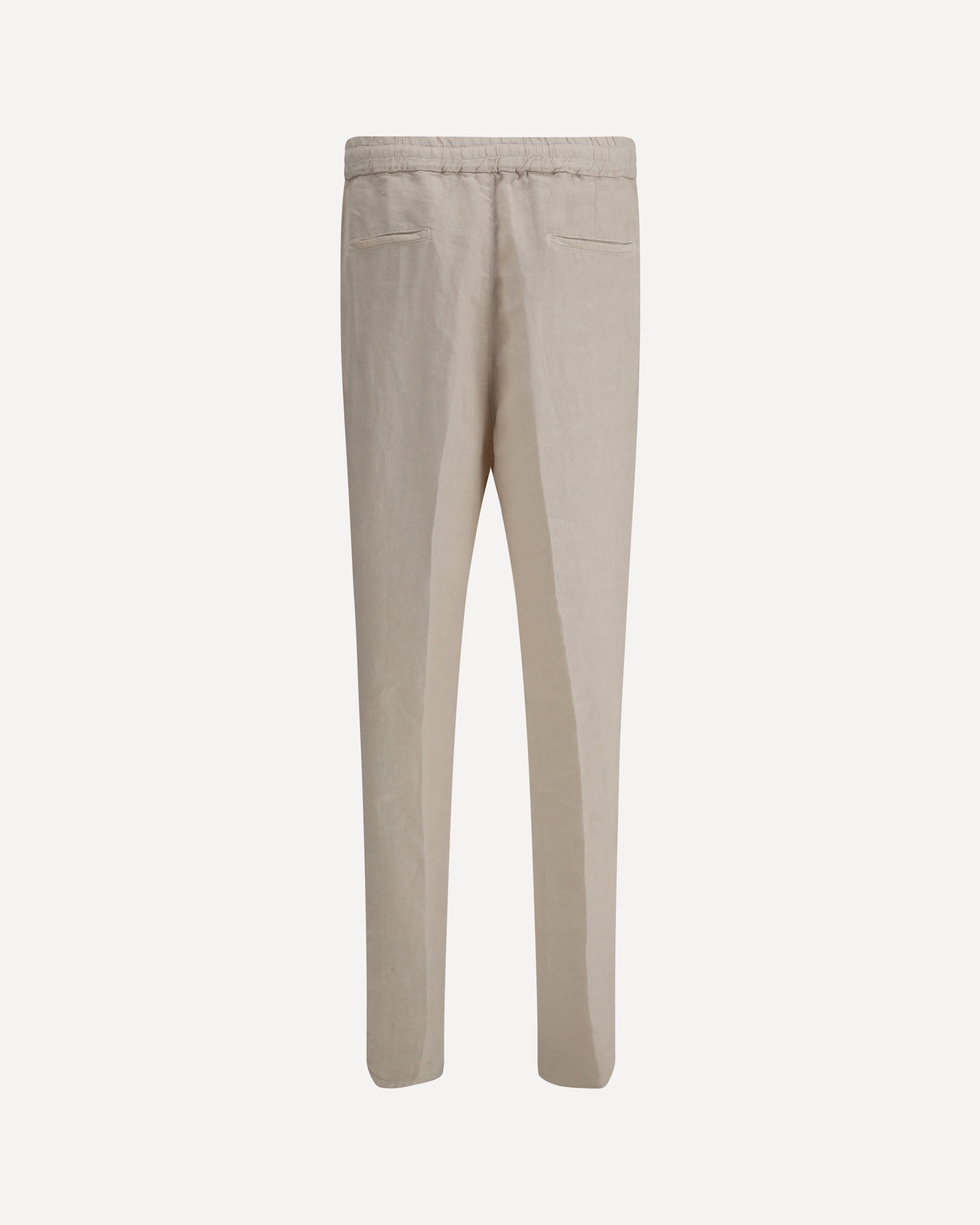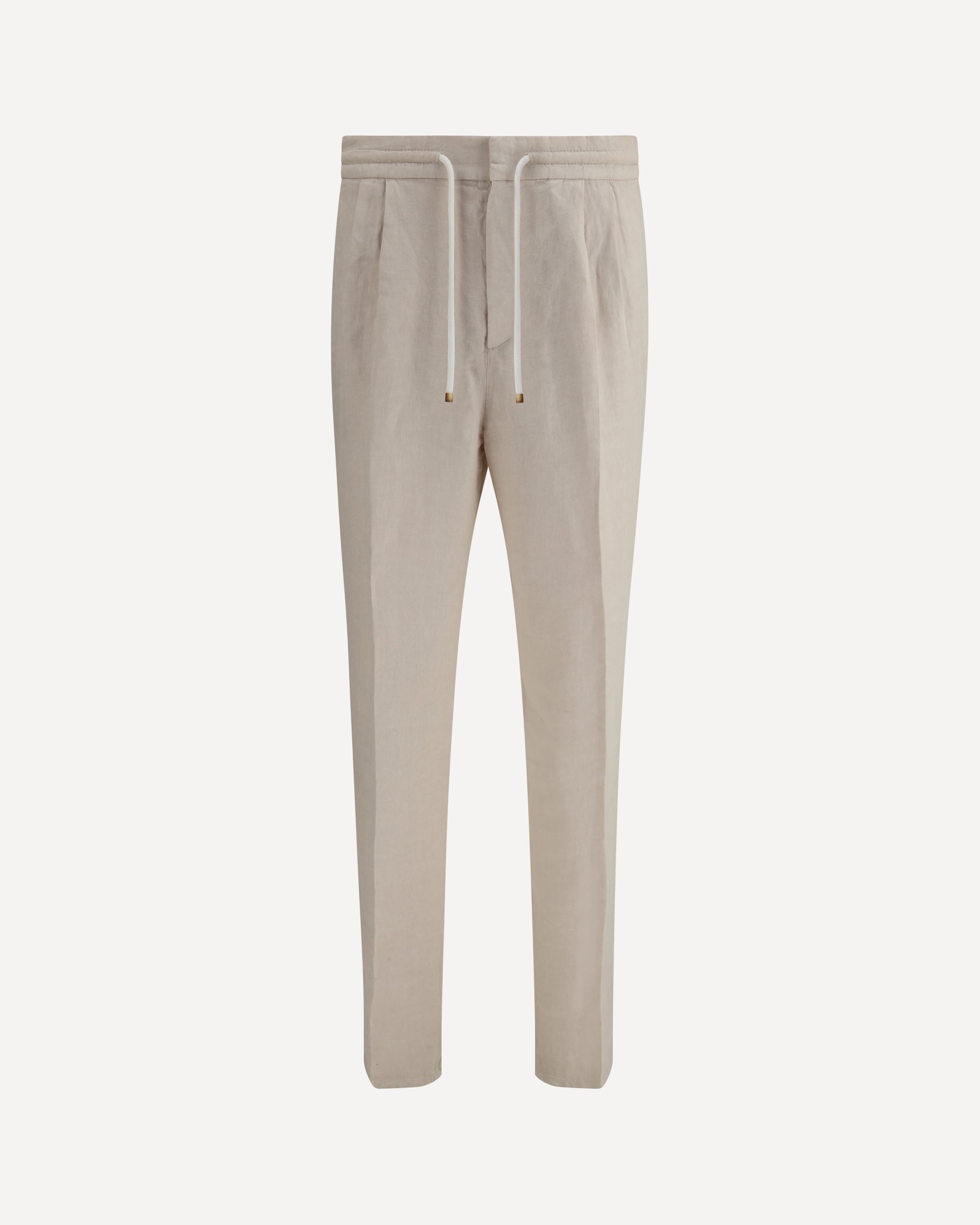 I Pantaloni in lino di Brunello Cucinelli presentano un girovita elasticizzato regolabile tramite coulisse, che permette un adattamento perfetto alla vita. La chiusura frontale è dotata di cerniera e ganci, per un look pulito e sofisticato. Le tasche laterali a filetto e le tasche a fessura sul retro aggiungono praticità e un tocco di eleganza discreta. Il design monocromo rende il capo versatile e facilmente abbinabile, mentre la vestibilità regular offre comfort e libertà di movimento.