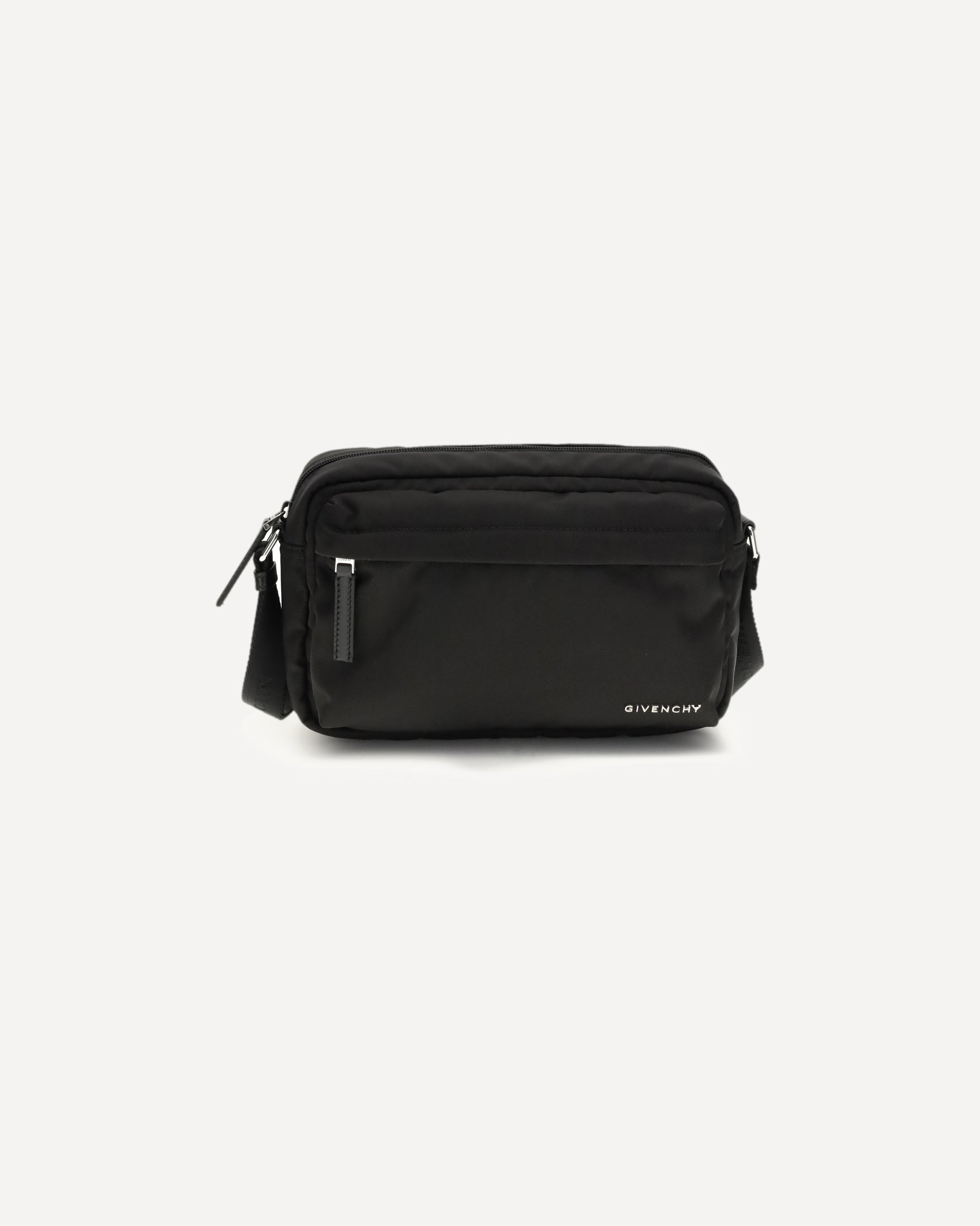 La Borsa Essential U di Givenchy è realizzata in nylon resistente ed è rifinita da dettagli iconici della Maison. Il modello presenta una chiusura con cerniera e tiralampo in pelle, mentre la tracolla regolabile in webbing con logo GIVENCHY permette di indossarla comodamente a tracolla. Sul davanti campeggia la firma GIVENCHY in metallo, mentre all’interno è presente un’applicazione GIVENCHY Paris. La borsa è dotata di uno scomparto principale con zip, due tasche frontali con cerniera e un’ulteriore tasca con zip sul retro, offrendo spazio ben organizzato e funzionale. I dettagli metallici presentano una finitura argento.