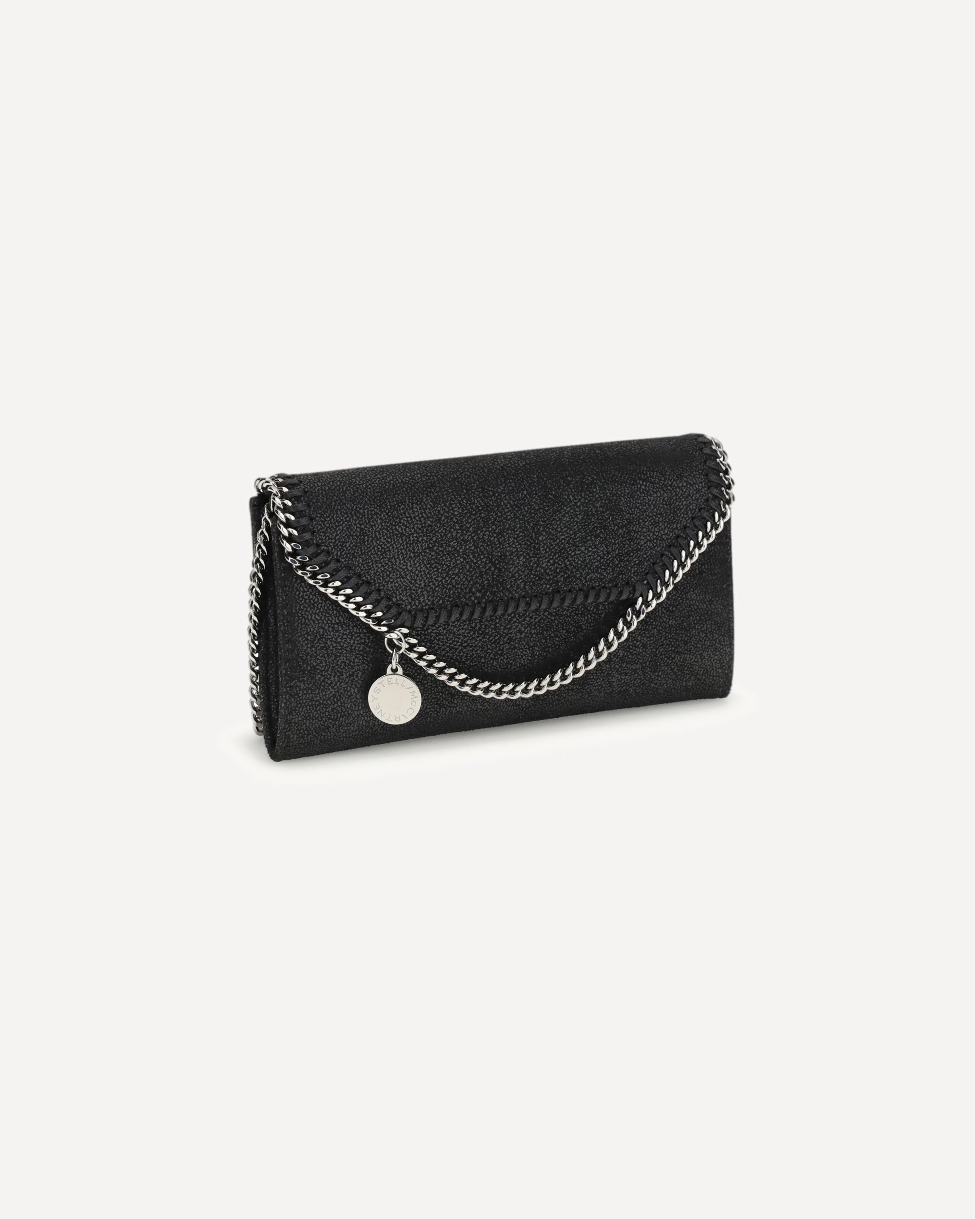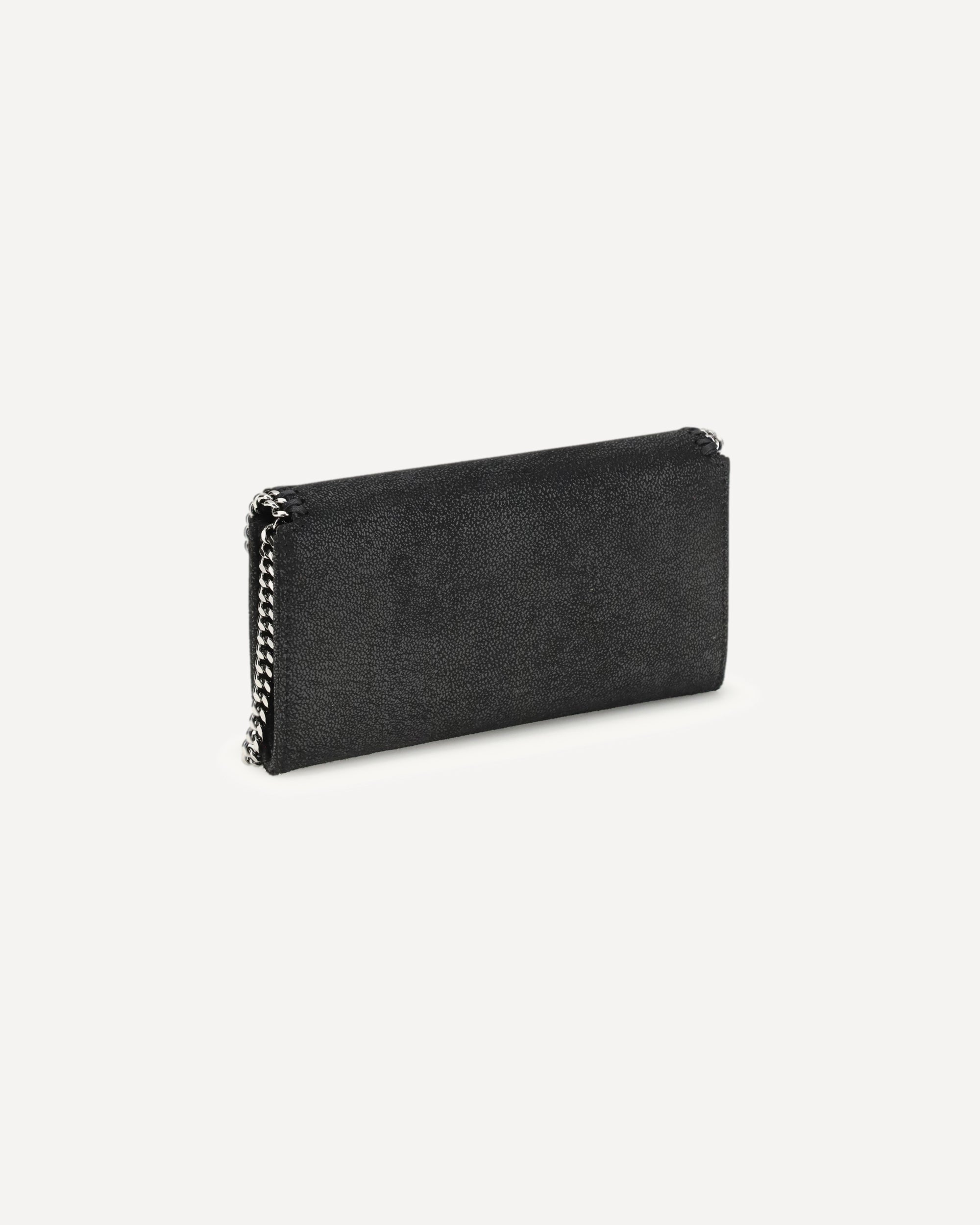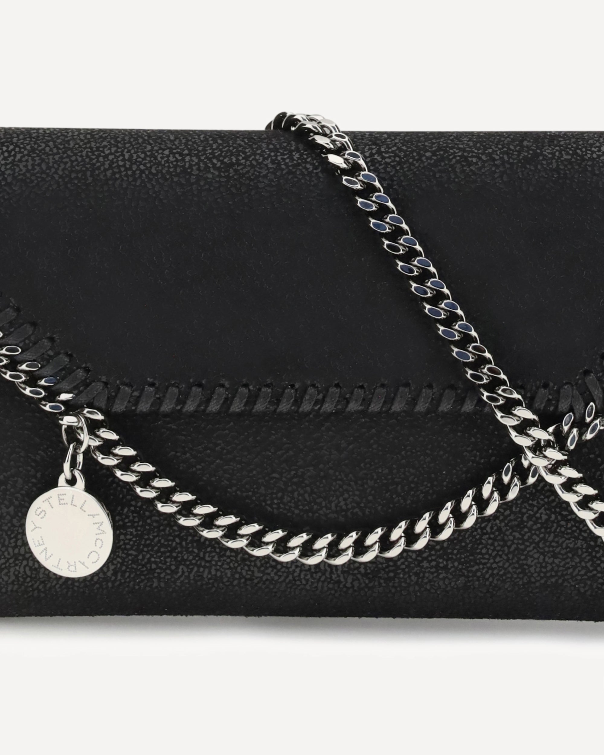 La Pochette Falabella Continental di Stella McCartney è una raffinata tracolla a portafoglio realizzata in tessuto vegano Shaggy Deer di colore nero, simbolo dell’impegno del brand per la moda sostenibile. Impreziosita dalla catena iconica con ciondolo, presenta una chiusura con bottone automatico che custodisce un interno organizzato con una tasca piatta per banconote, otto slot per carte e una tasca con zip per monete o piccoli oggetti.