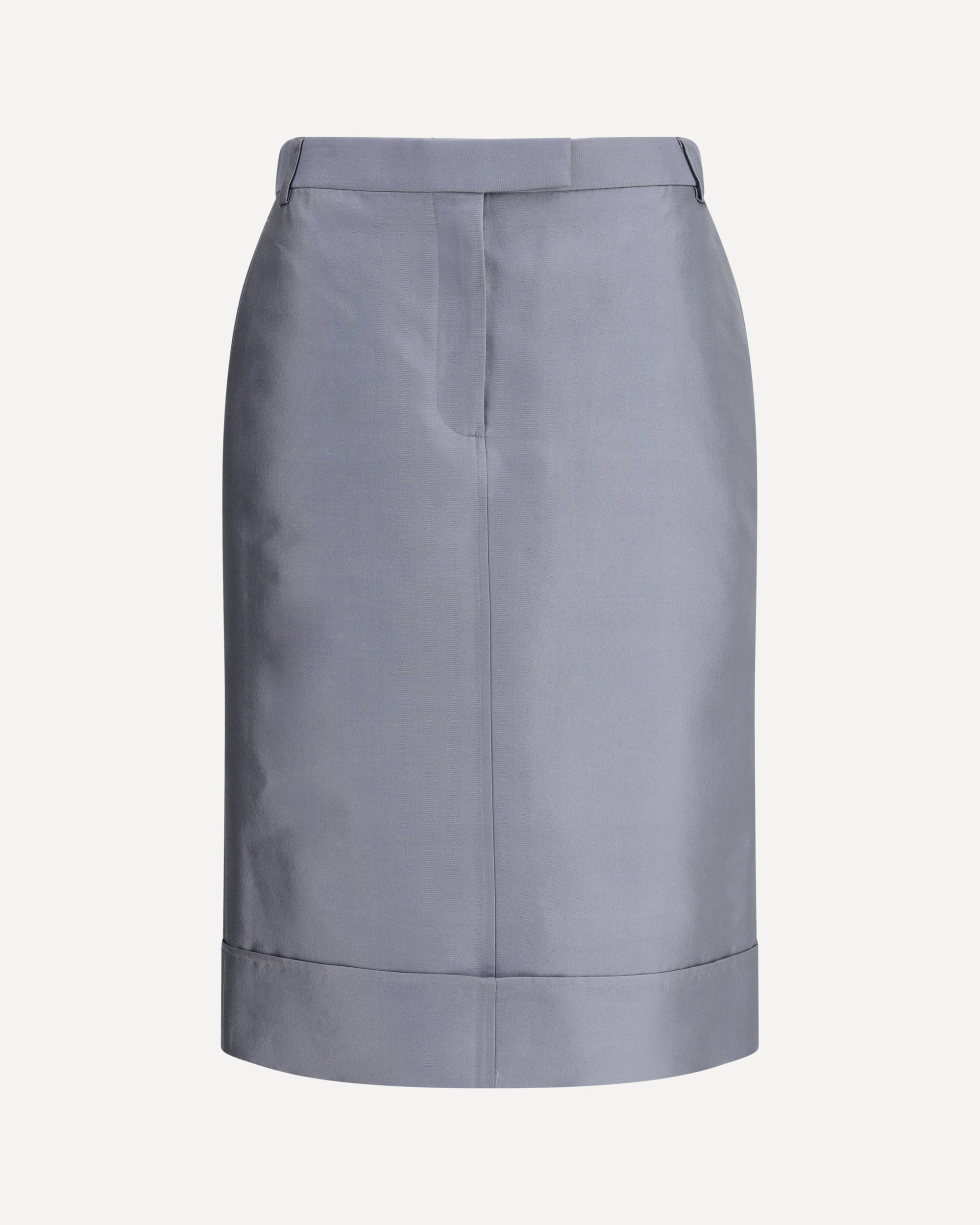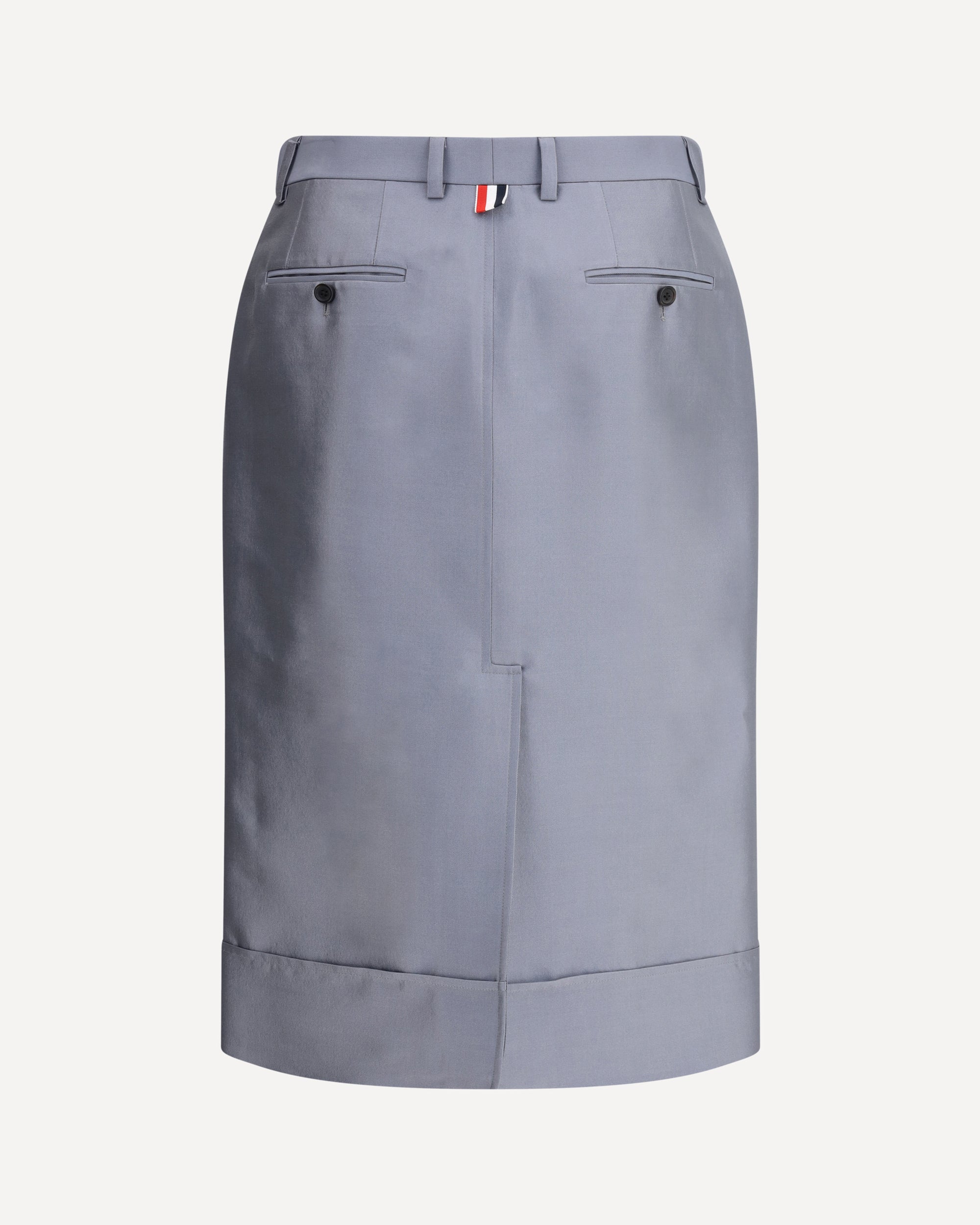 La Gonna midi di Thom Browne unisce eleganza sartoriale e dettagli iconici del brand. Caratterizzata da una chiusura frontale con cerniera e gancio, presenta tasche laterali a filetto e due tasche posteriori, anch’esse a filetto, che ne enfatizzano la costruzione raffinata. Lo spacco sul retro aggiunge un tocco di femminilità e praticità al design, mentre l’orlo con risvolto richiama lo stile distintivo della maison. L’interno è foderato con le iconiche righe verticali, firma inconfondibile di Thom Browne.