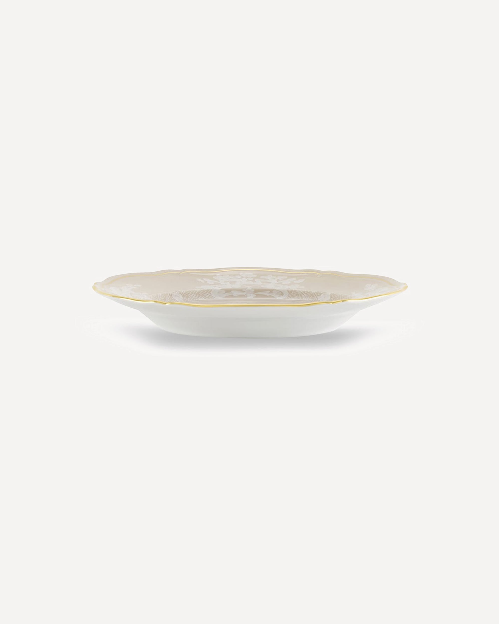 Il Piatto da dessert in porcellana della Collezione Oriente Italiano di Ginori 1735 è un raffinato omaggio all’arte della tavola. Impreziosito da delicati motivi bianchi e da una sottile filettatura dorata, esalta con grazia la sua silhouette regale, portando eleganza in ogni occasione. Perfetto per servire dolci raffinati durante una pausa tè — come macarons, biscotti o piccola pasticceria — si presta anche ad accogliere con stile una selezione di formaggi accompagnati da frutta secca, miele o confetture. In un aperitivo d’autore, si trasforma nel supporto ideale per antipasti gourmet, unendo estetica e versatilità in un unico gesto di ospitalità.
