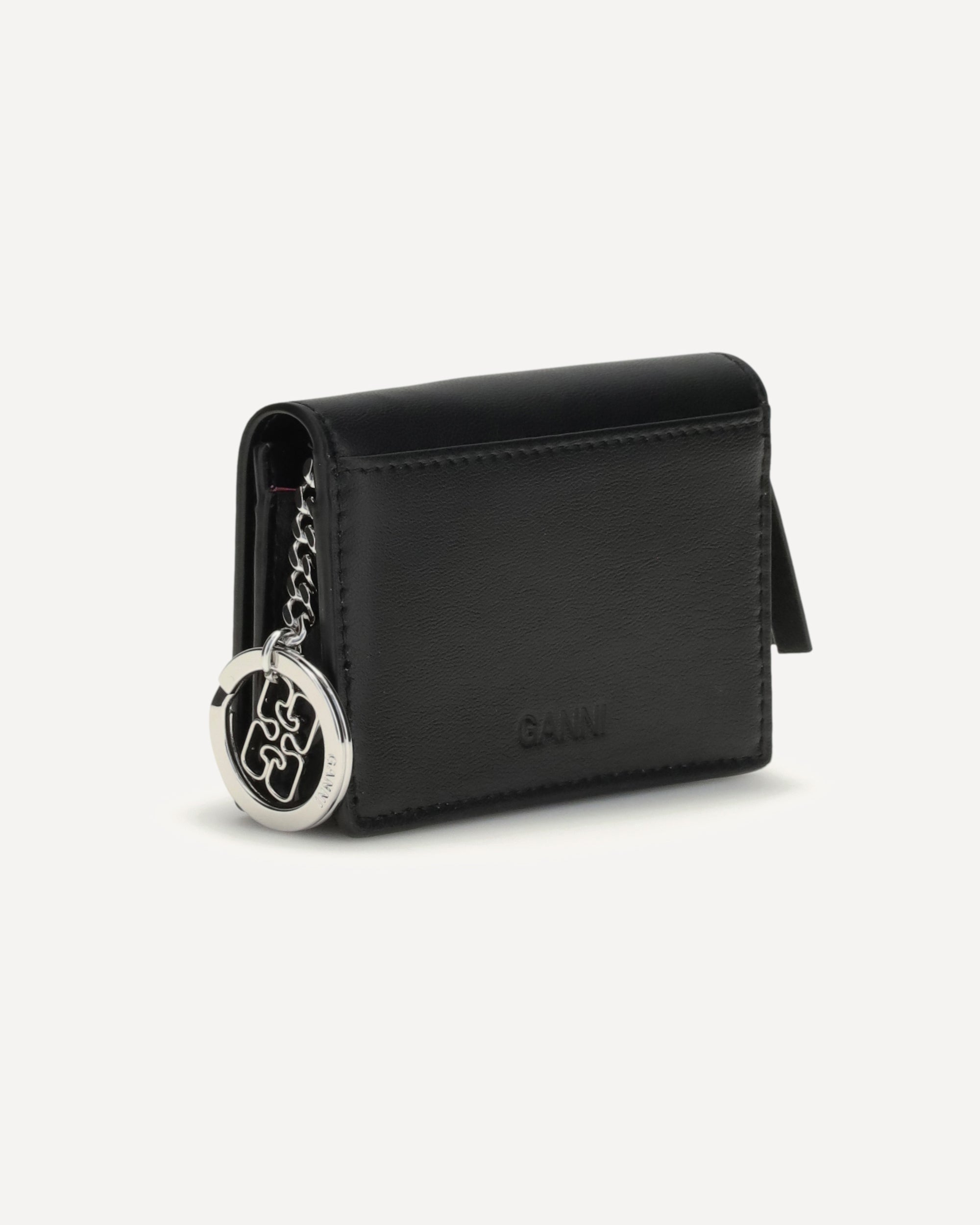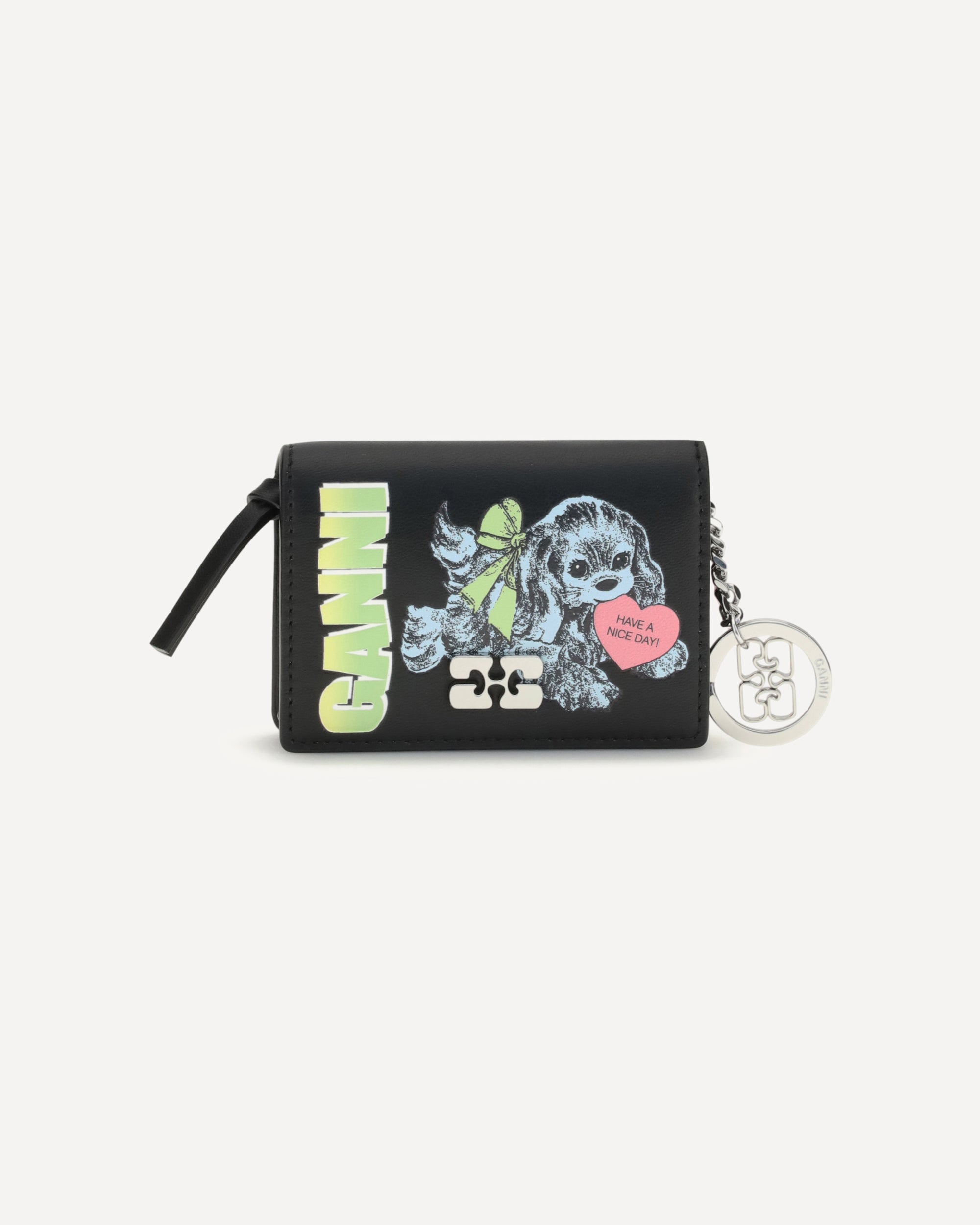 Il portacarte con stampa Puppy di Ganni è un accessorio compatto e originale, decorato con una stampa grafica di un cucciolo che dona un tocco giocoso al design. È arricchito dal logo hardware Ganni Butterfly e da un anello portachiavi color argento con logo inciso. Dotato di scomparti multipli, unisce funzionalità e stile in un formato pratico e tascabile.