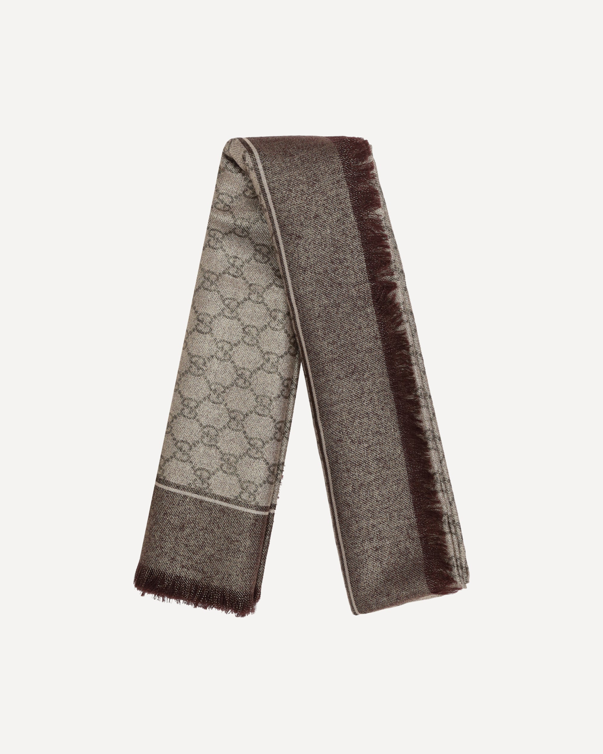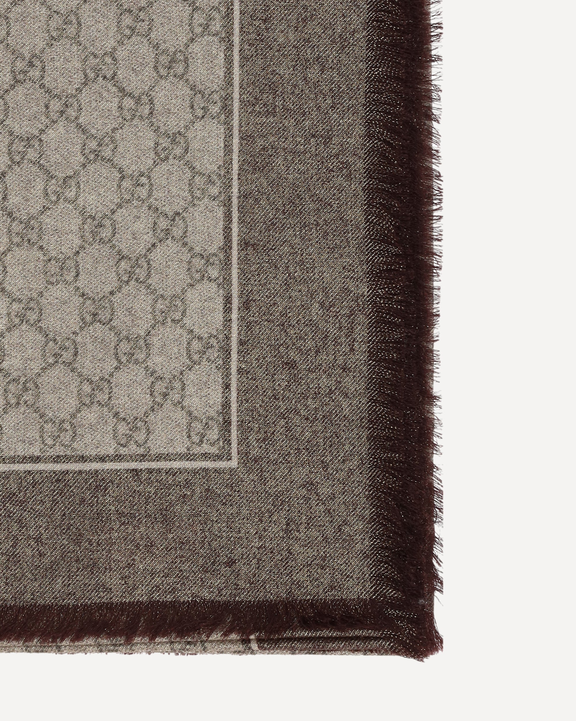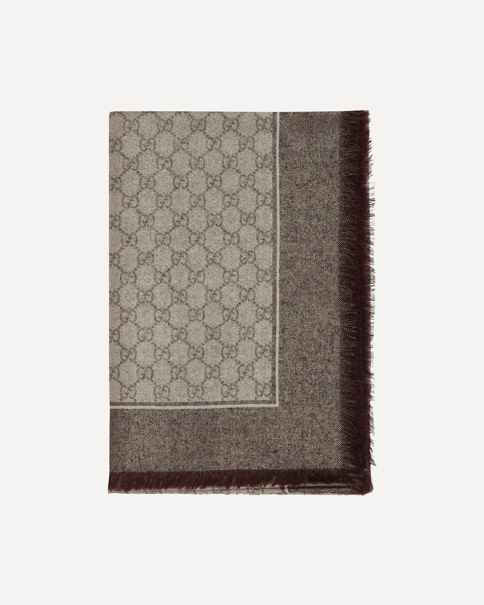 Sciarpa in lana di Gucci, caratterizzata da una fantasia jacquard GG ripetuta su fronte e retro. Gli orli sfrangiati aggiungono un tocco di dettaglio casual ed elegante. Le misure della sciarpa sono 140 x 140 cm, perfetta per essere indossata in vari modi, offrendo sia comfort che stile.