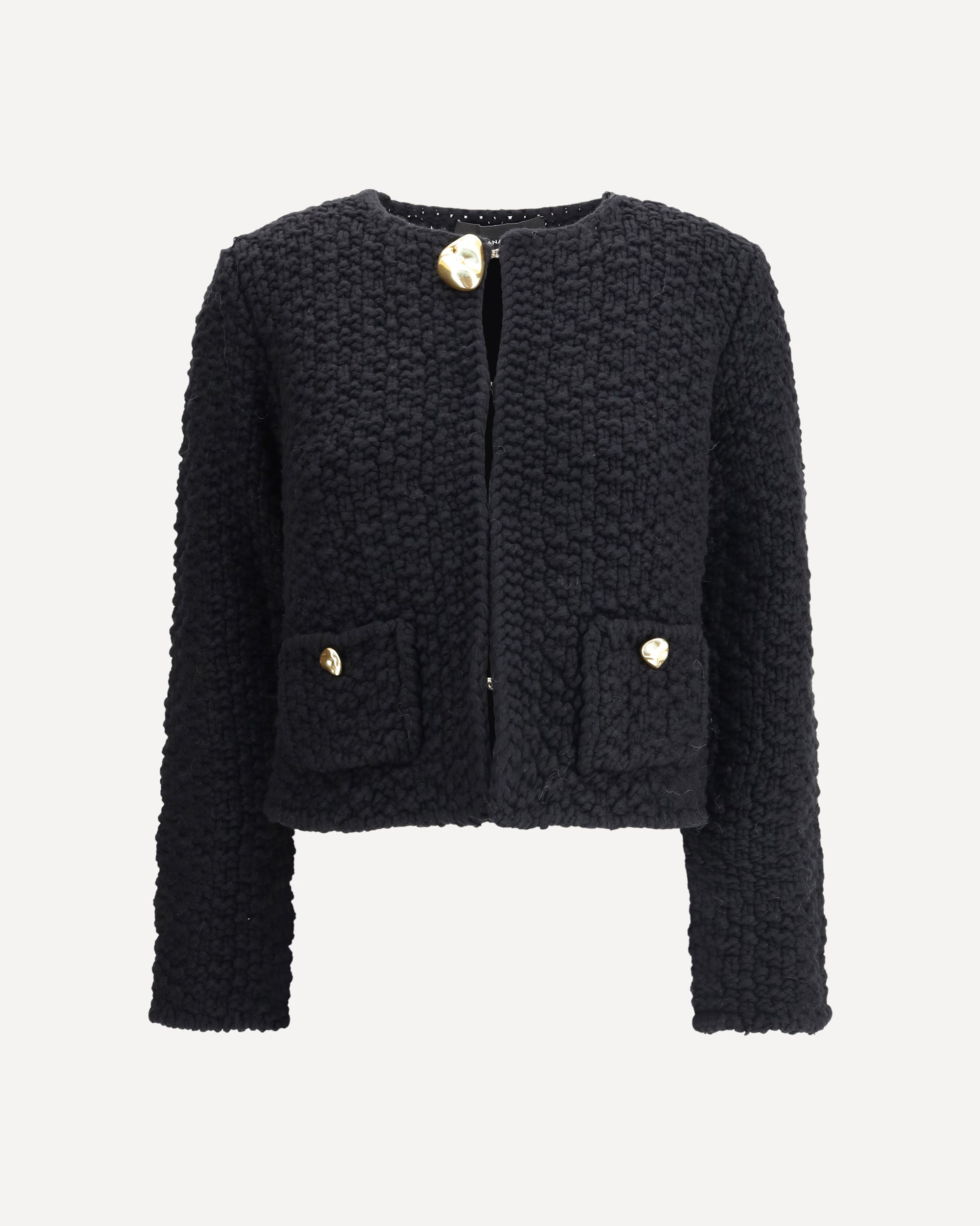 La Giacca in maglia di Fabiana Filippi è un capo elegante e versatile. Presenta un girocollo essenziale, due tasche frontali impreziosite da bottoni dorati e una chiusura discreta con gancetti sul davanti, per un tocco di raffinatezza senza tempo.