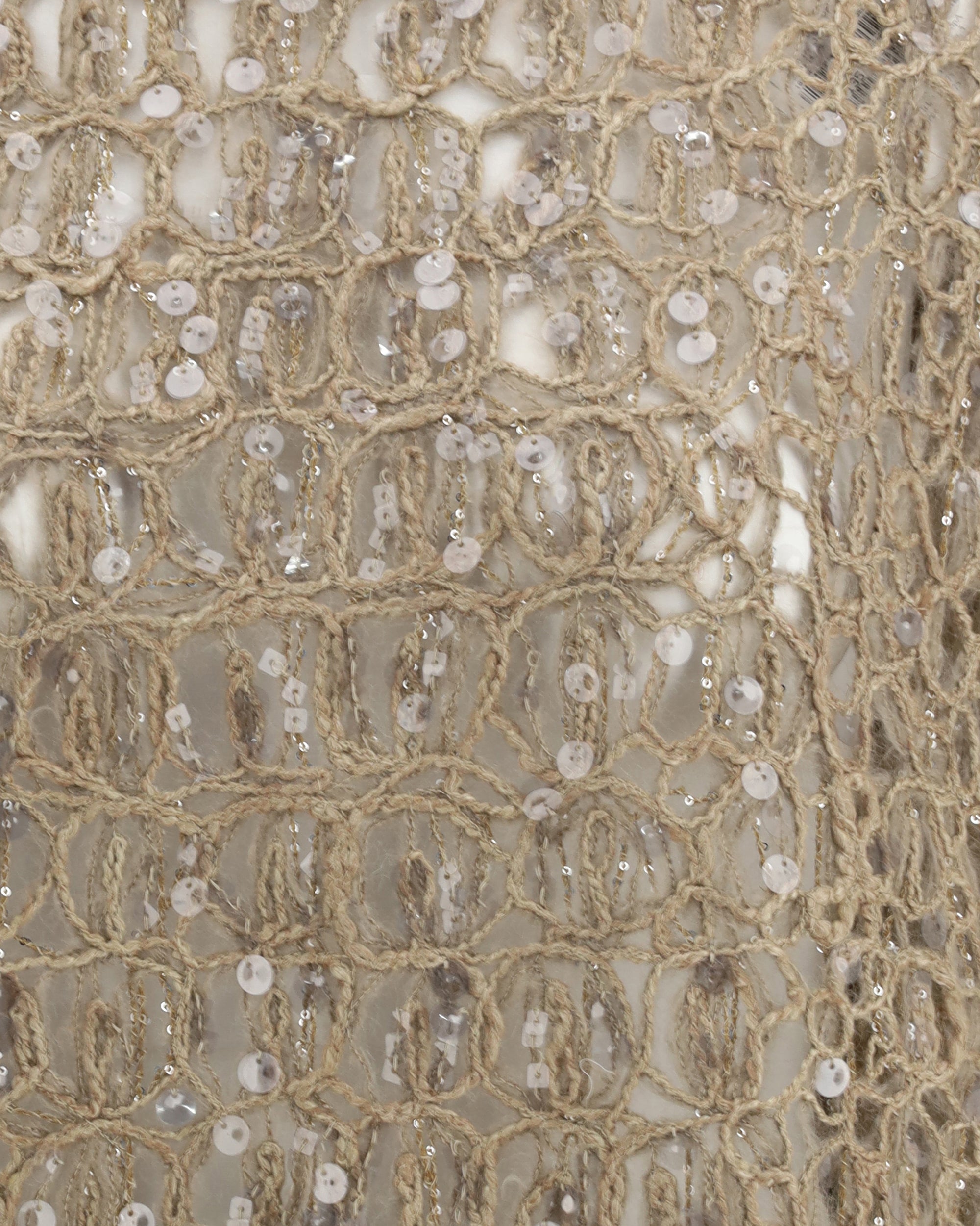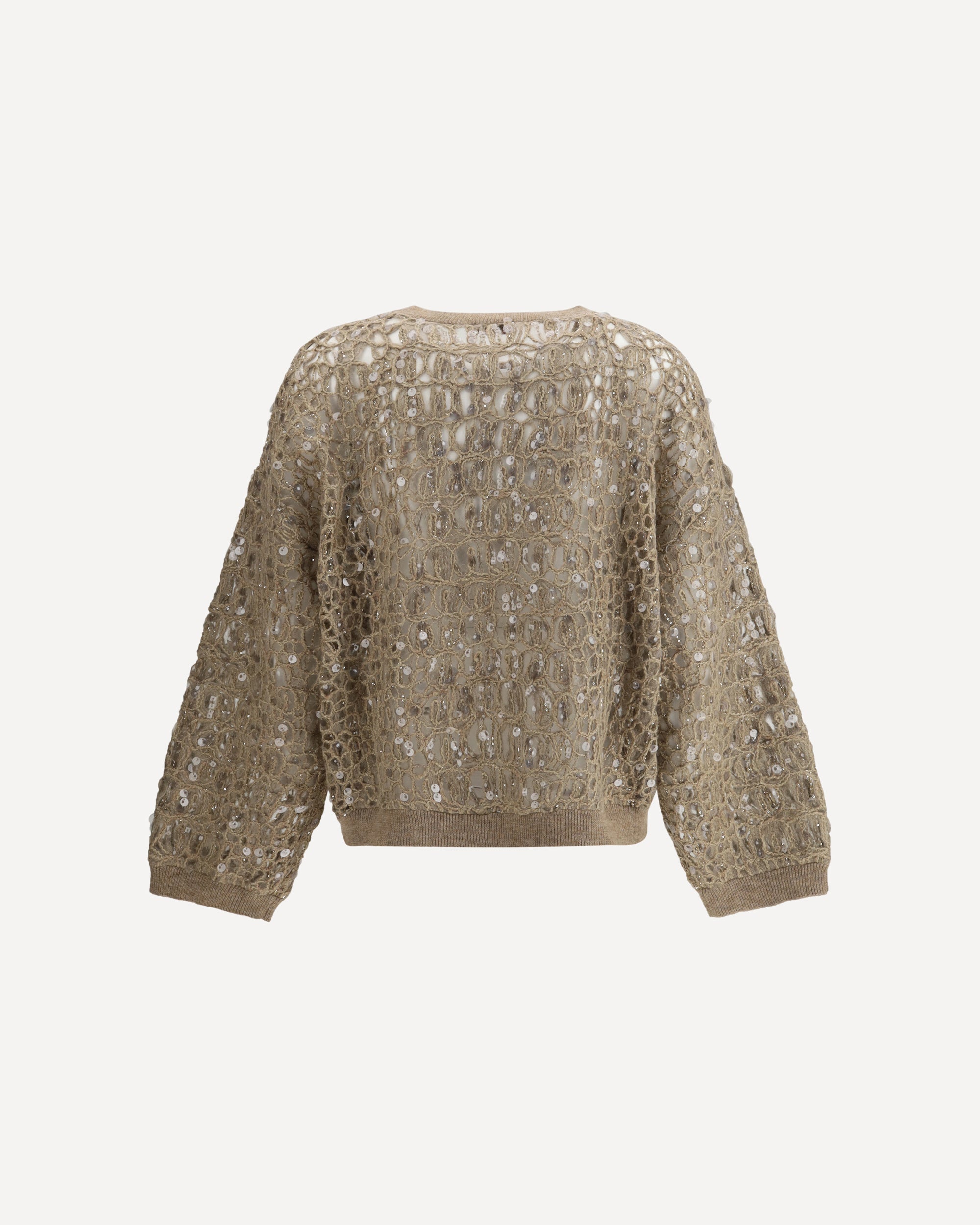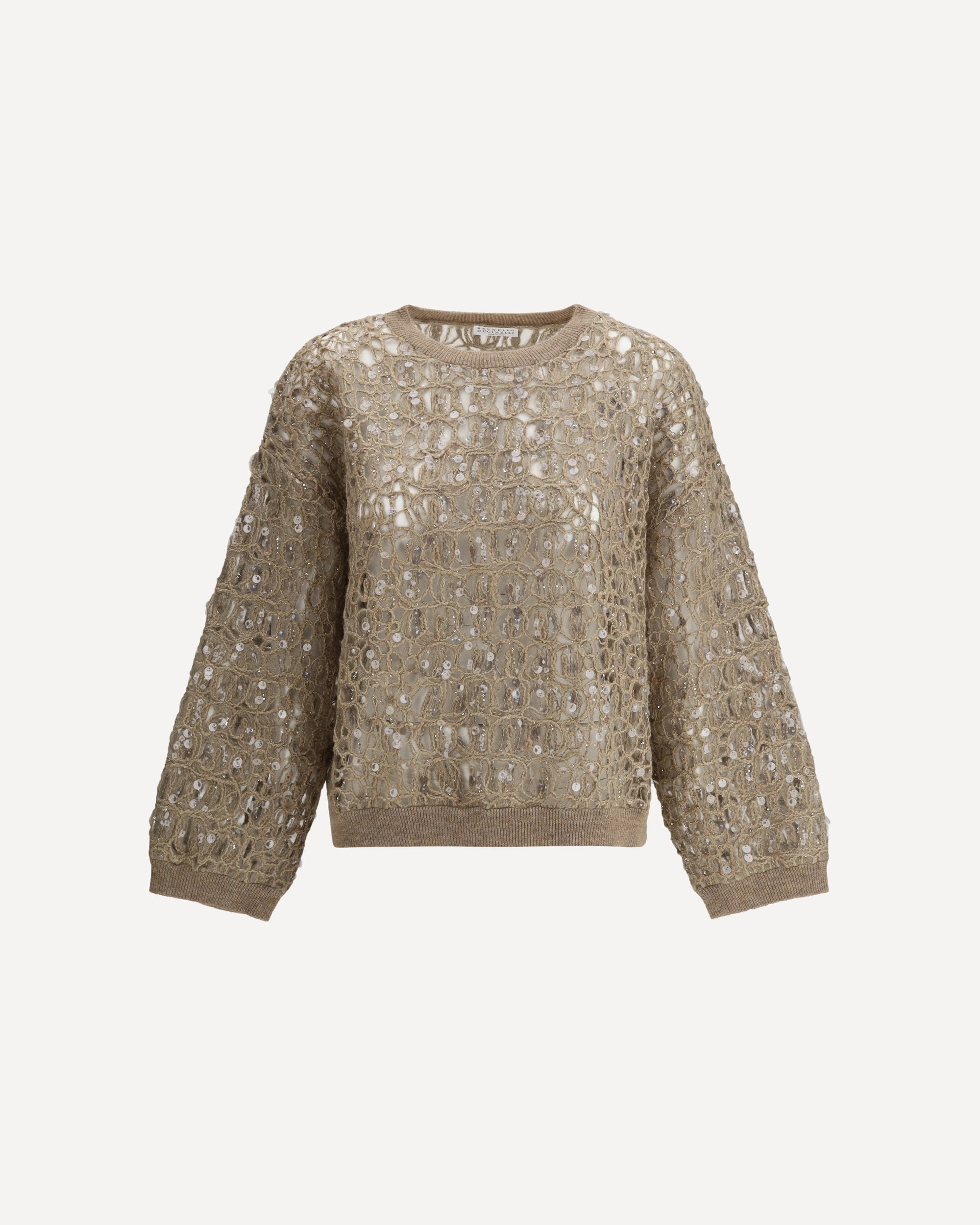 Il Maglione con paillettes di Brunello Cucinelli è un capo raffinato che combina la leggerezza del design traforato con la luminosità delicata delle paillettes trasparenti. Il girocollo, i polsini e l’orlo a costine aggiungono struttura e definizione, per un look elegante e contemporaneo, perfetto da indossare sia di giorno che di sera.