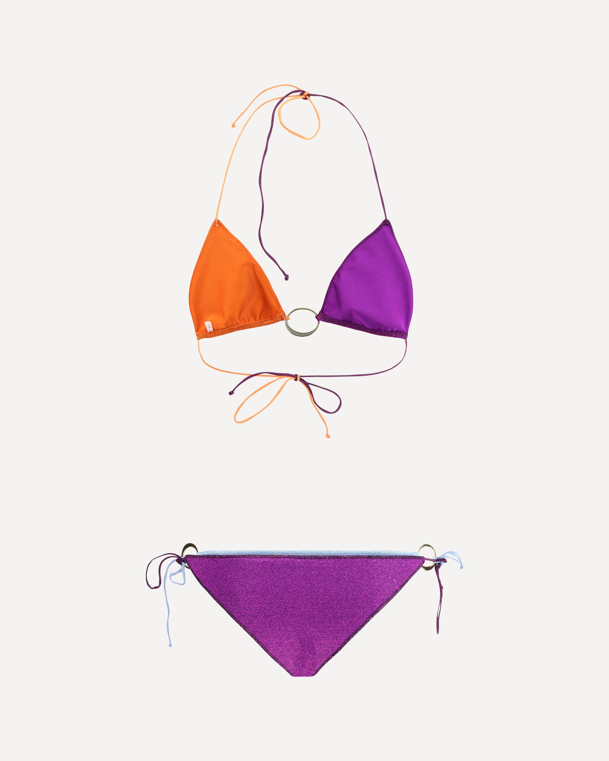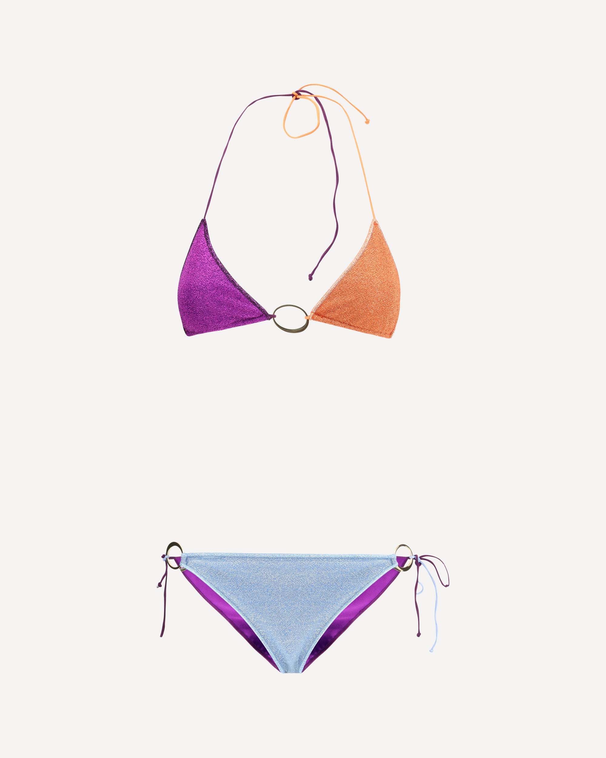 Il Costume da bagno Glazed Lumière di Oséree è un due pezzi dal fascino luminoso e contemporaneo. Il top a triangolo, con chiusura a laccio su collo e schiena, è impreziosito da raffinati dettagli in metallo dorato. Lo slip a vita media con laccetti laterali completa il design, realizzato in tessuto lamé per un effetto brillante e sofisticato.