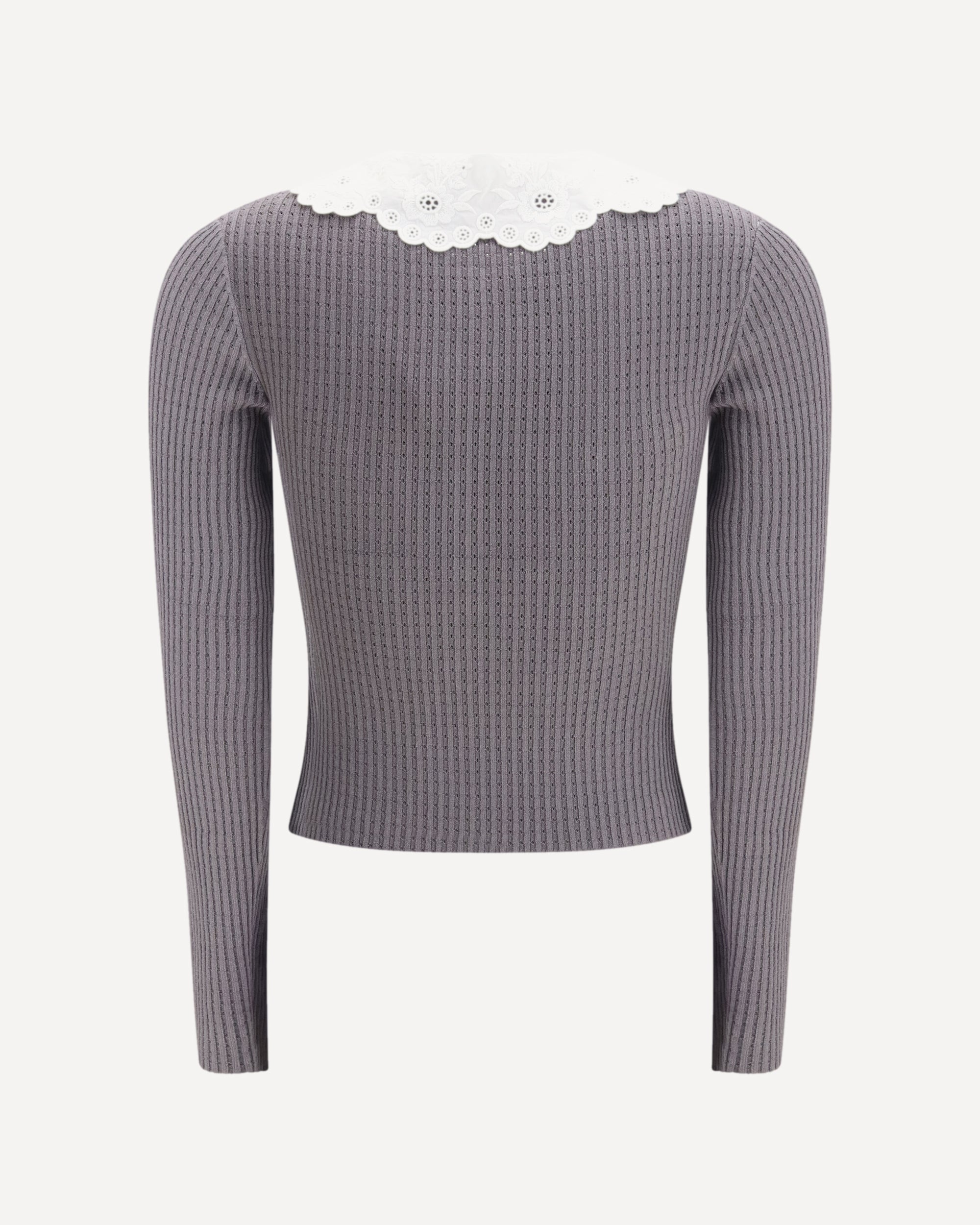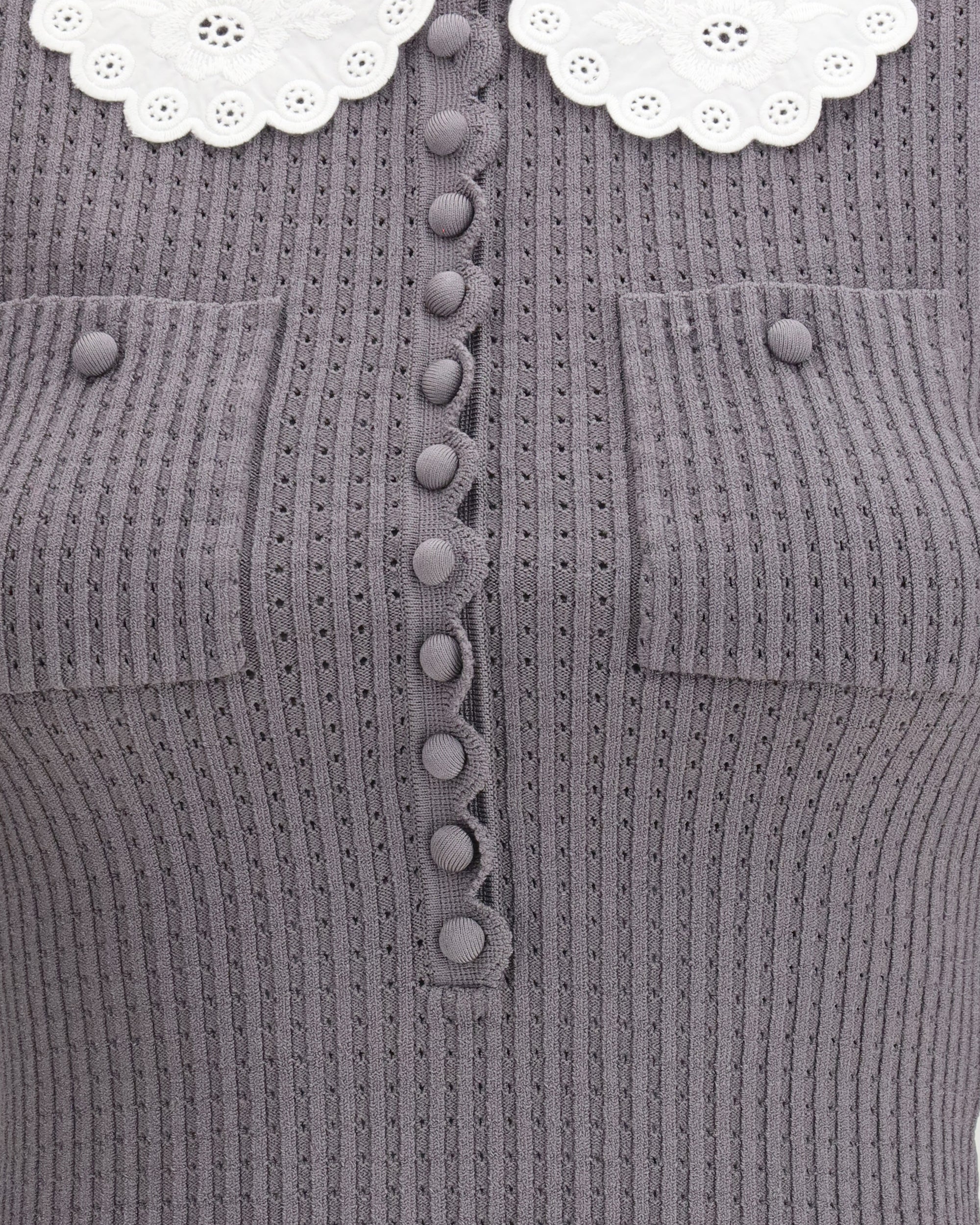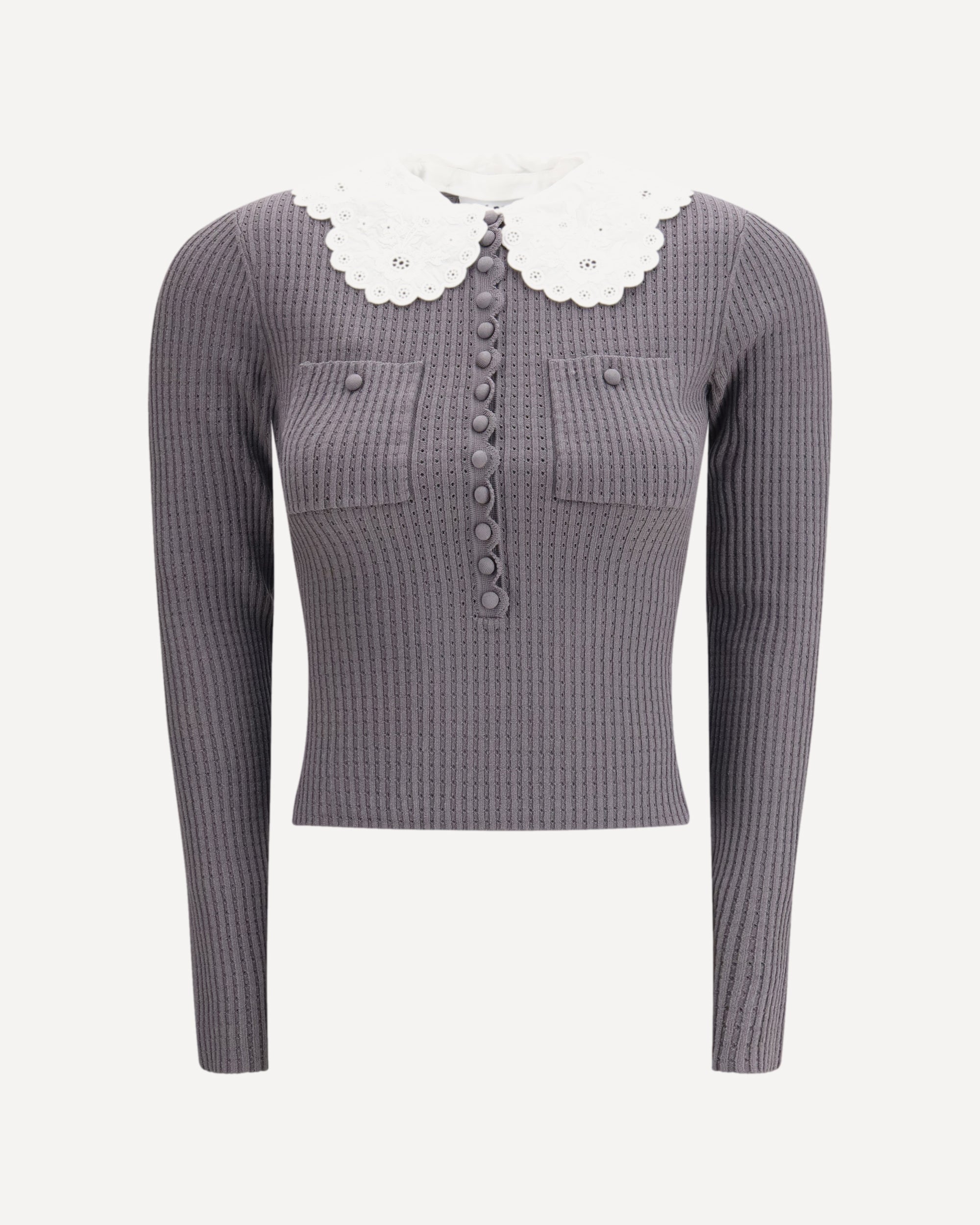 Il Top in maglia con colletto in pizzo di Self Portrait è caratterizzato da una raffinata lavorazione pointelle grigia, impreziosita da un colletto a contrasto in broderie anglaise di cotone che aggiunge un tocco romantico e distintivo. La silhouette aderente valorizza la figura, mentre il tessuto elasticizzato assicura comfort e vestibilità fedele alla taglia. La chiusura frontale con bottoni completa il design, rendendo questo capo ideale da abbinare a jeans ampi per un gioco di proporzioni contemporaneo, perfetto anche per un look da sera informale.