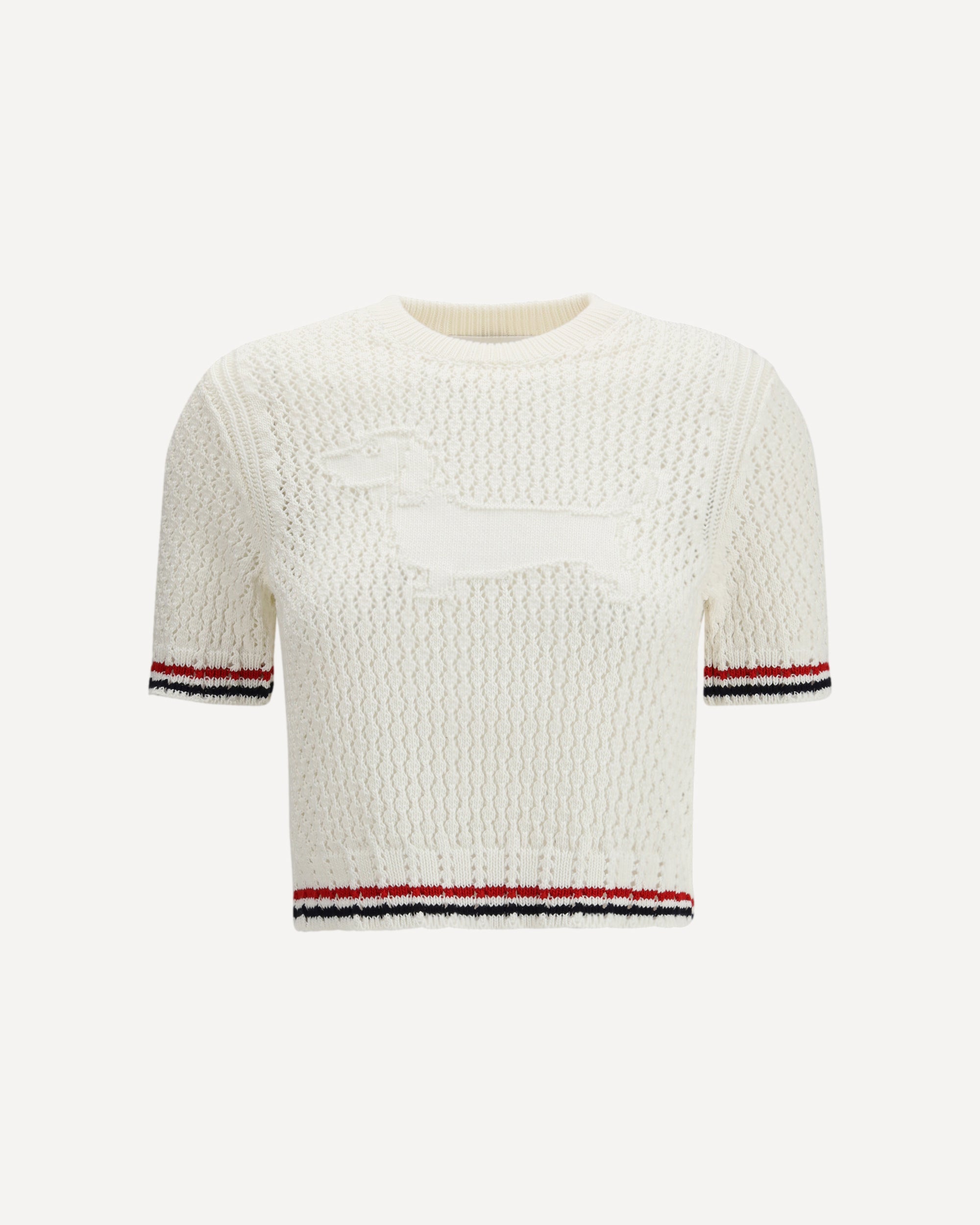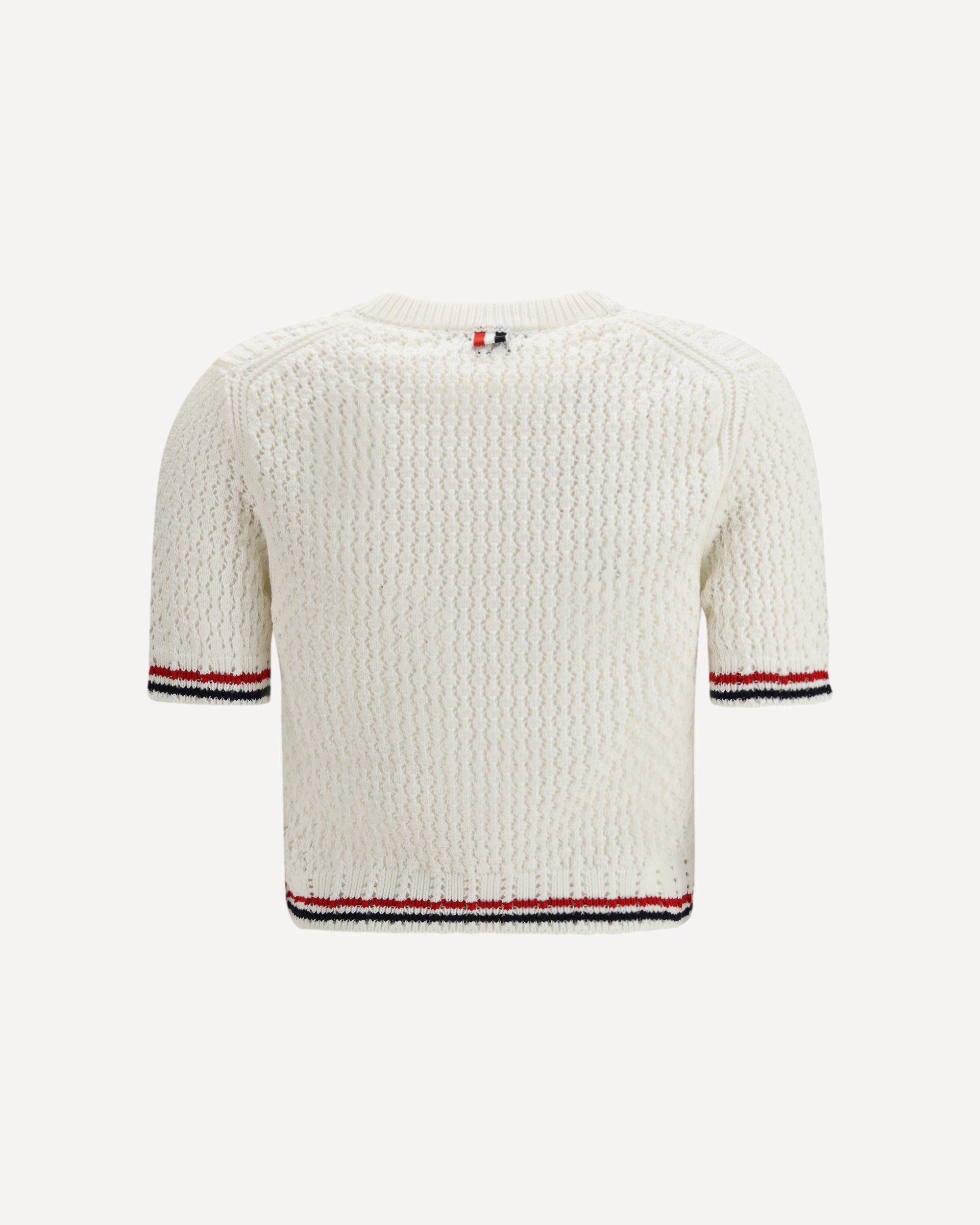 La T-shirt Hector di Thom Browne è realizzata con una raffinata lavorazione traforata che disegna l’iconico motivo del cane Hector sul davanti. Presenta girocollo, maniche corte e l’inconfondibile rifinitura a righe Thom Browne, che aggiunge un tocco distintivo al design essenziale.