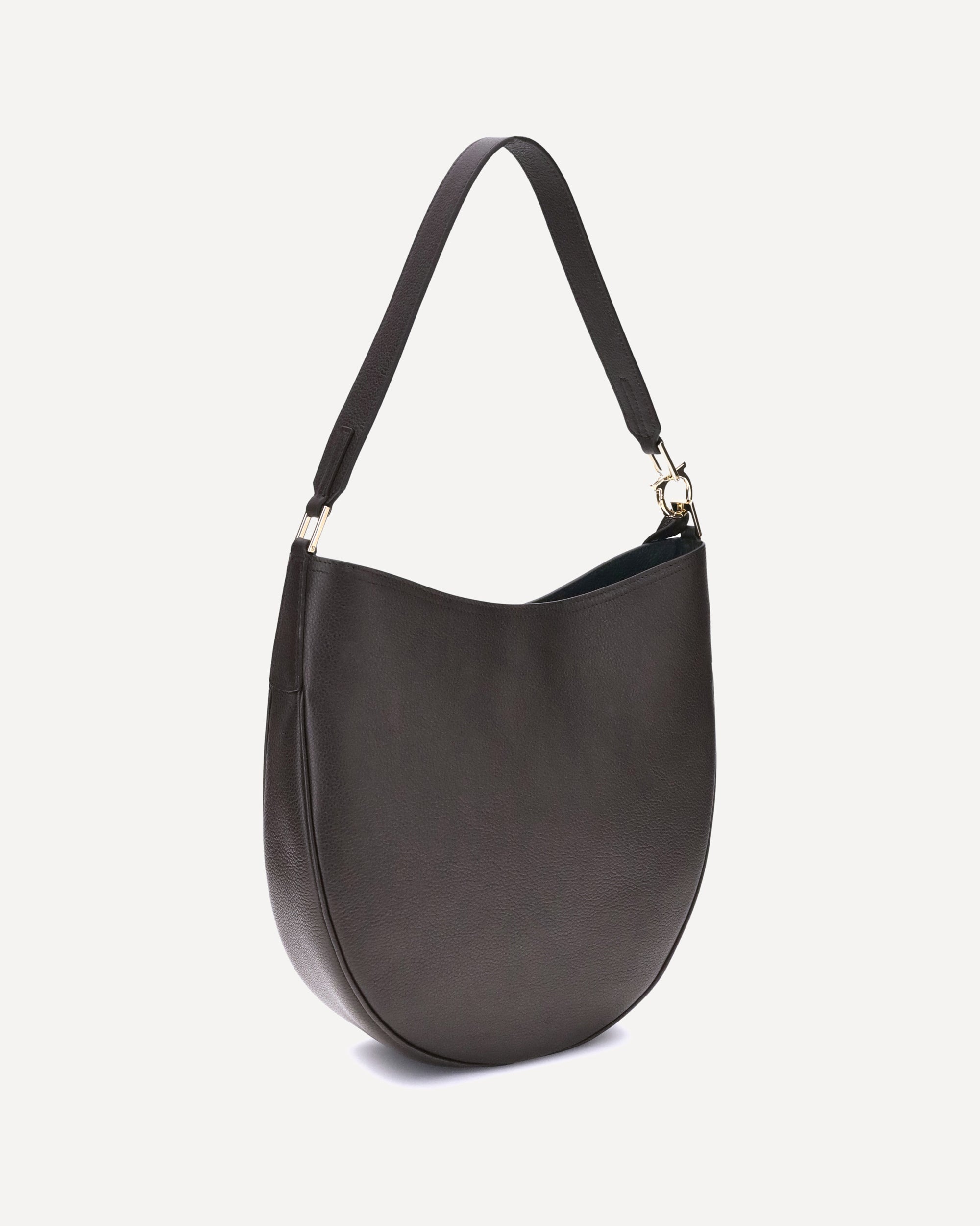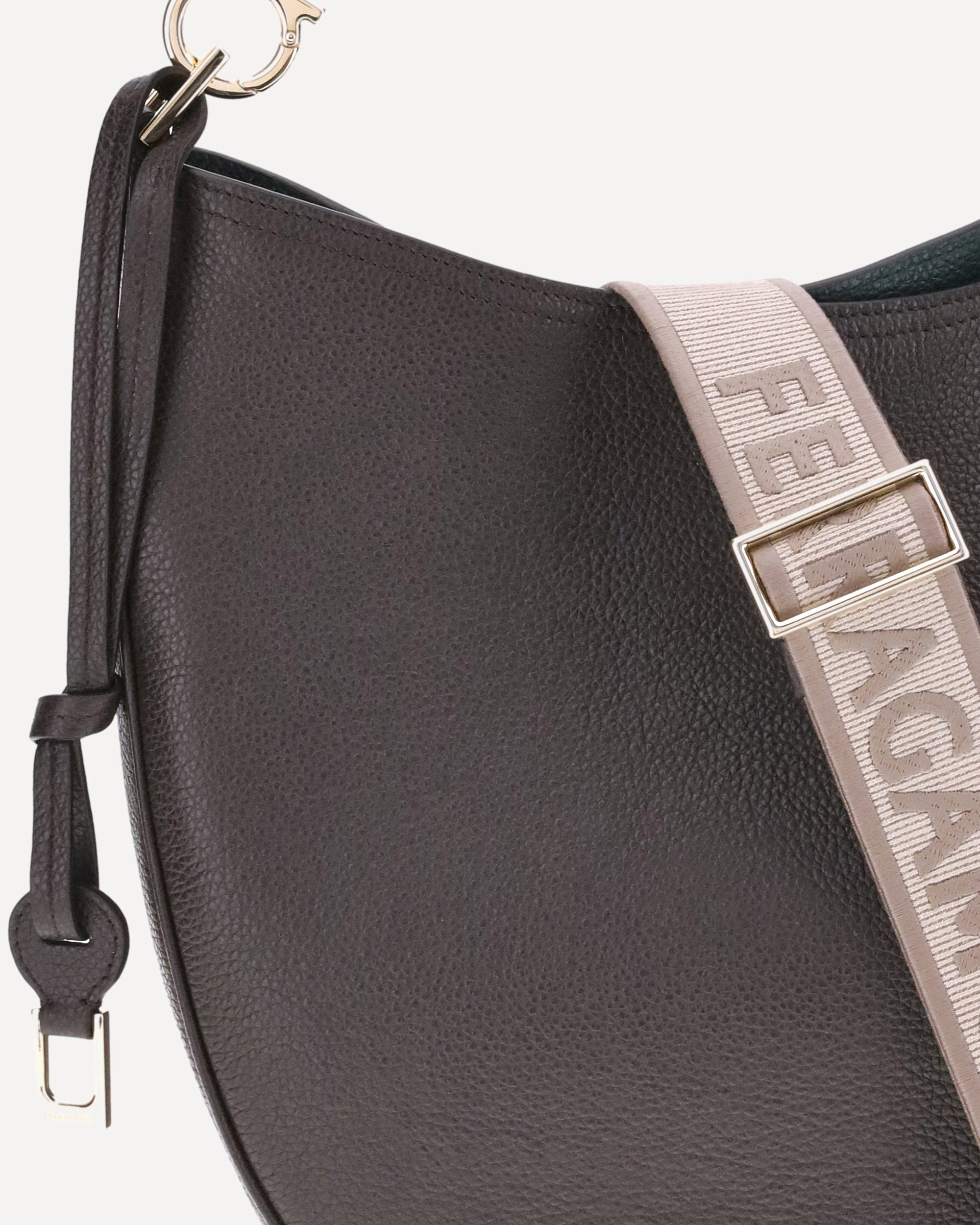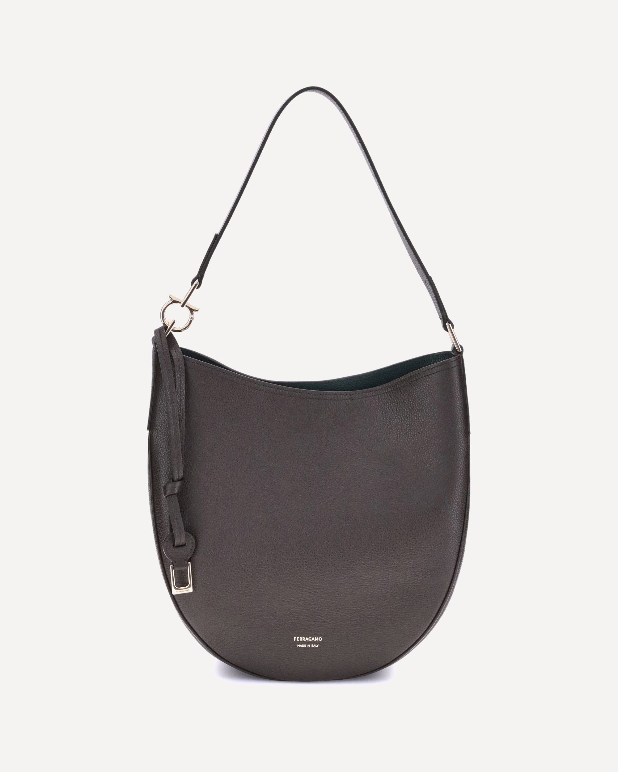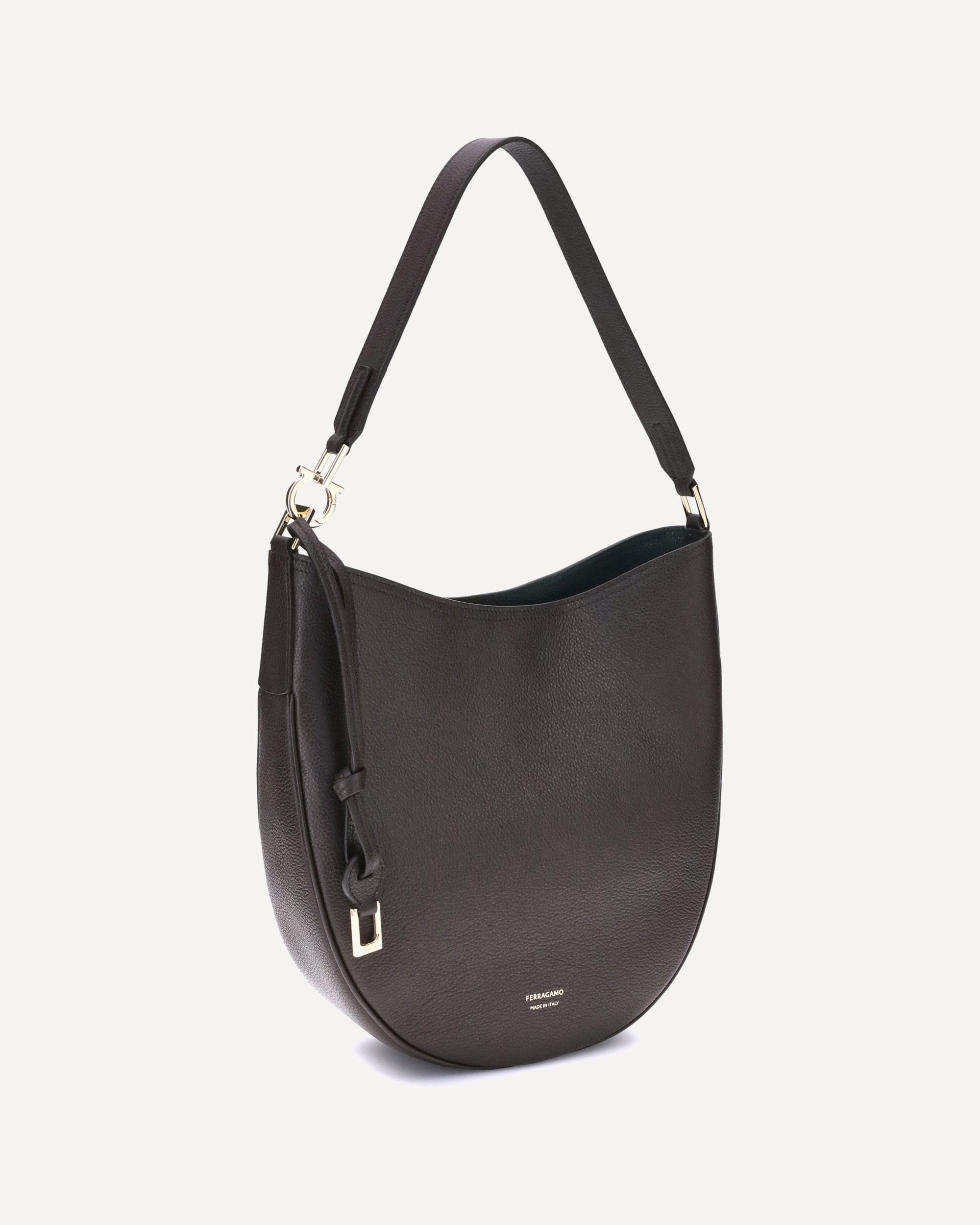 La Borsa a Spalla North-South di Ferragamo, nella sua versione media, unisce eleganza e praticità. Realizzata in morbido vitello martellato, si adagia armoniosamente sul corpo, garantendo comfort. L'apertura è assicurata da una zip metallica. Un tocco distintivo è dato dalla possibilità di estendere la tracolla jacquard personalizzata – un'iconica firma del brand – attaccando un cordoncino in pelle con ciondolo dorato. Infine, il logo del brand è stampato a pressione sul fronte, sigillando con discrezione l'autenticità e lo stile Ferragamo.