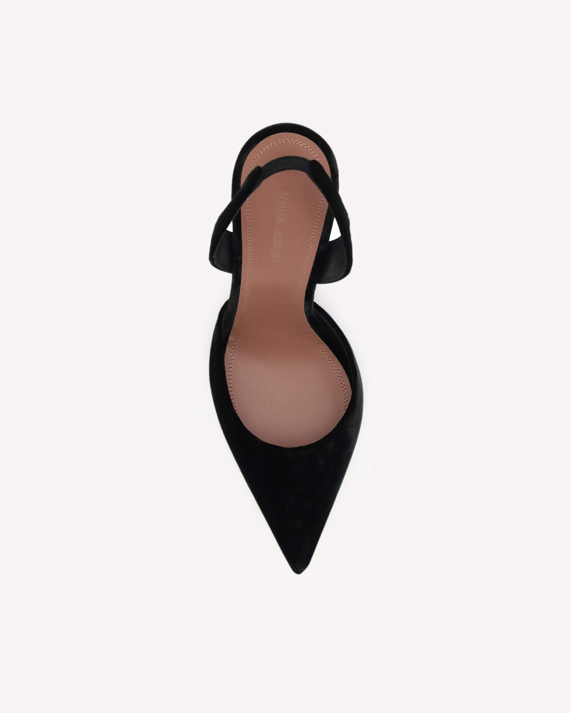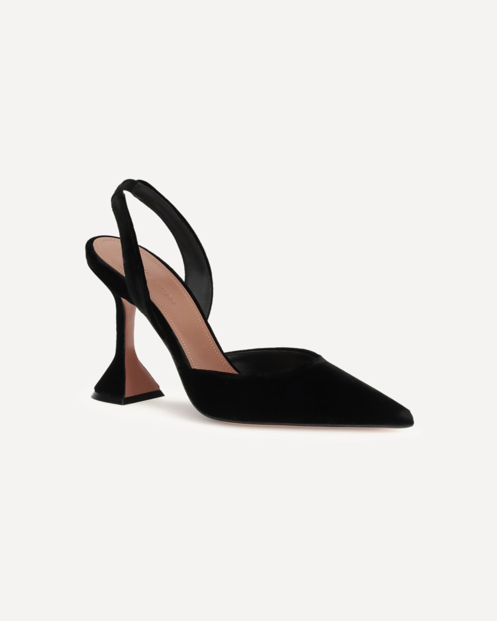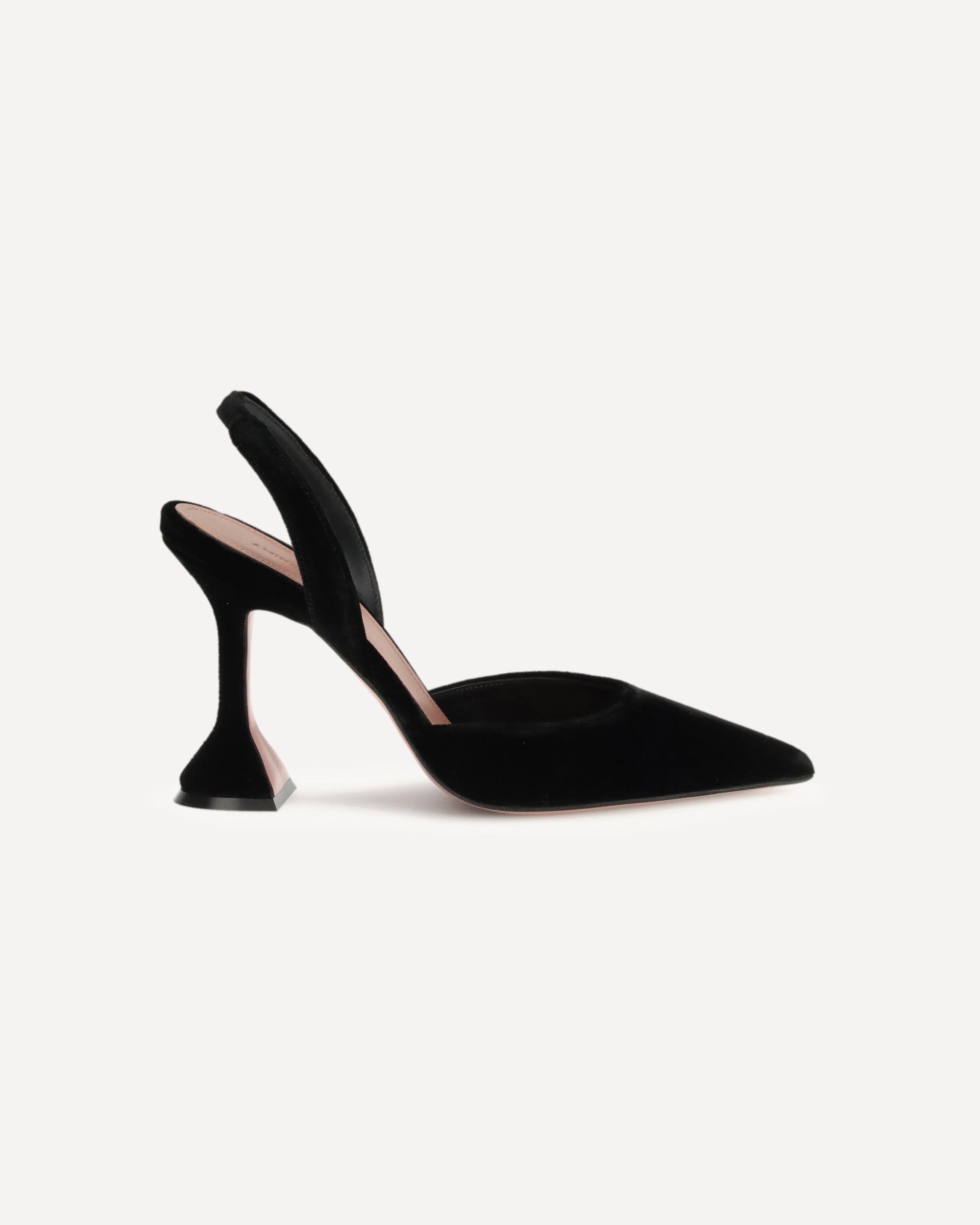 Le Décolleté slingback in velluto di Amina Muaddi si distinguono per la loro punta affusolata e la finitura in velluto, che dona un tocco di lusso e raffinatezza. Il tacco scolpito dal design unico, firma distintiva della maison, aggiunge un elemento moderno e sofisticato. Il cinturino slingback completa il modello, garantendo una calzata elegante e sicura.