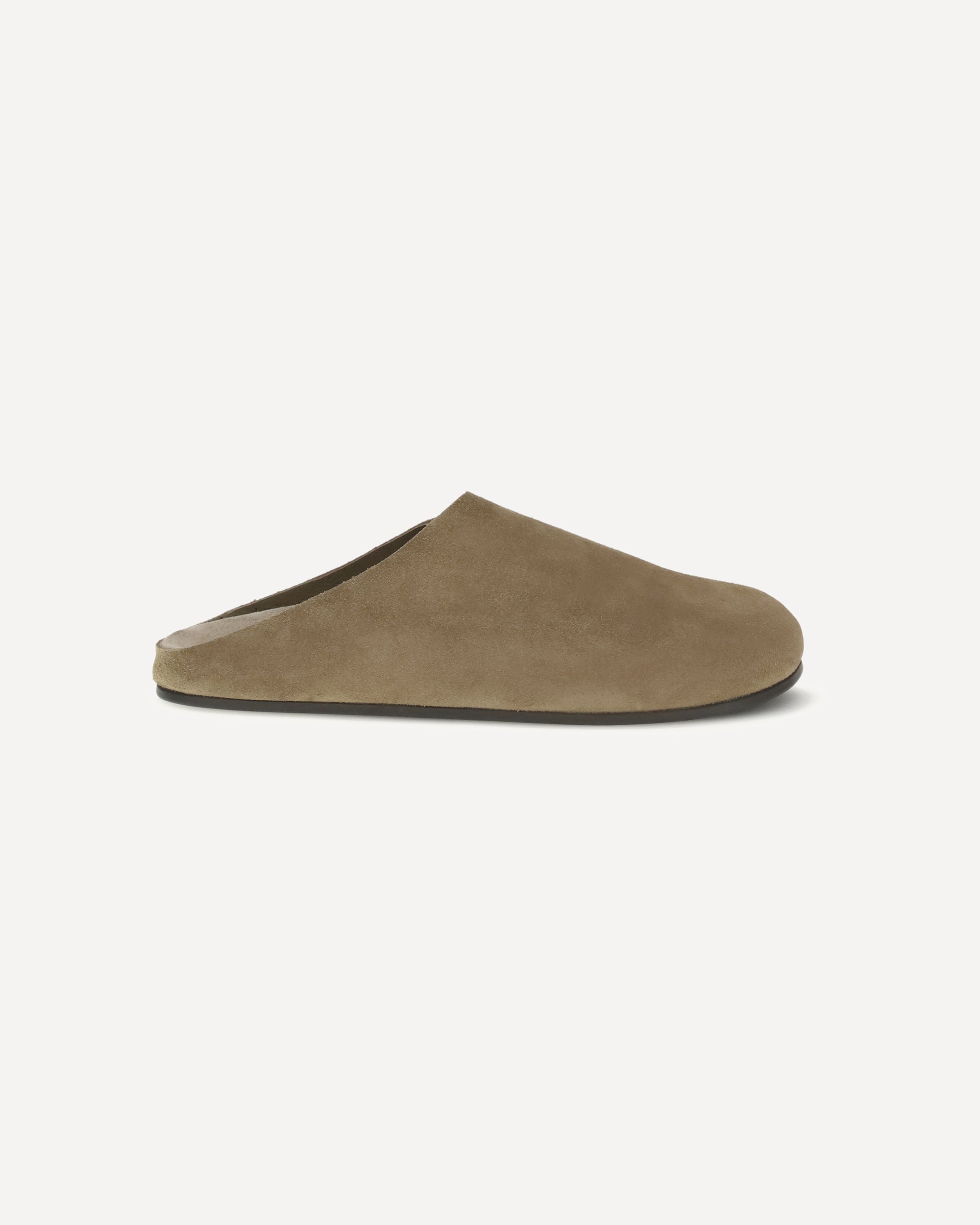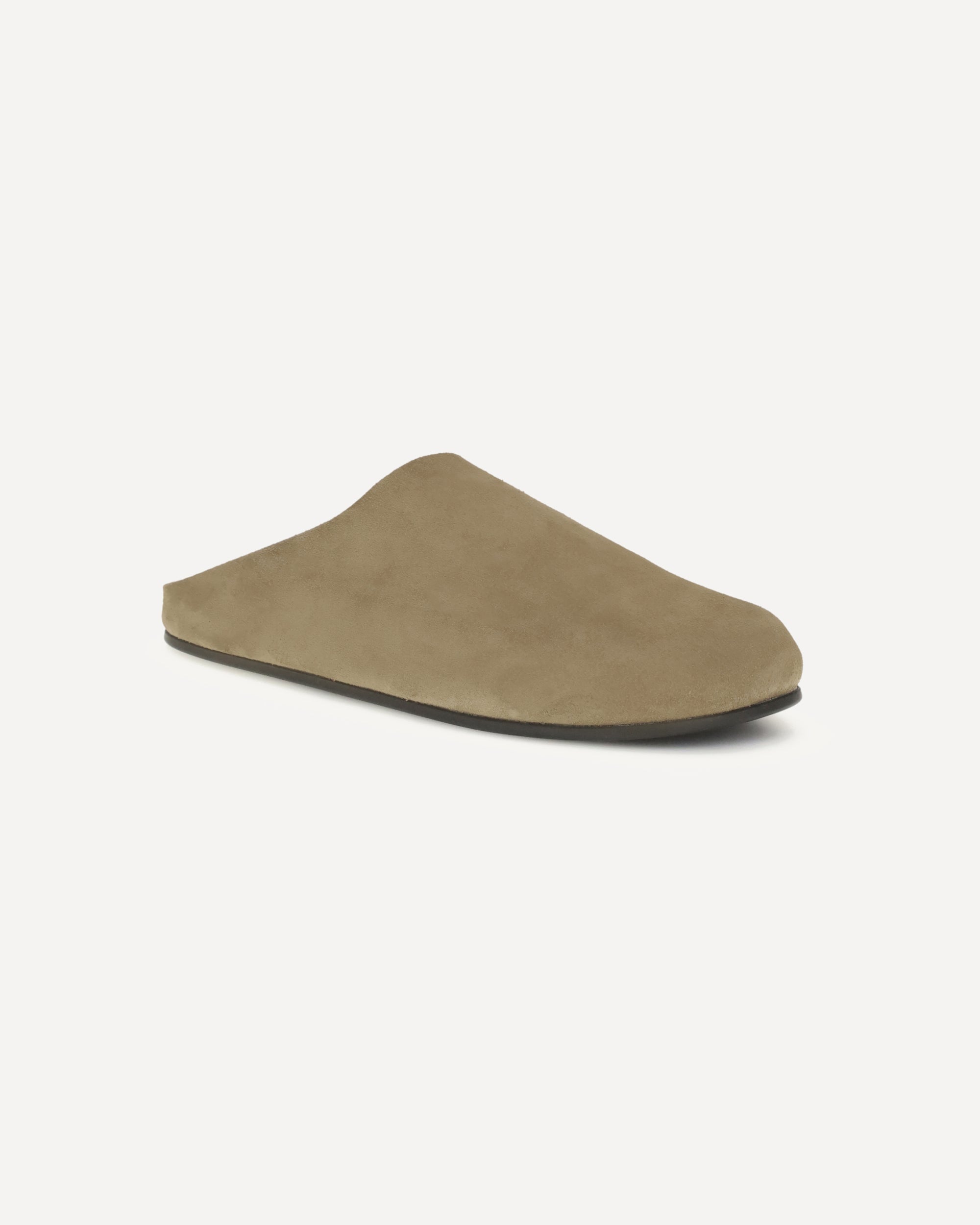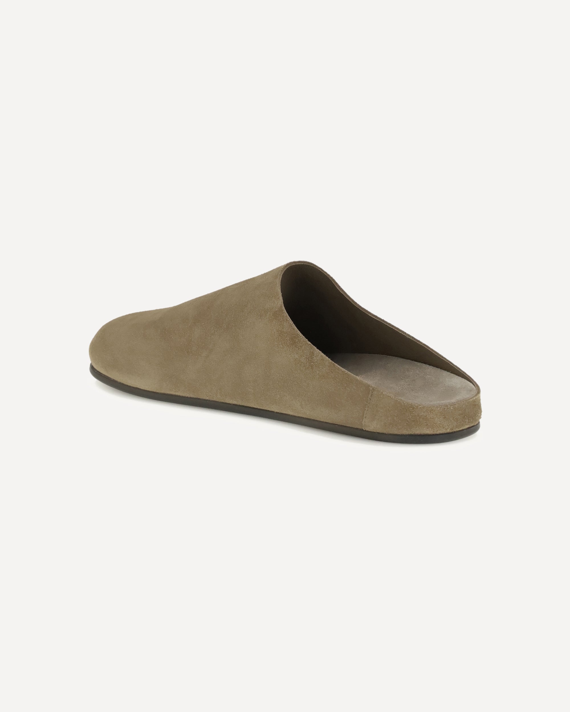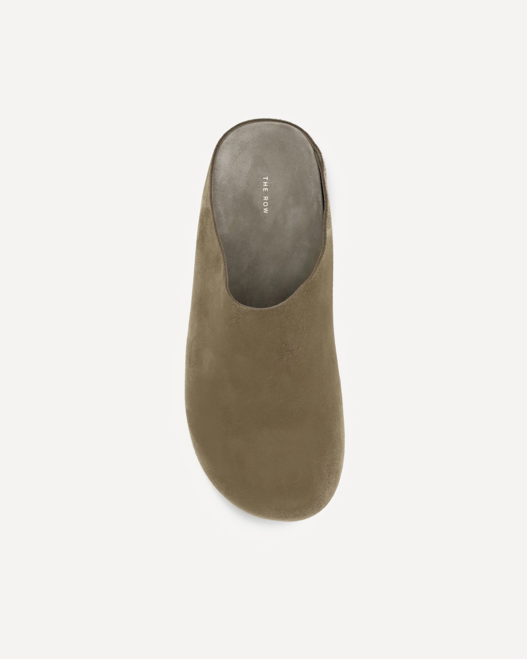 Le Mules Hudson in pelle scamosciata di The Row incarnano l’essenzialità sofisticata del brand, con un design pulito e una vestibilità pensata per il comfort quotidiano. Realizzate in pelle scamosciata naturale, si distinguono per la linea slip-on, la punta rotonda e il plantare sagomato che segue delicatamente la forma del piede. La suola in gomma completa il modello, assicurando stabilità e discrezione a ogni passo.