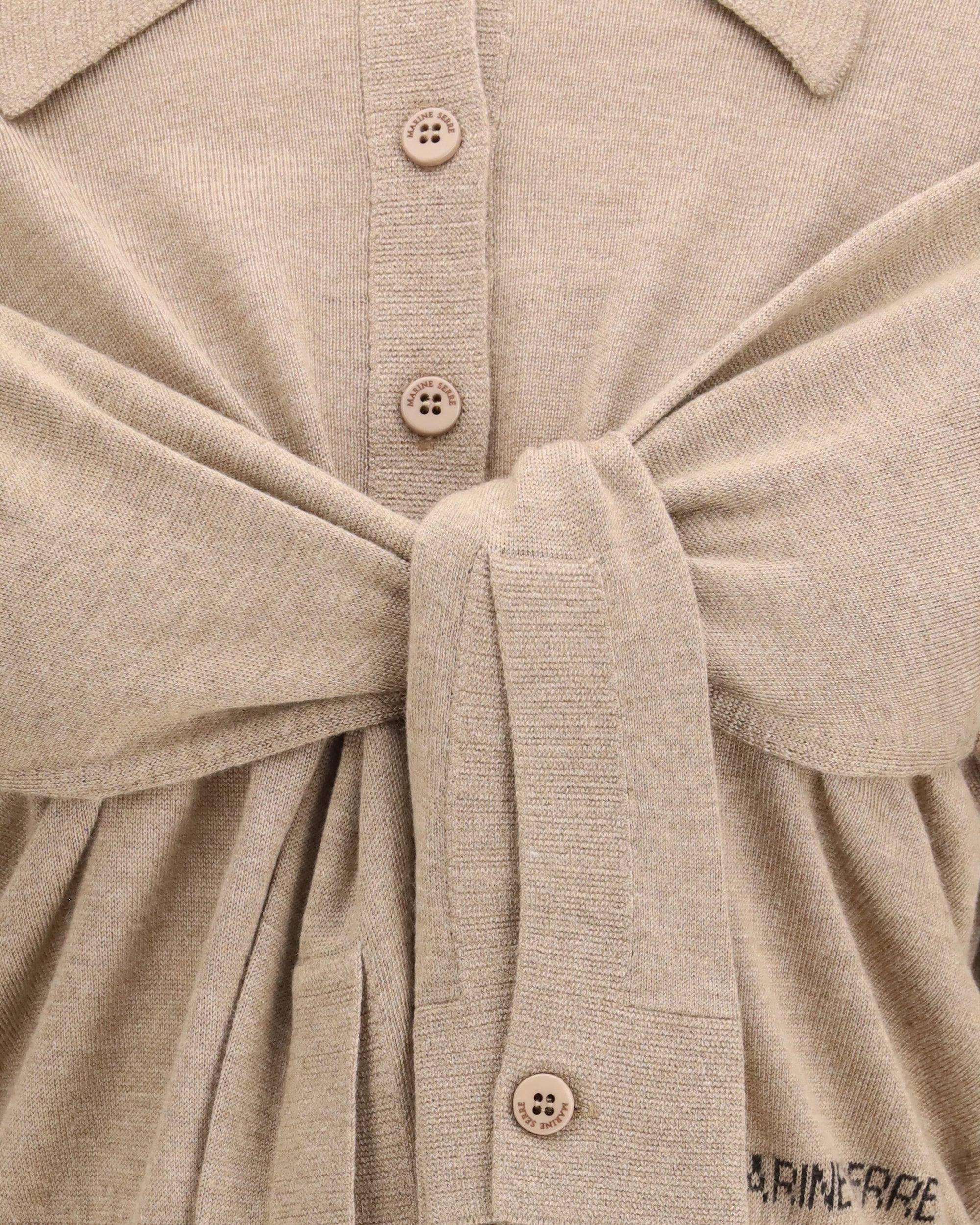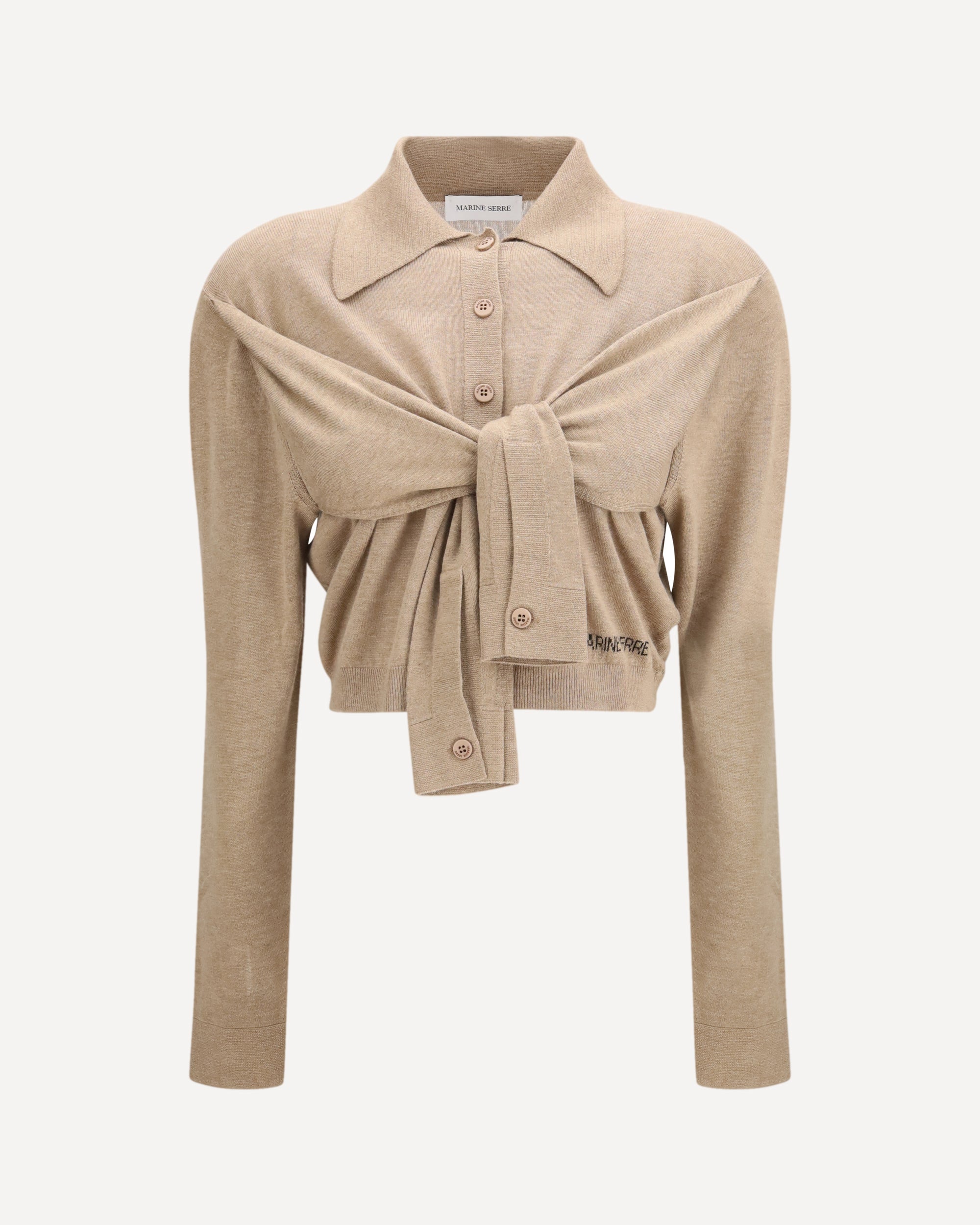 Il Cardigan Wrapped hybrid di Marine Serre interpreta l’estetica sperimentale della maison attraverso un design che unisce elementi sartoriali e dettagli funzionali. Realizzato in maglia, presenta una costruzione avvolgente con chiusura frontale annodata, colletto strutturato e abbottonatura che definisce la silhouette. Le maniche lunghe completano un modello che fonde comfort e innovazione, perfetto per aggiungere un tocco contemporaneo al guardaroba quotidiano.