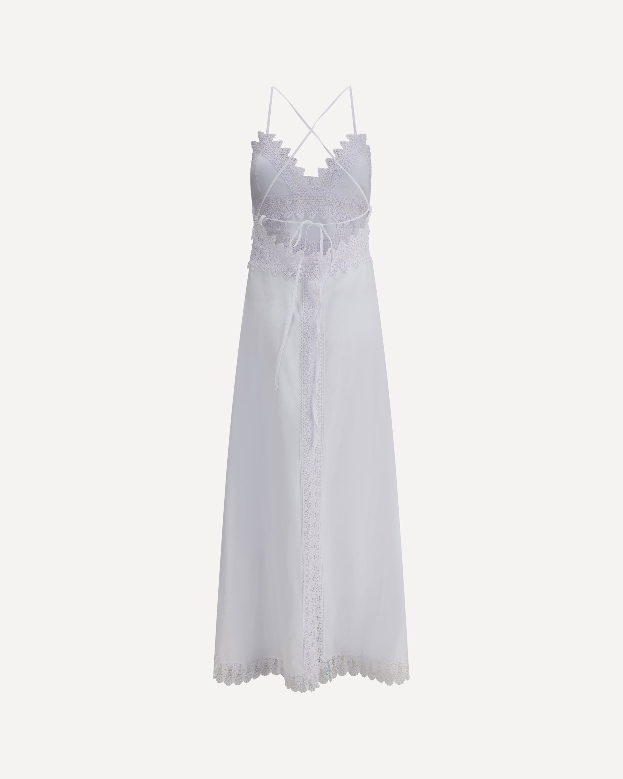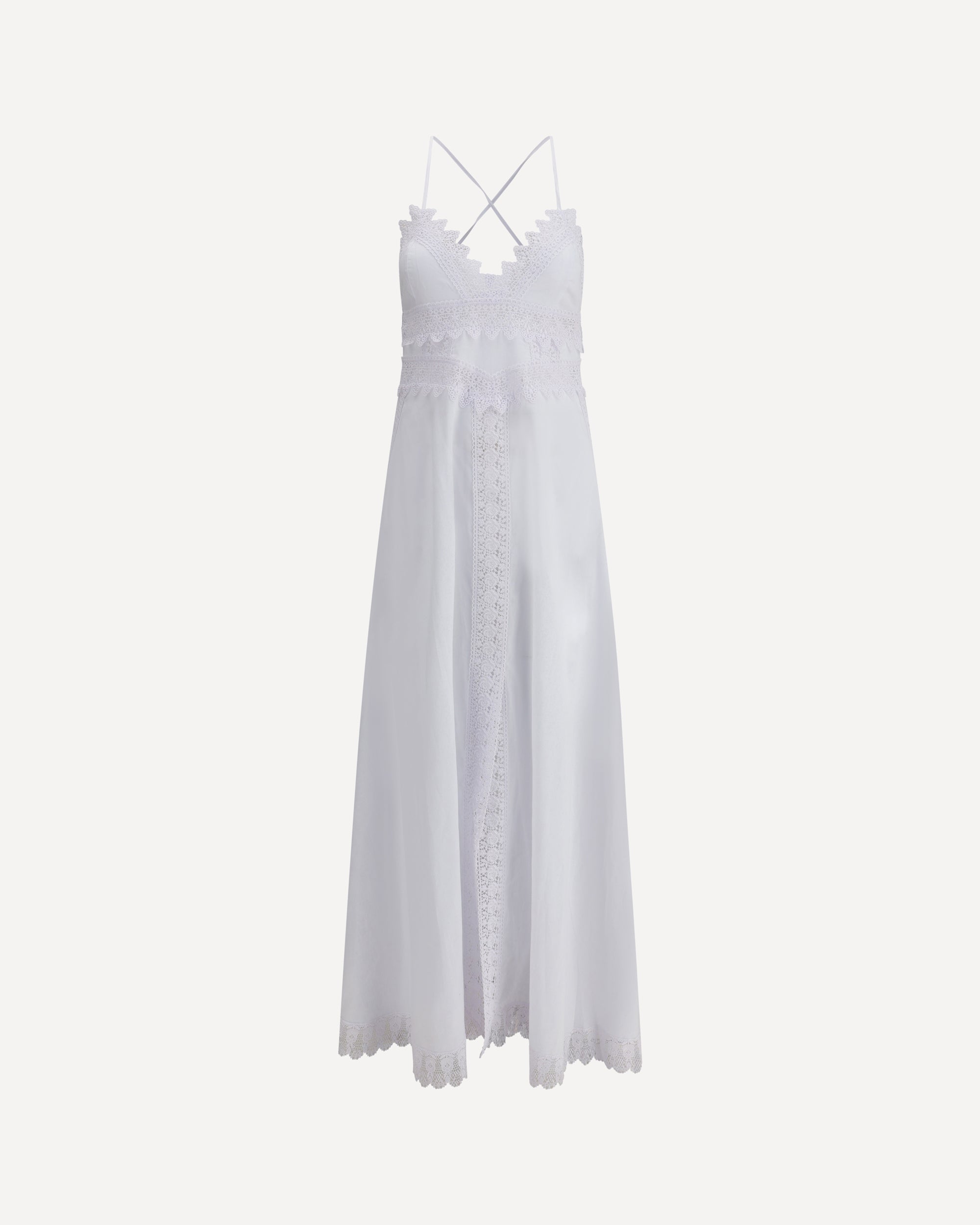 L'Abito Imagen in cotone di Charo Ruiz è un capolavoro di femminilità e raffinatezza. Caratterizzato da un delicato scollo a cuore sul fronte con profili in pizzo, questo abito lungo fino a terra esalta la silhouette in modo elegante. Le spalline sottili e l'orlo in pizzo aggiungono un tocco di finezza, mentre il punto smock sotto al seno con dettagli cut-out in pizzo crea un gioco di trasparenze sofisticato. La gonna morbida e ampia dona movimento, mentre l'ampio scollo sulla schiena, arricchito da nastrini incrociati e annodati, conferisce un fascino sensuale e delicato.