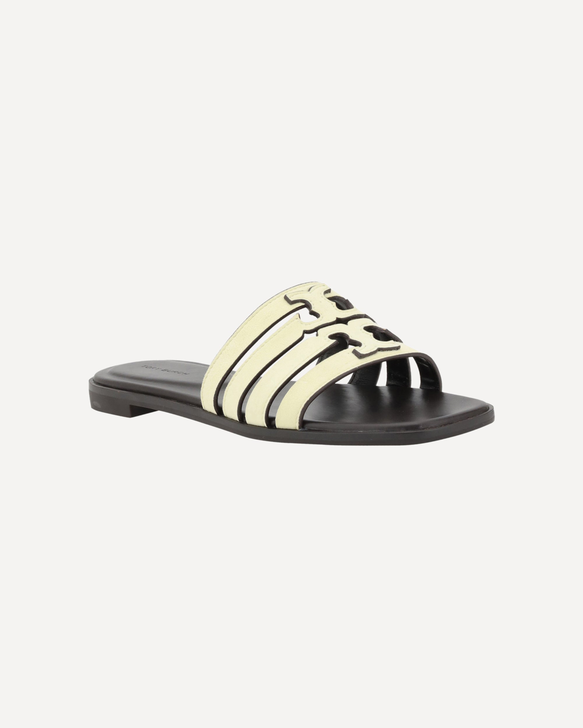 I Sandali Ines in pelle di Tory Burch sono un'interpretazione elegante e moderna del design estivo. Presentano una punta squadrata che conferisce un look contemporaneo e sofisticato. La fascia sul fronte, caratterizzata da dettagli cut-out, aggiunge un tocco di originalità, mentre l'iconico logo di Tory Burch impreziosisce ulteriormente il modello. La suola piatta garantisce comfort e stabilità, mentre la soletta logata completa il design con un ulteriore accento distintivo del brand.