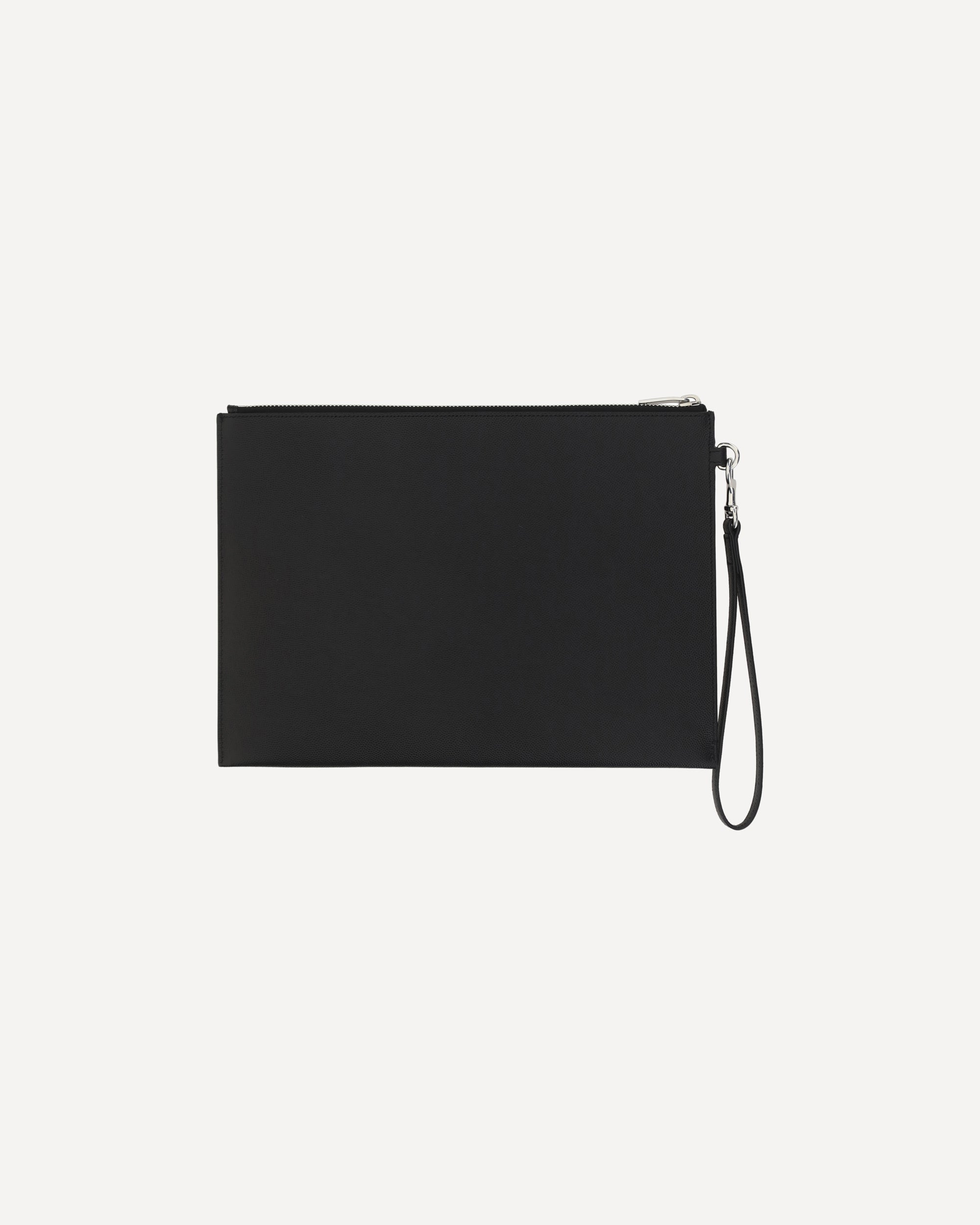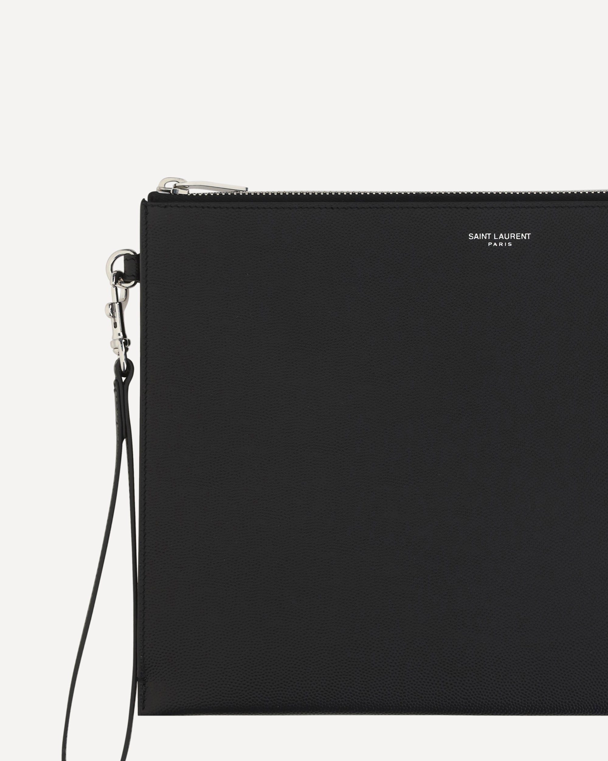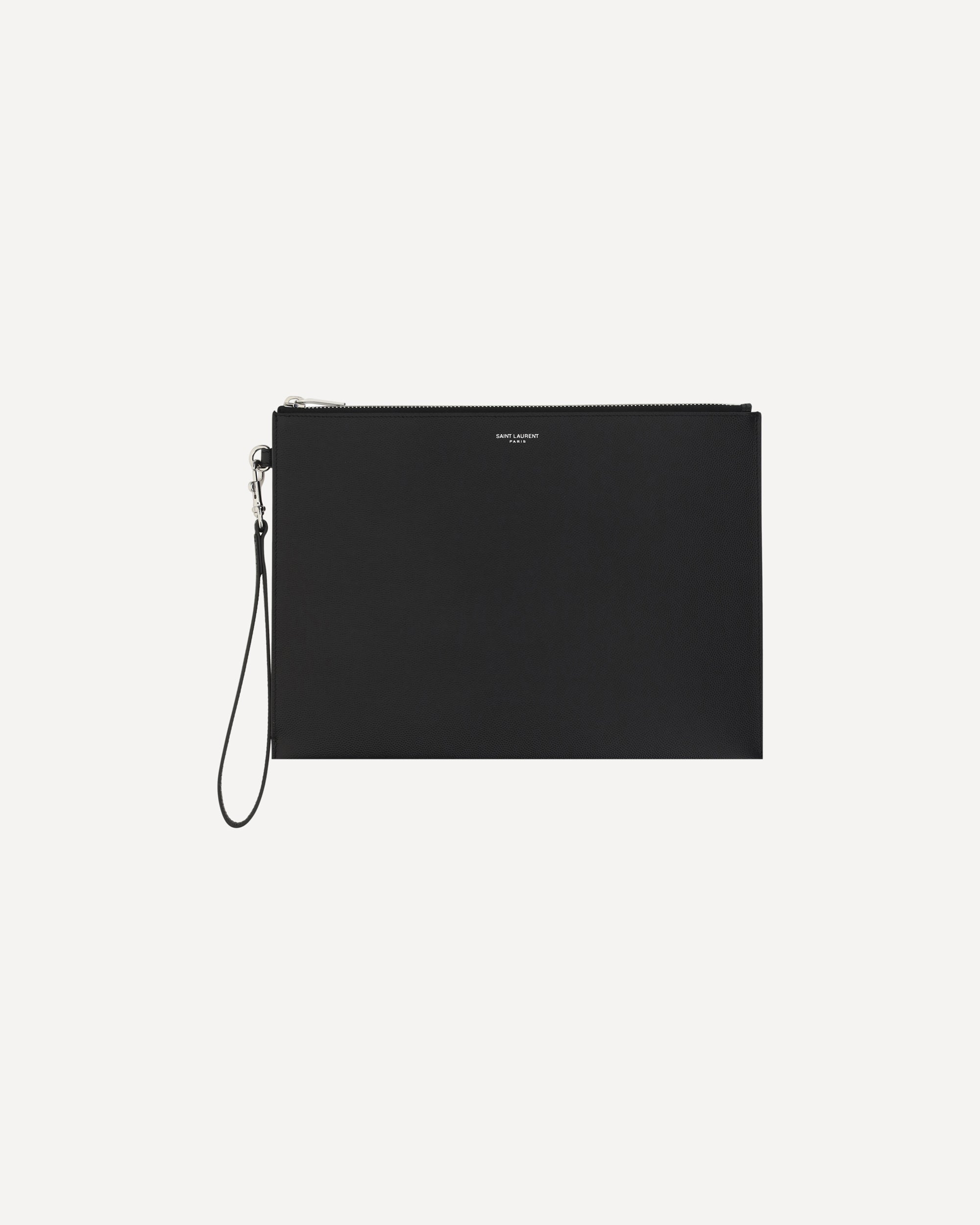 Porta iPad in Pelle di Saint Laurent, chiusura mediante cerniera nella parte superiore, iconico monogramma brand sul fronte, laccetto a lato removibile, slot per carte interne.