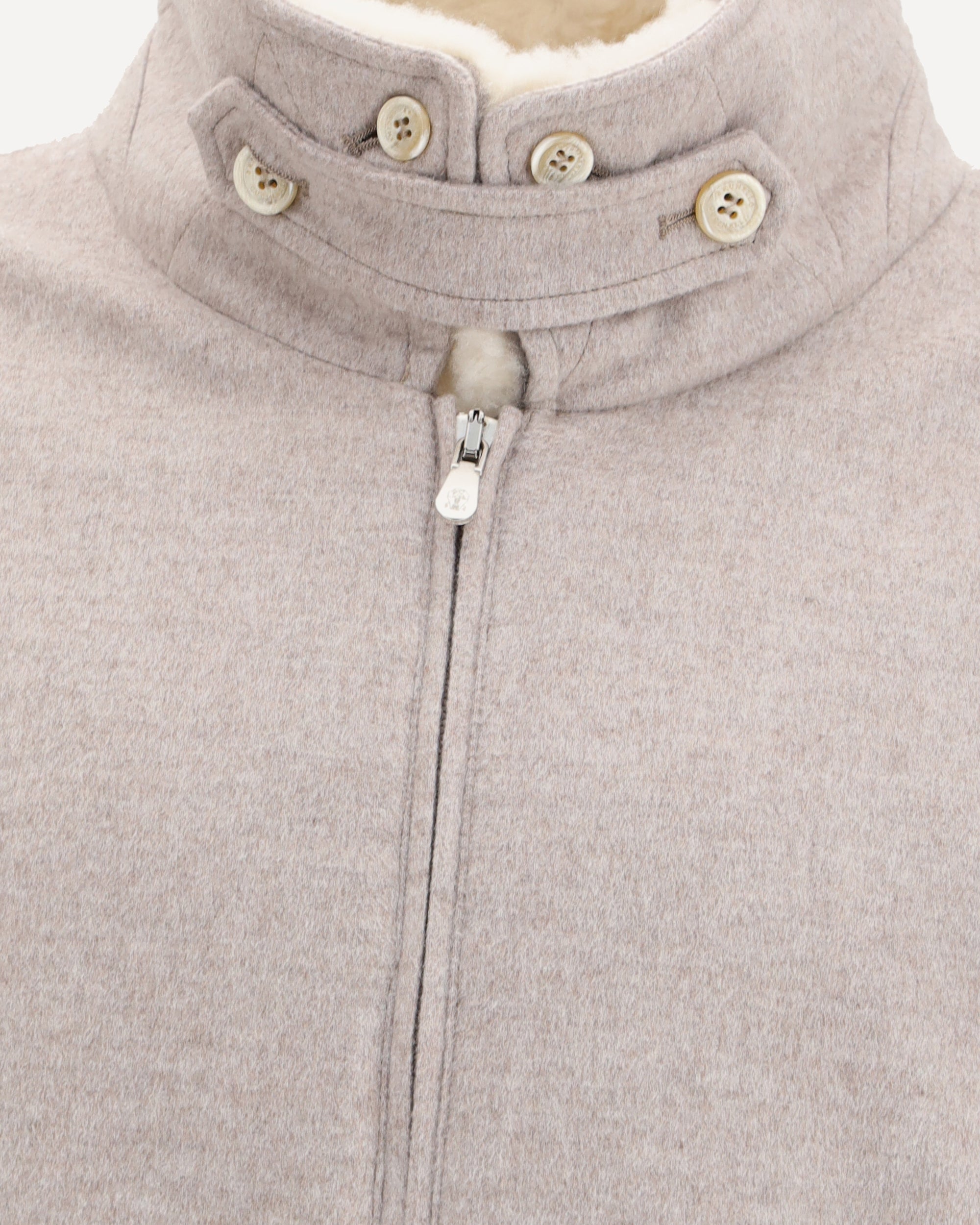 Il Bomber in Cashmere di Brunello Cucinelli unisce materiali pregiati e design sportivo in un capo casual e raffinato. Realizzato in beaver di cashmere membranato, si distingue per la sua mano soffice, esaltata dall’inserto staccabile in morbido shearling. La membrana protettiva interna e l’imbottitura leggera in Thermore® assicurano comfort e protezione, perfetti per un utilizzo funzionale senza rinunciare allo stile.