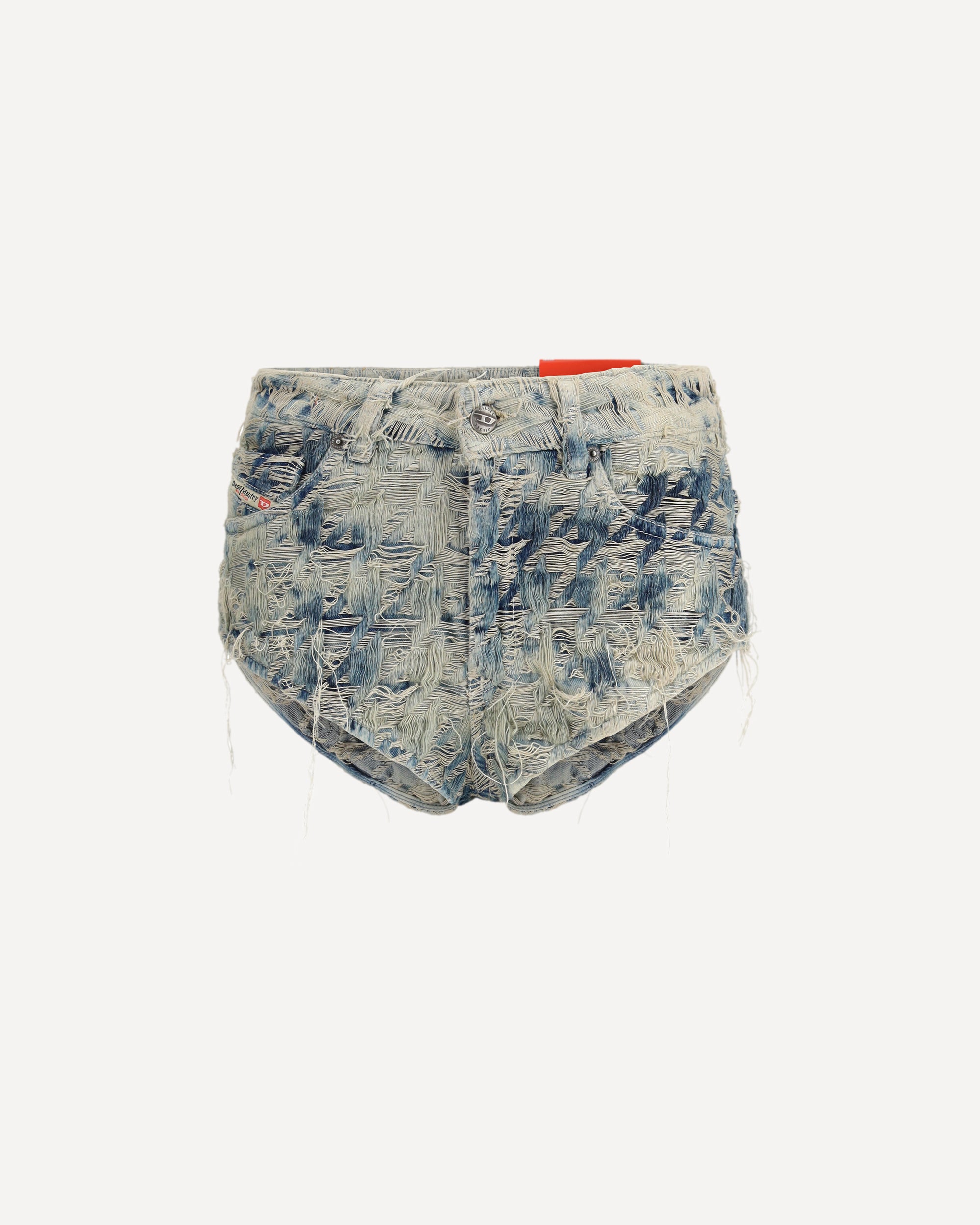I Pantaloncini De-Jizz-FSH1 di Diesel, presentati nella sfilata Fall Winter 2025 Runway Show, reinterpretano la classica silhouette cinque tasche in chiave sperimentale. Realizzati in denim 100% cotone, sono trattati per creare intensi contrasti chiaro-scuro che formano un motivo pied-de-poule nei toni del blu. Ogni capo è unico grazie ai dettagli distressed, alle bruciature e agli effetti dirt, che donano una finitura vissuta e autentica, espressione dell’estetica audace e non convenzionale di Diesel. Completano il modello la chiusura con bottone e zip e una tasca a filetto sul retro.