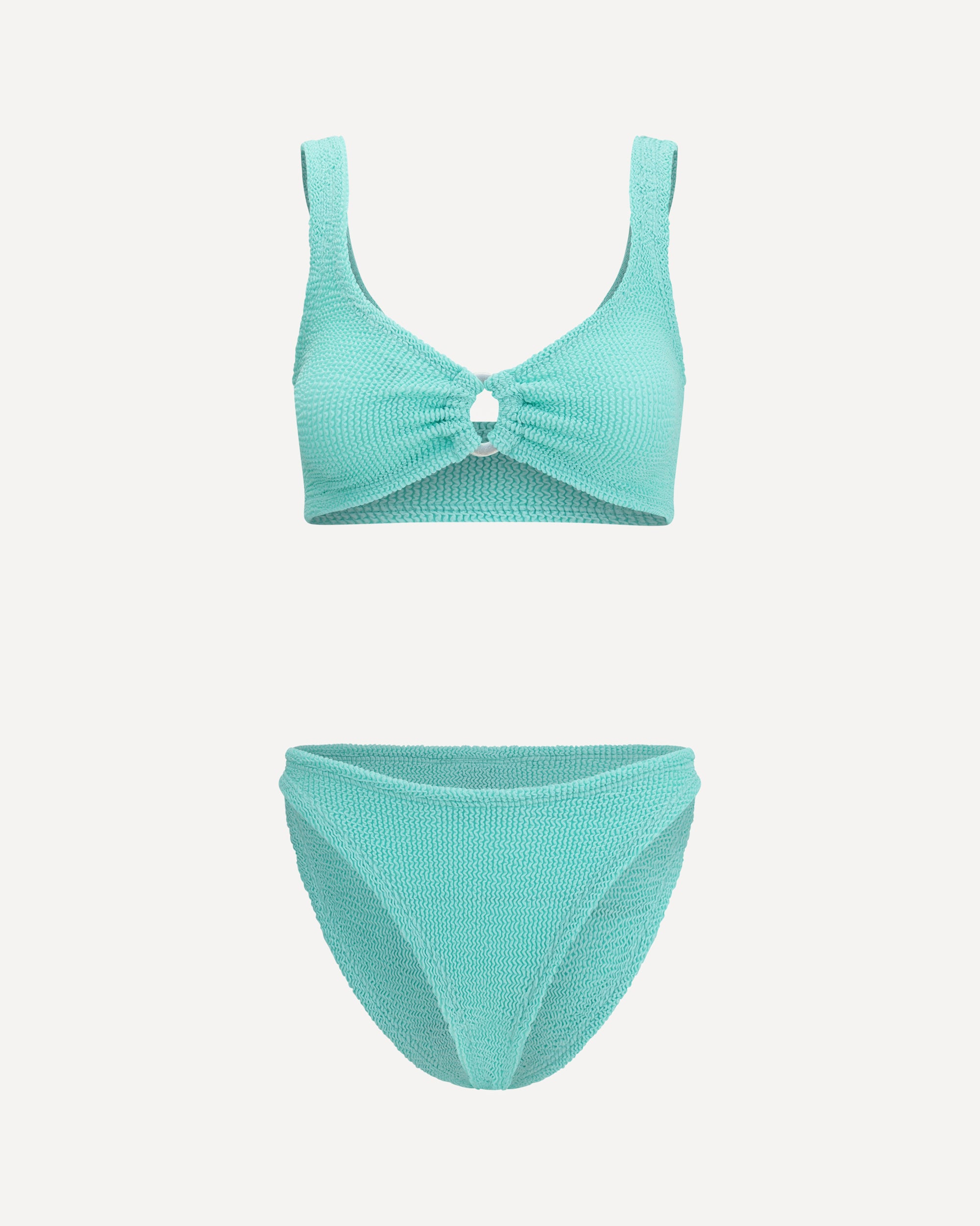 Il Costume da bagno Julia di Hunza G è l'ideale per chi cerca un look sofisticato e moderno. Il modello bikini è composto da uno slip a vita bassa e un top con spalline, arricchito da un dettaglio cut-out con annello tartarugato sul fronte, che aggiunge un tocco di stile distintivo. La lavorazione esclusiva Original Crinkle permette al tessuto di allungarsi per flettersi, scolpire e sostenere ogni curva, adattandosi perfettamente a tutte le corporature, garantendo una vestibilità unica.