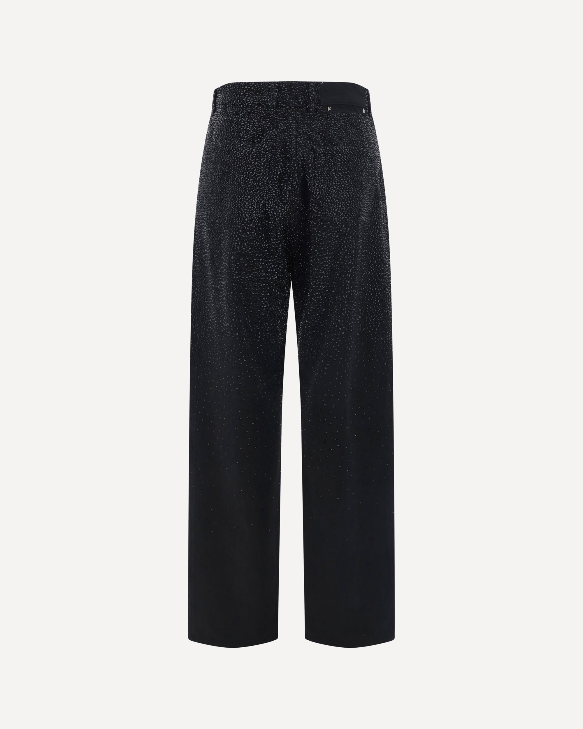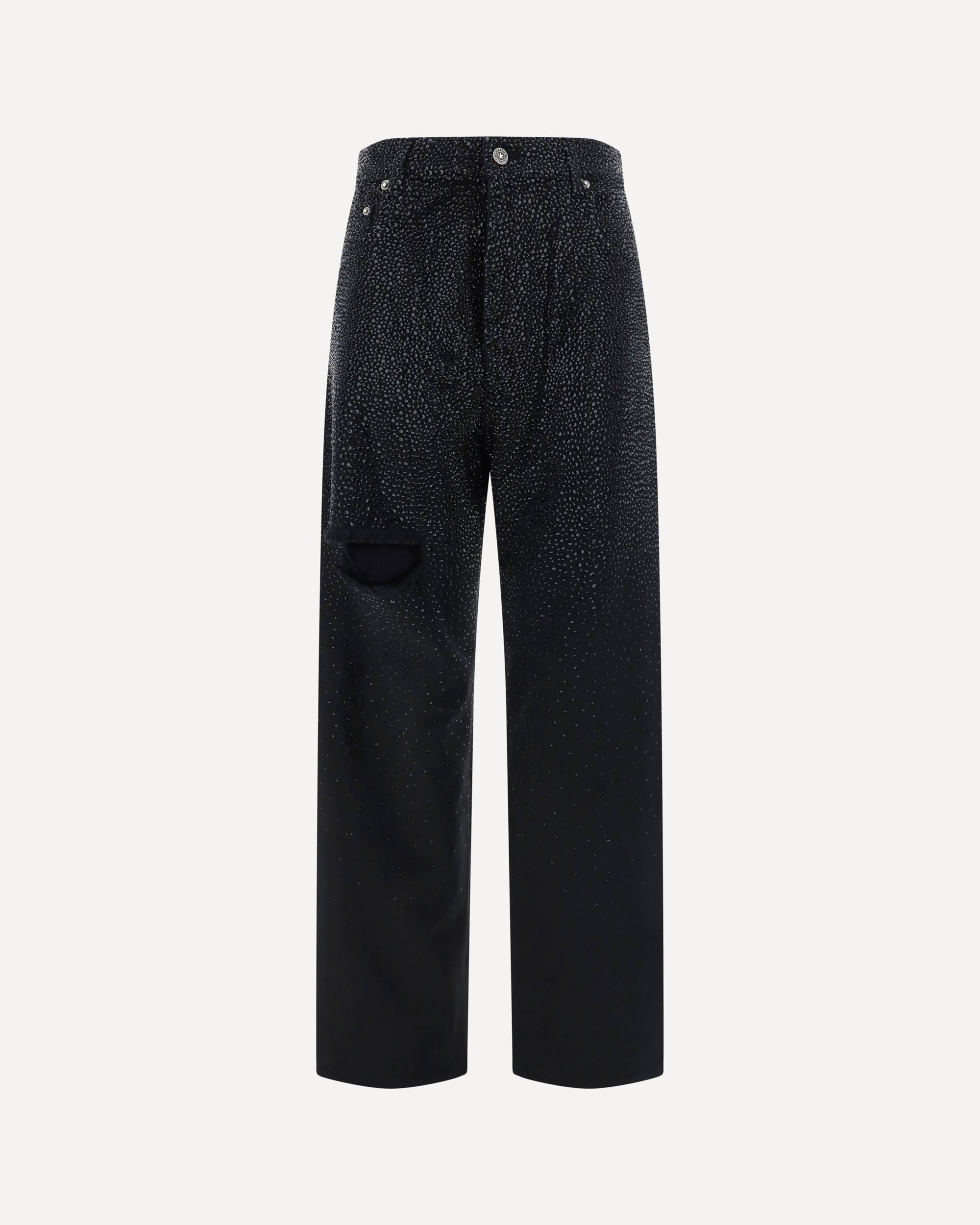 Pantaloni Kim in Cotone di Golden Goose, modello vita bassa a cinque tasche, chiusura frontale con bottone e cerniera, passanti per cintura girovita, iconico patch in pelle con firma brand stampata a pressione applicato sul retro, fantasia monocromo con dettagli monili brillanti all-over, dettaglio cut-out sfrangiato sul pannello frontale, vestibilità regular.