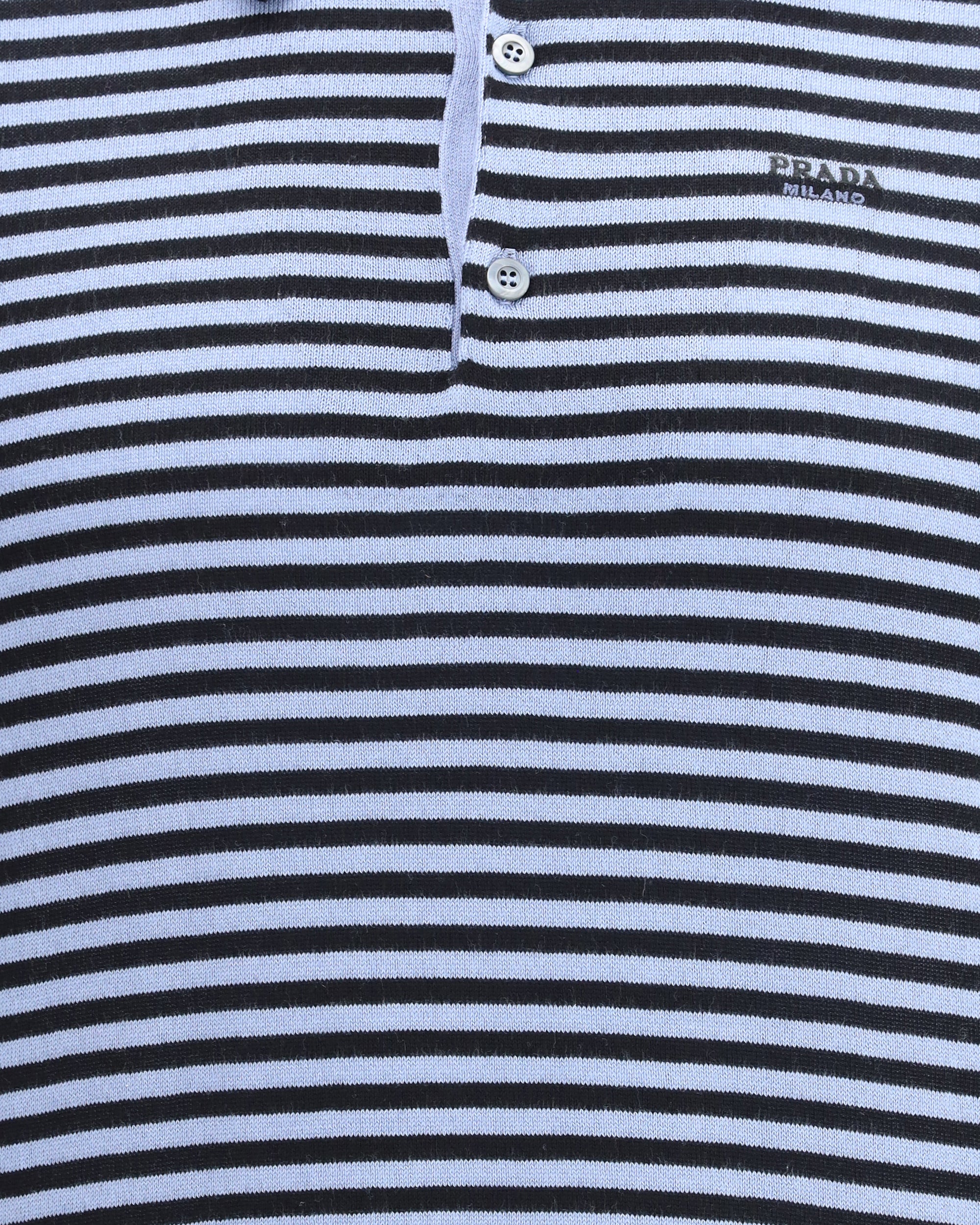 La Maglia polo a righe di Prada unisce uno stile sportivo a dettagli sofisticati. Caratterizzata da un colletto a costine e una chiusura frontale con tre bottoni, presenta un orlo rifinito a costine per una vestibilità impeccabile. Il logo jacquard sul fronte firma il capo con discreta eleganza, esaltando l’identità della Maison.