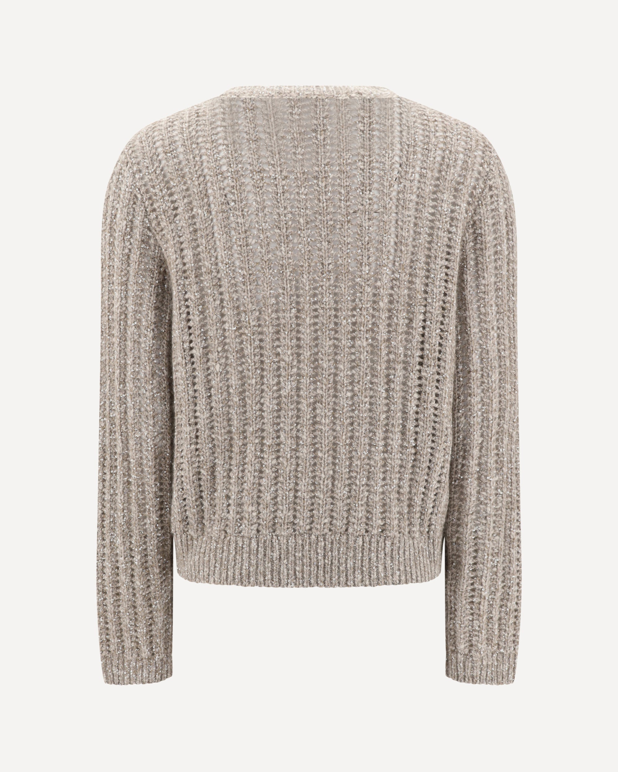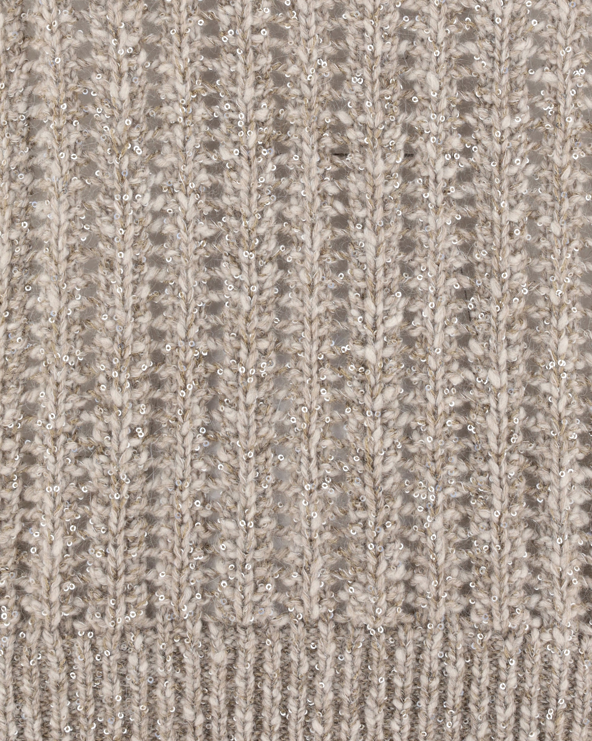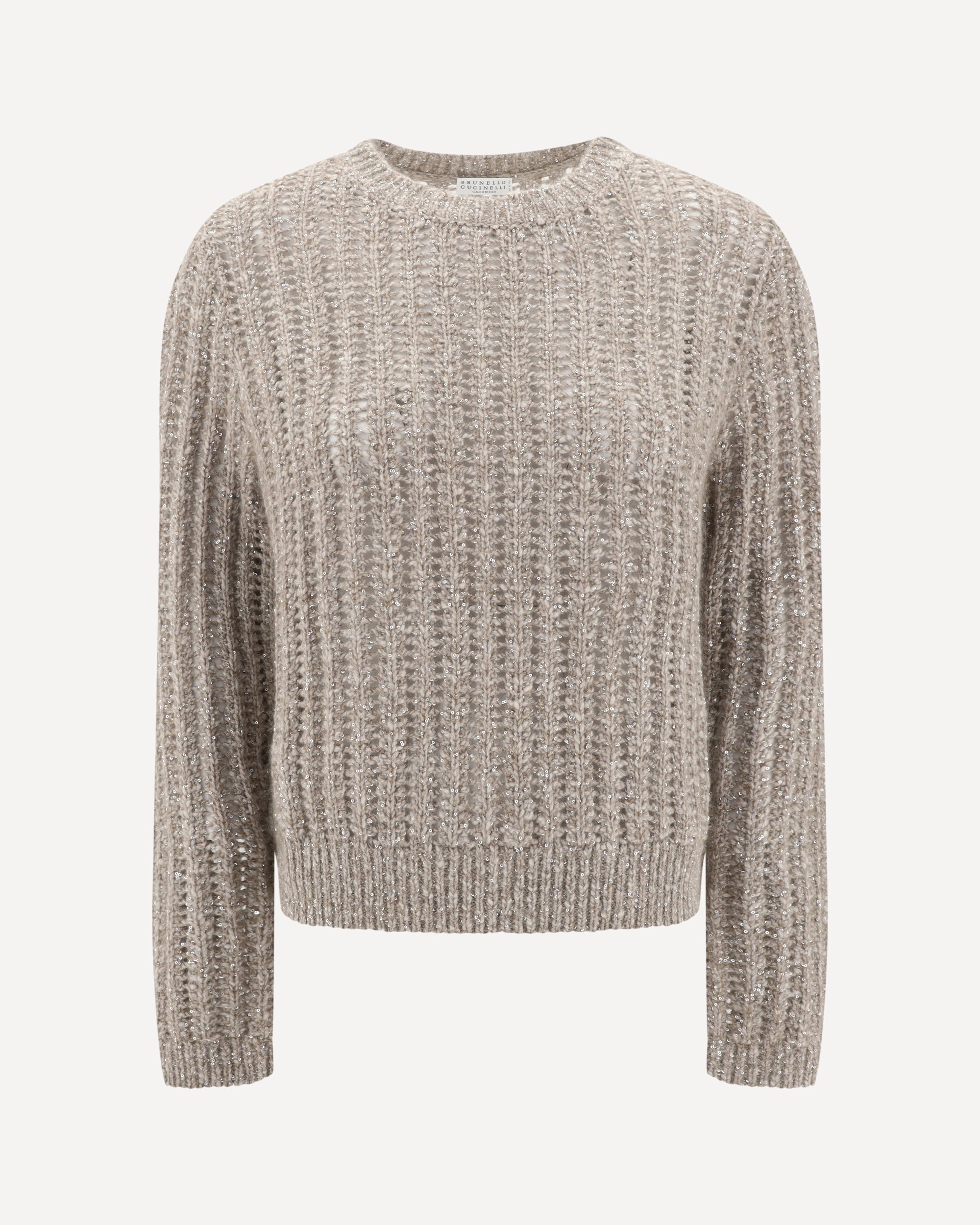 Il Maglione in lana d'agnello di Brunello Cucinelli è un capo sofisticato e caldo, caratterizzato da un girocollo a costine, polsini a costine e un orlo a costine, che conferiscono una finitura elegante e una vestibilità comoda. La trama a maglia traforata aggiunge una texture leggera e ariosa, mentre il dettaglio di paillettes brillanti dona un tocco di lusso e luminosità discreta. La vestibilità regular assicura un comfort ideale, rendendo questo maglione perfetto per look casual ma sofisticati.