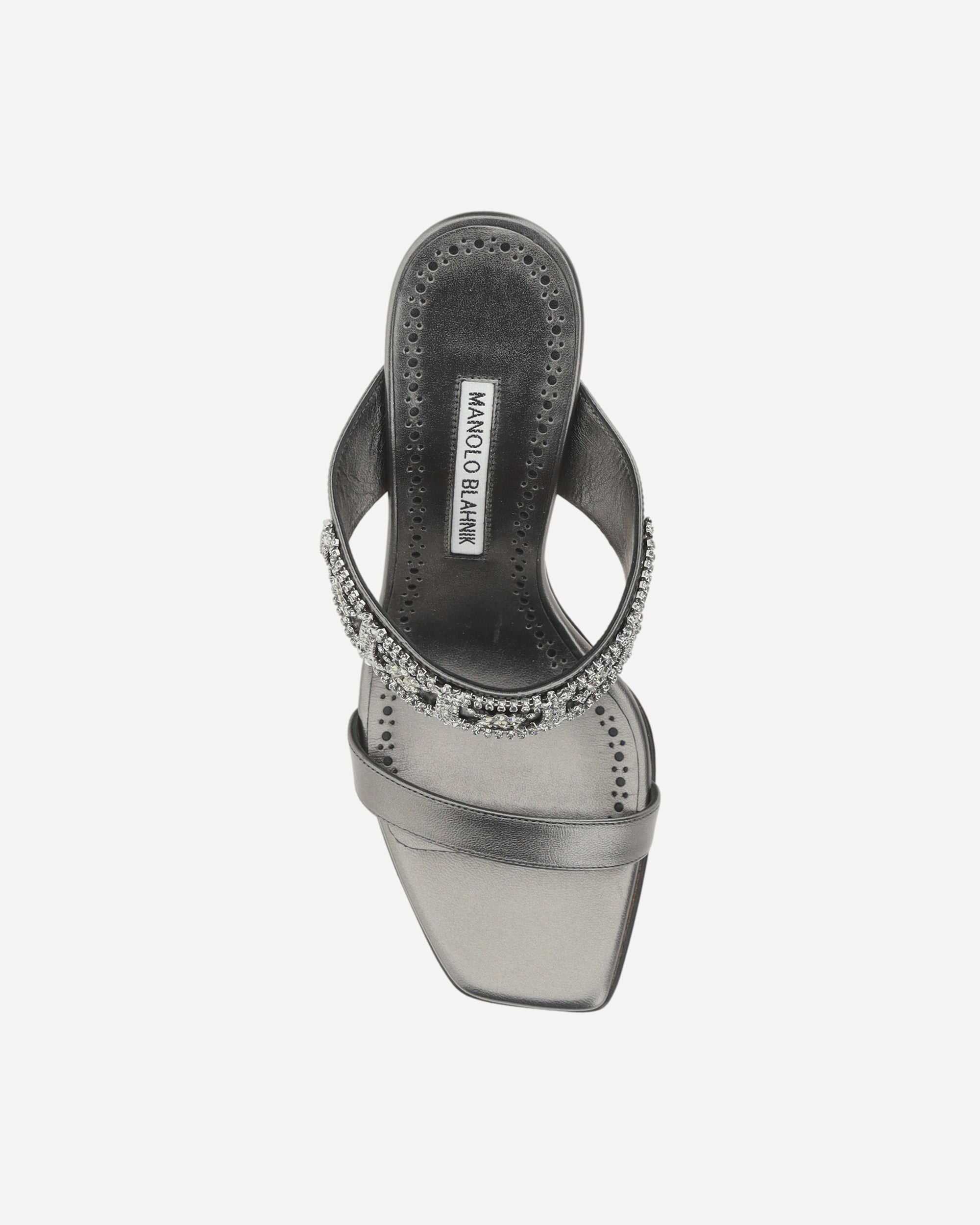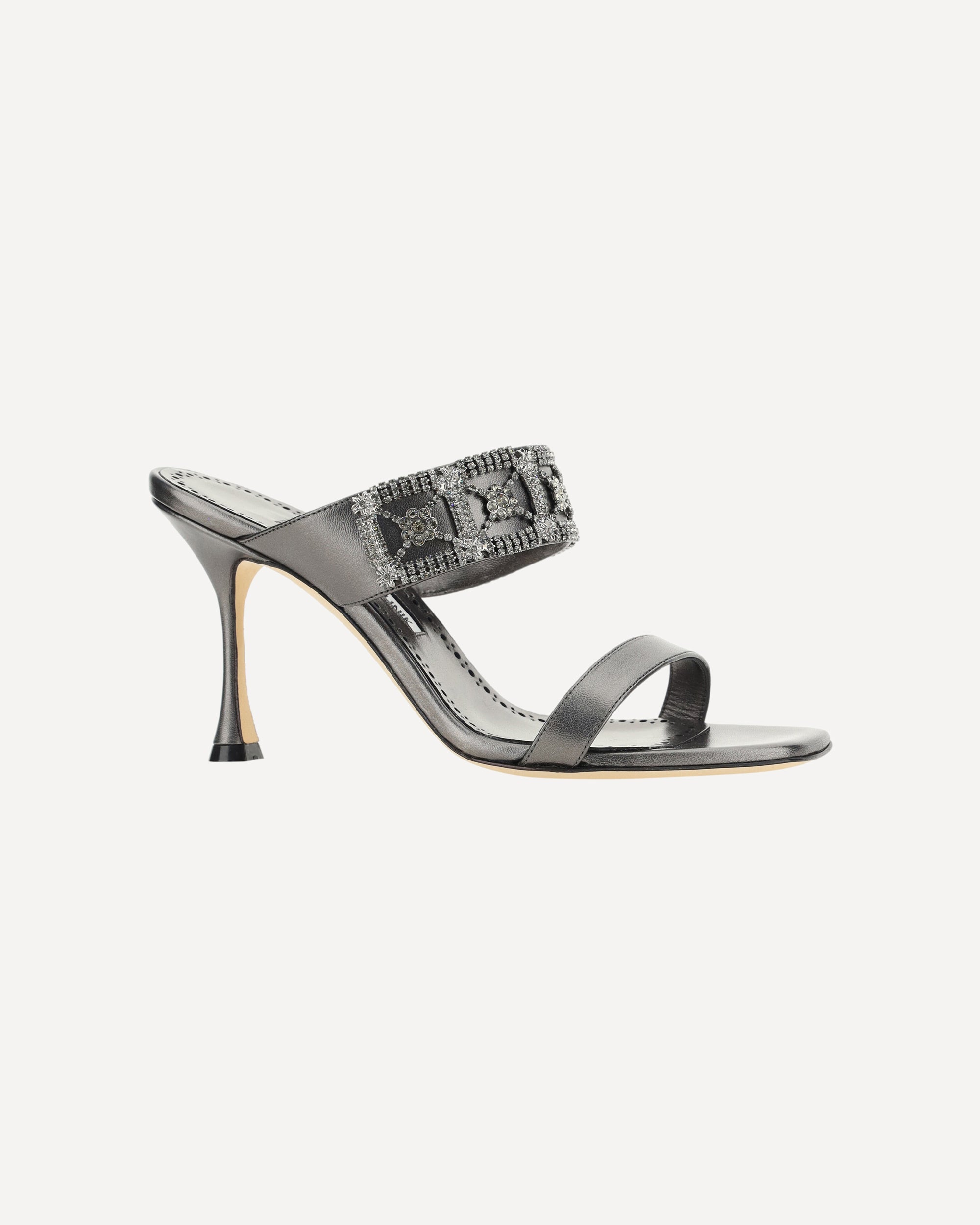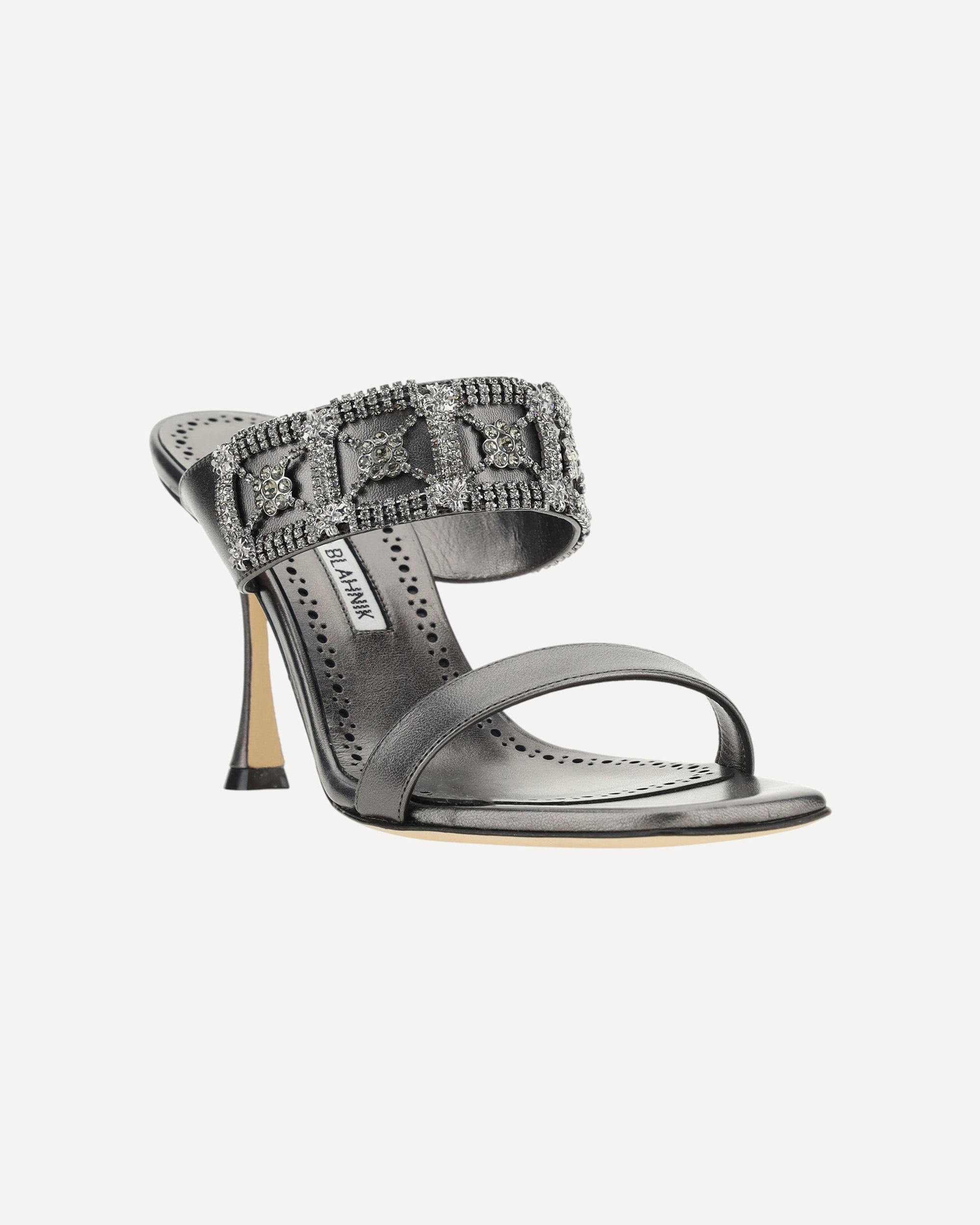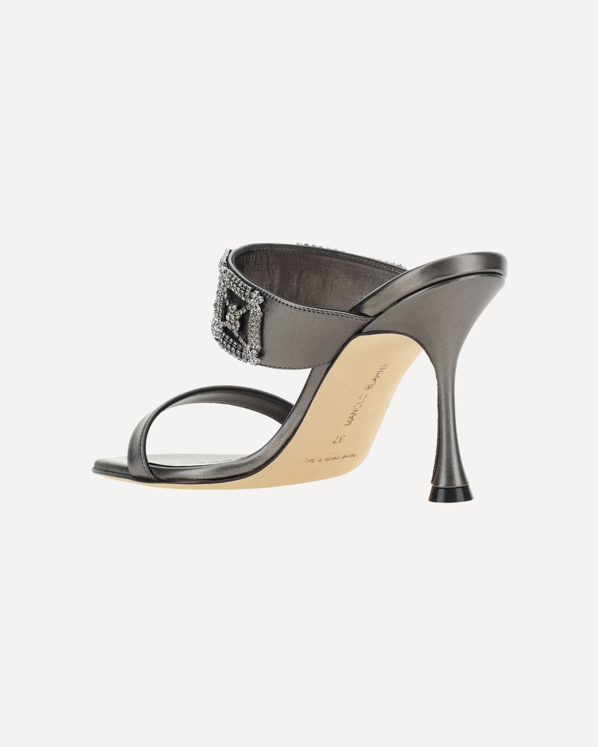 Sandali Larapa in Pelle di Manolo Blahnik, tacco a stiletto in cuoio, doppia fascia frontale con dettaglio monili brillanti, soletta logata, punta a mandorla aperta sul fronte.