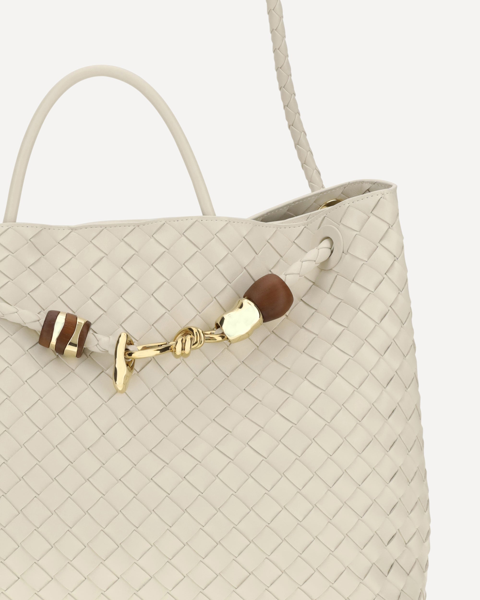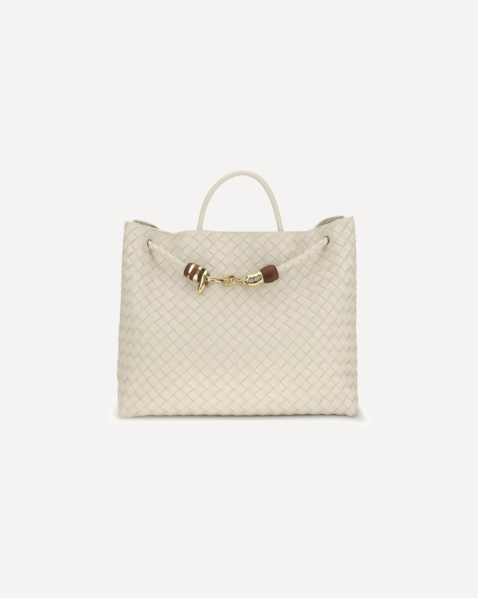 La Borsa a Mano Andiamo grande di Bottega Veneta è un accessorio di grande eleganza e funzionalità. Realizzata in pelle con il celebre motivo Intrecciato, presenta un manico e una tracolla a scorrimento per diverse modalità di utilizzo. All’interno, lo spazio è organizzato con uno scomparto principale, una tasca con zip e due tasche aperte, il tutto foderato in pelle di agnello anch’essa intrecciata. La chiusura magnetica assicura praticità, mentre il dettaglio in oro e legno sul fronte aggiunge un tocco di raffinata originalità.