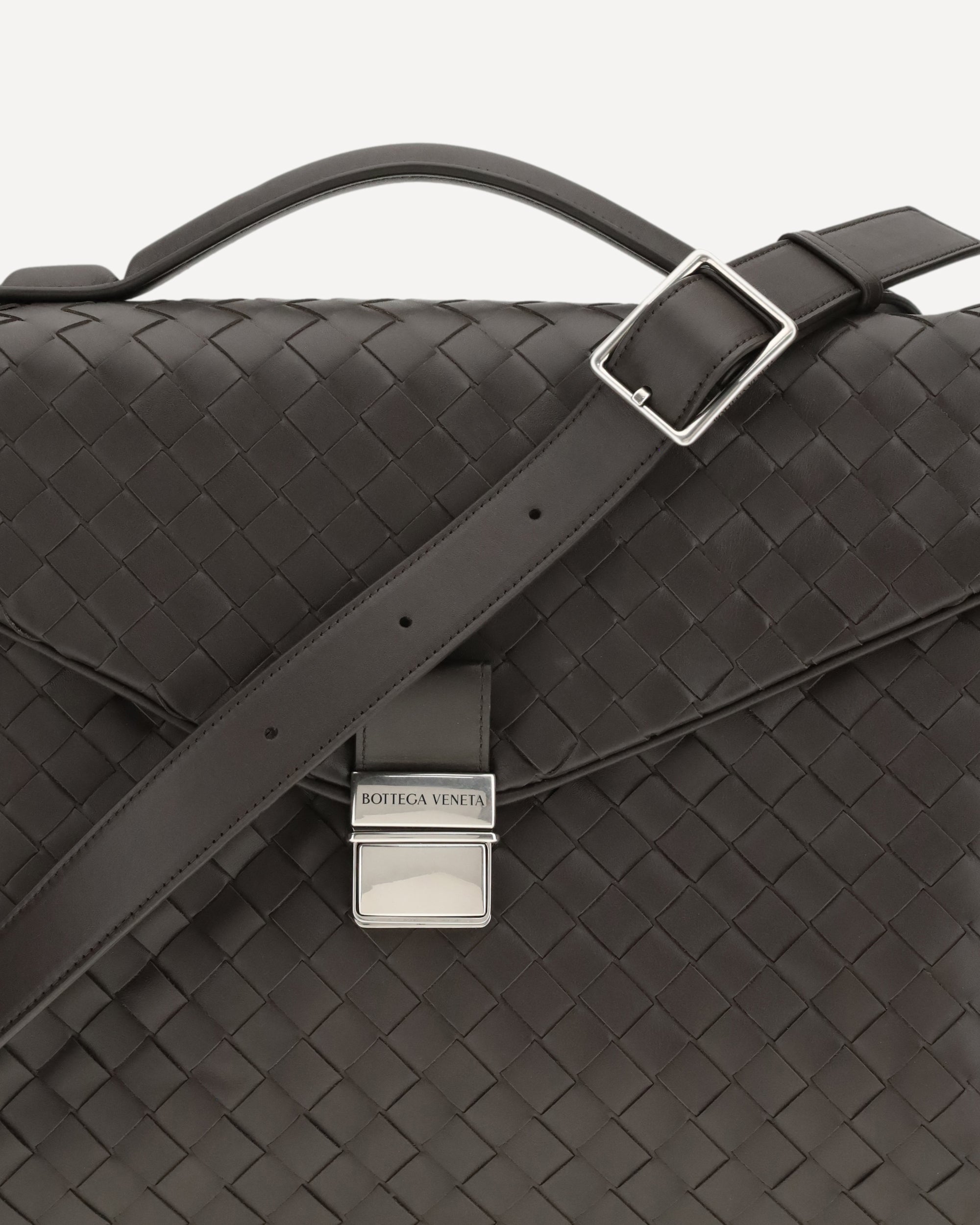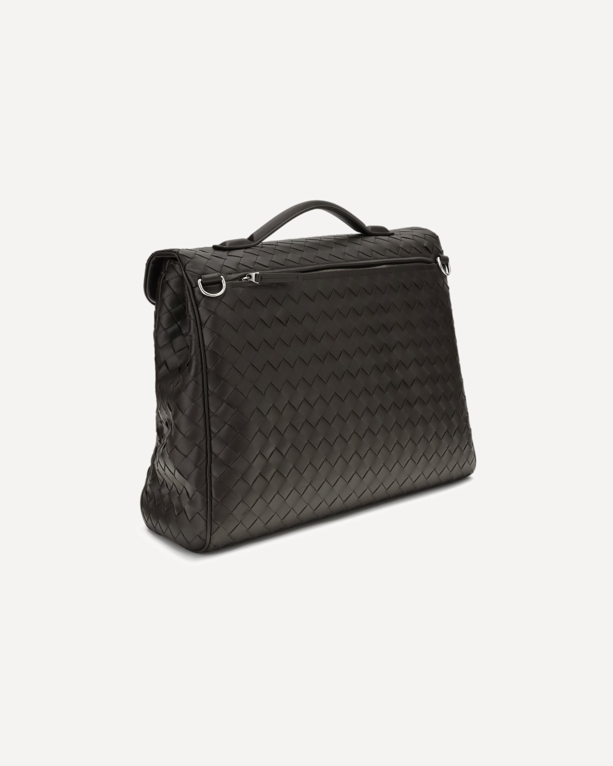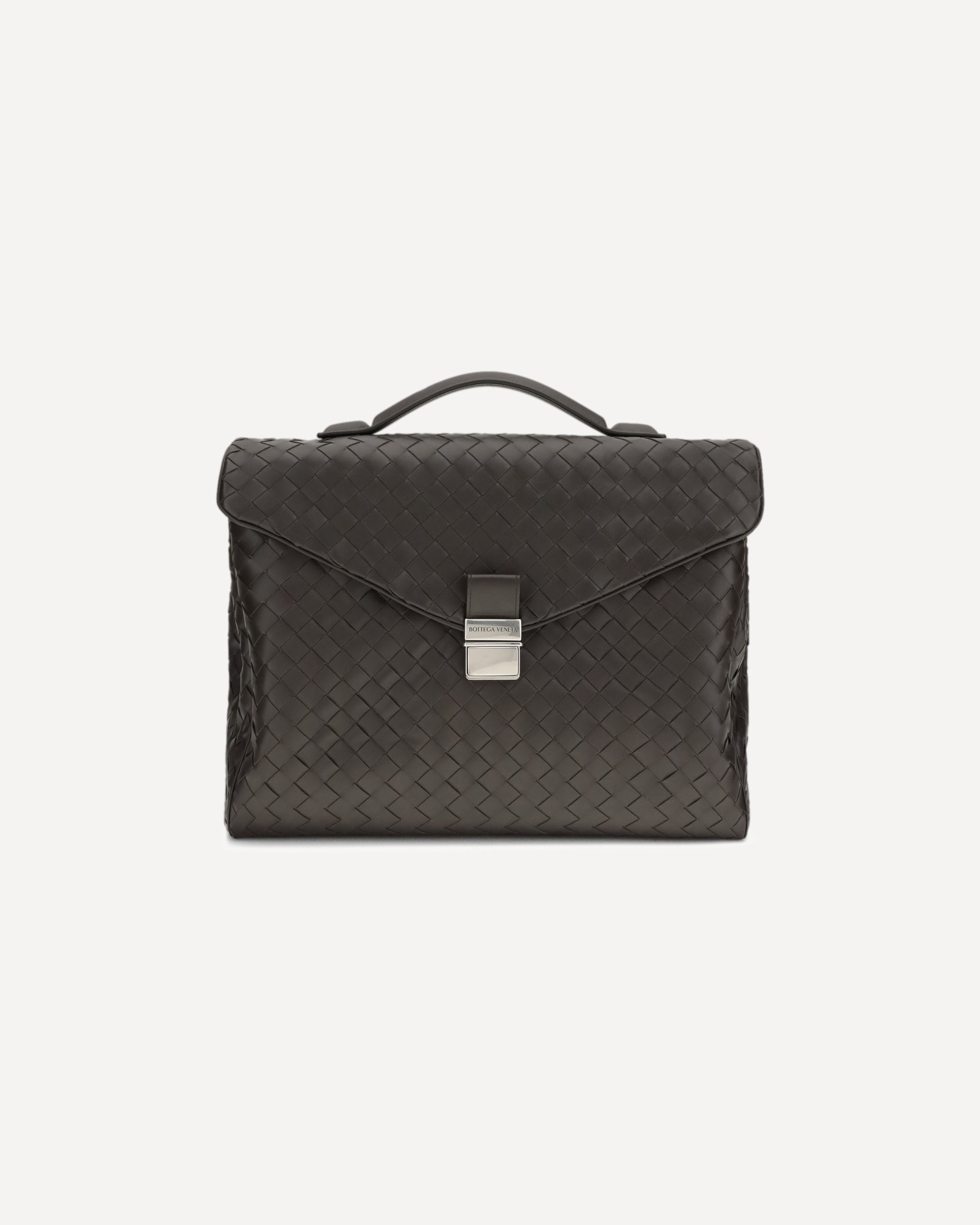 La Borsa business Archivist di Bottega Veneta è realizzata in morbida pelle di vitello con l’inconfondibile motivo Intrecciato, simbolo dell’artigianalità e dell’eleganza discreta della Maison. Il design strutturato presenta un manico superiore e una tracolla regolabile e rimovibile, per adattarsi con facilità alle diverse esigenze quotidiane. La chiusura metallica con logo aggiunge un tocco distintivo, mentre l’interno, organizzato con due scomparti principali separati da un vano con zip per laptop e due tasche aperte, garantisce ordine e funzionalità. Completata da una tasca esterna posteriore con zip e da accessori metallici con finitura argento, è un accessorio raffinato e professionale che coniuga estetica e praticità.