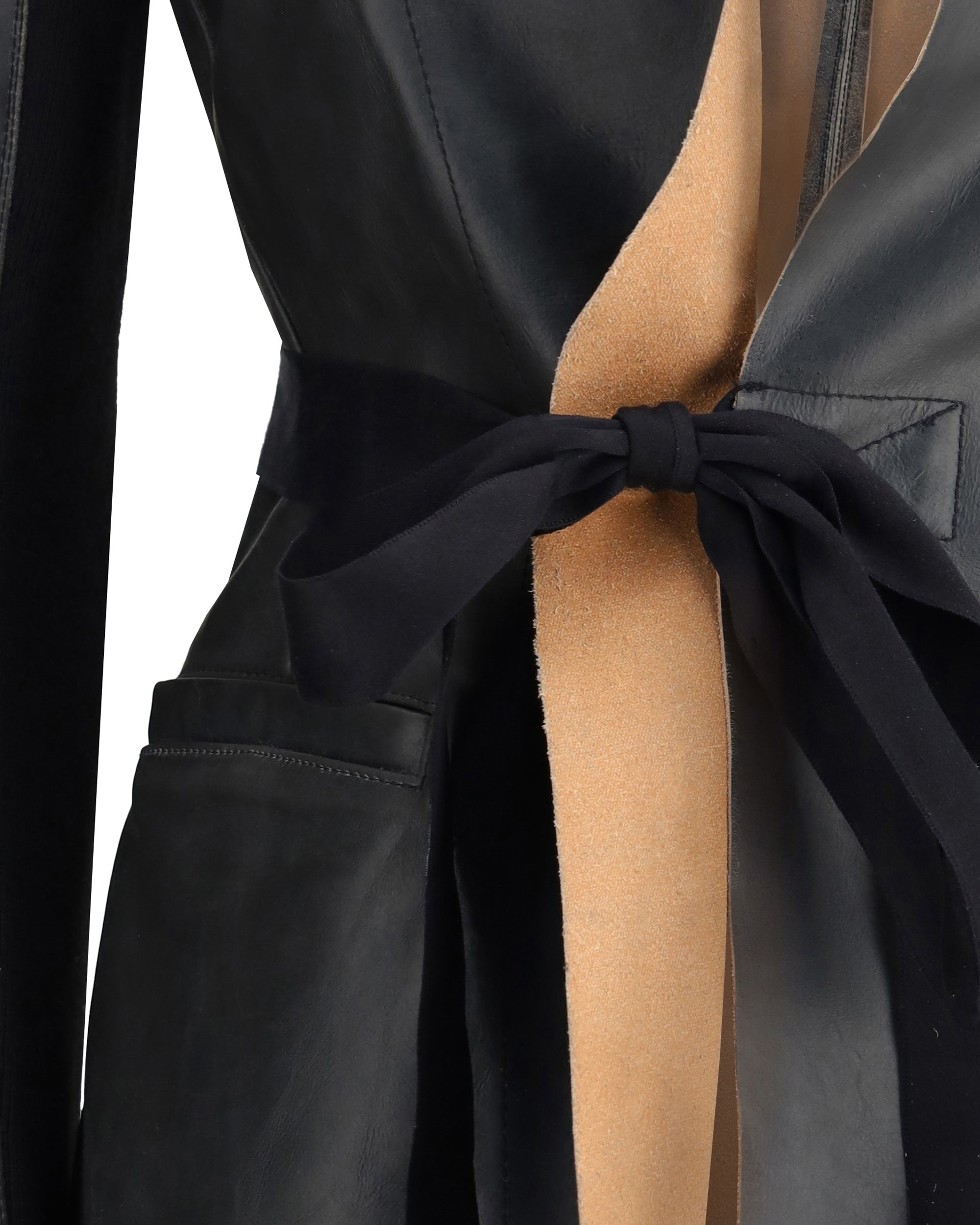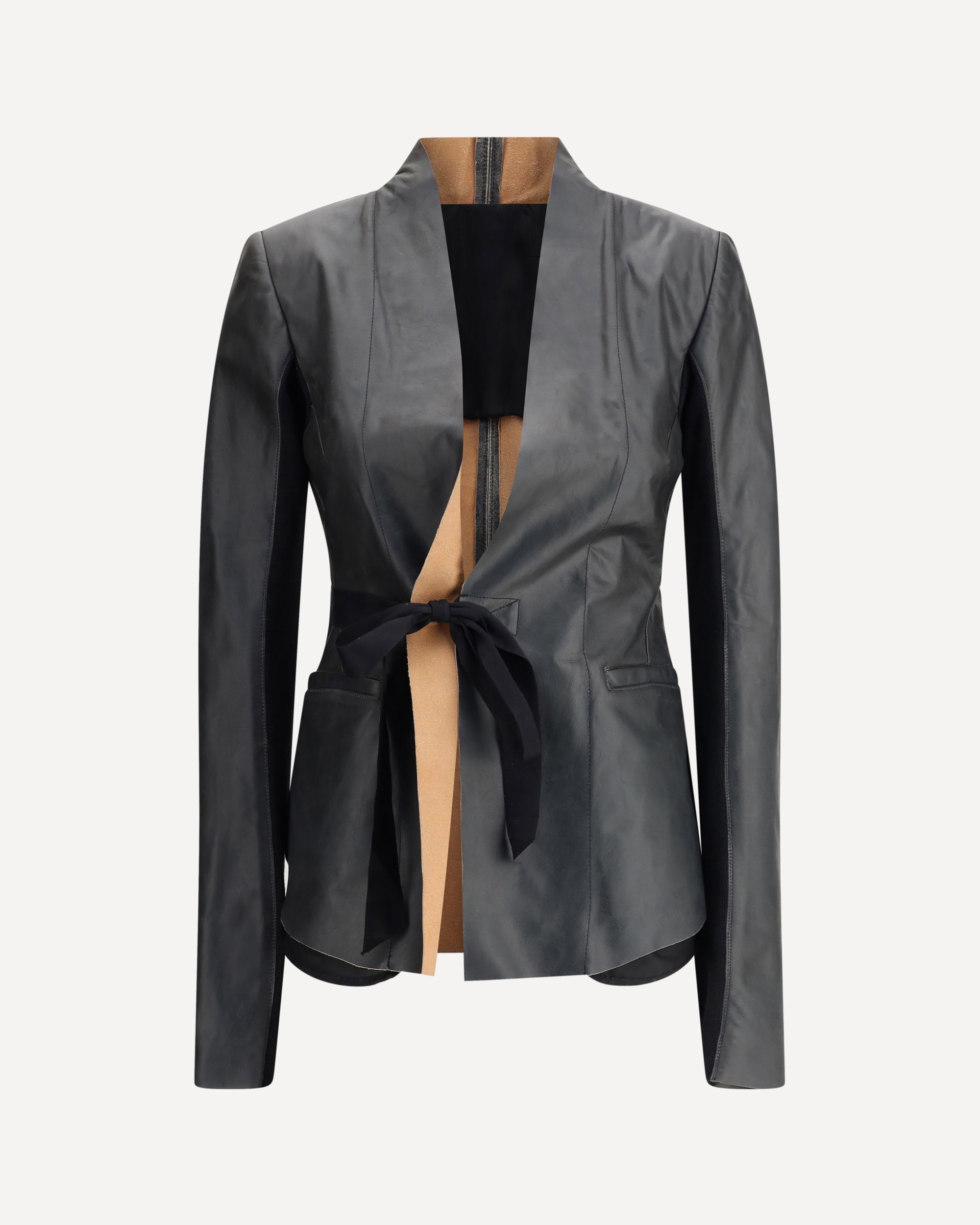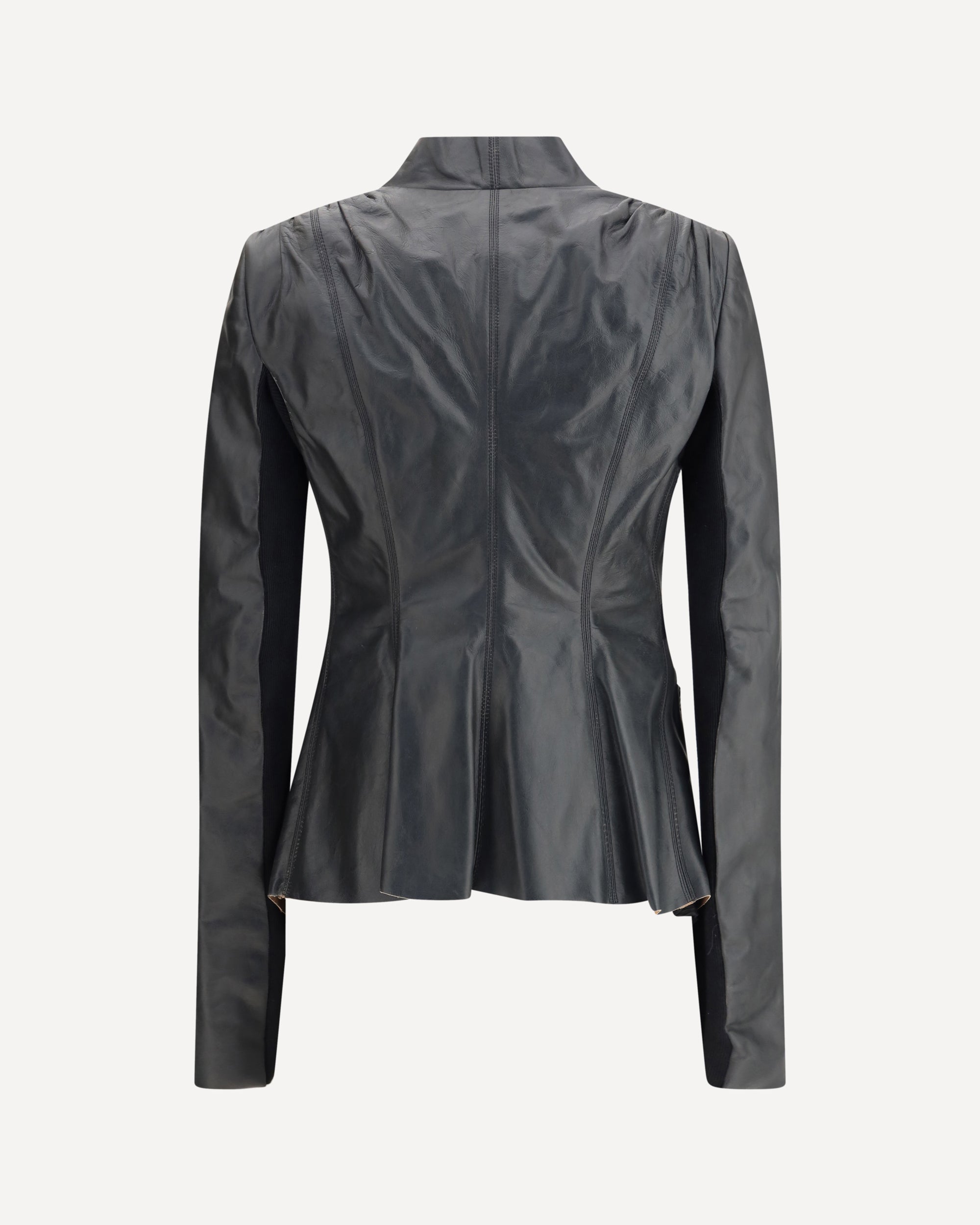 La Giacca in pelle di Rick Owens è un capo audace e contemporaneo, perfetto per chi cerca uno stile distintivo e originale. La chiusura frontale con nastro aggiunge un tocco di contrasto e modernità, mentre il pannello in tessuto sulle maniche offre un interessante gioco di materiali che arricchisce il design. Le due tasche frontali a filetto offrono funzionalità senza compromettere l'estetica pulita, mentre l'orlo asimmetrico dona dinamismo e un accento di modernità al capo. Un pezzo che mescola eleganza e attitudine grunge, ideale per chi vuole distinguersi con un look sofisticato e fuori dal comune.