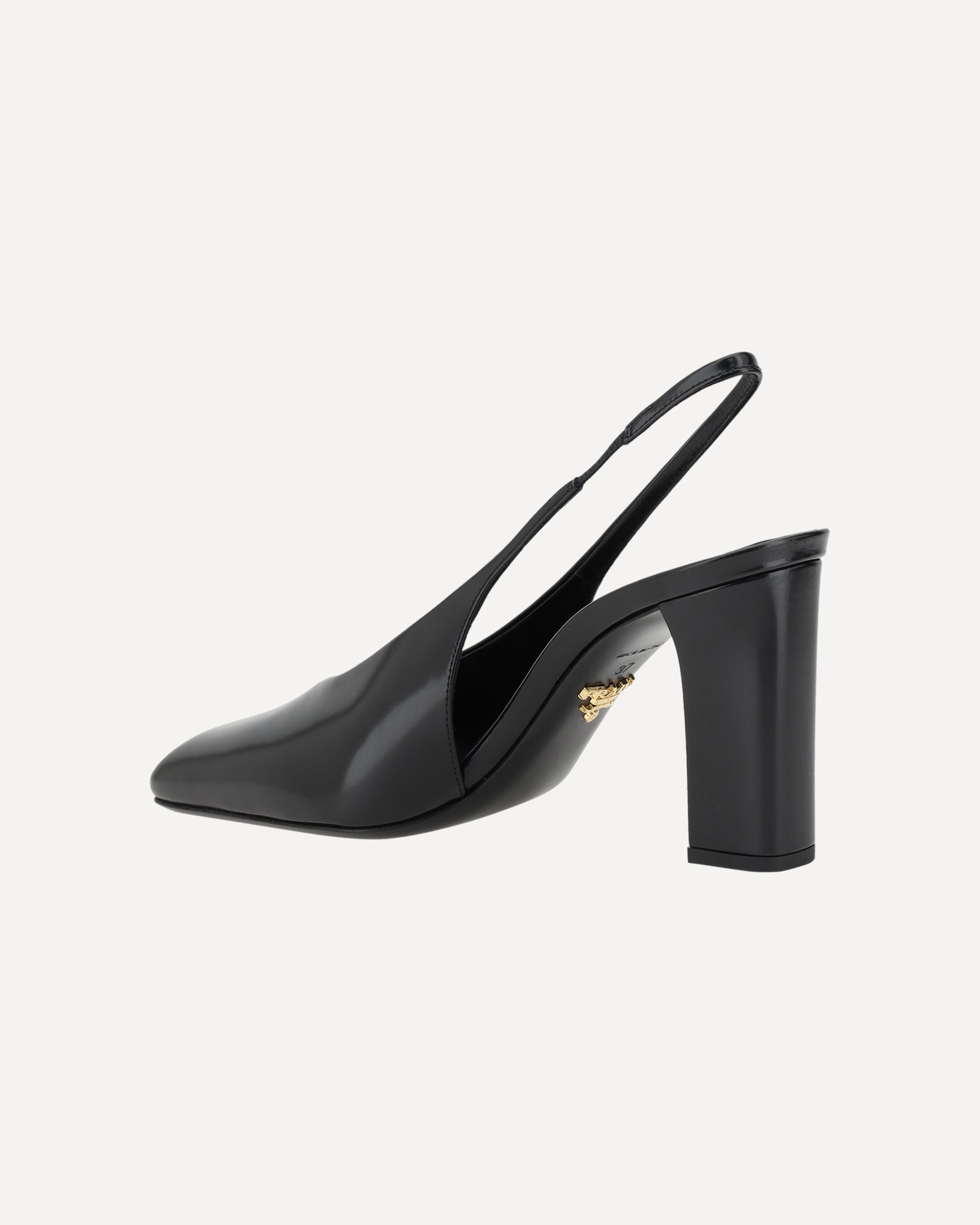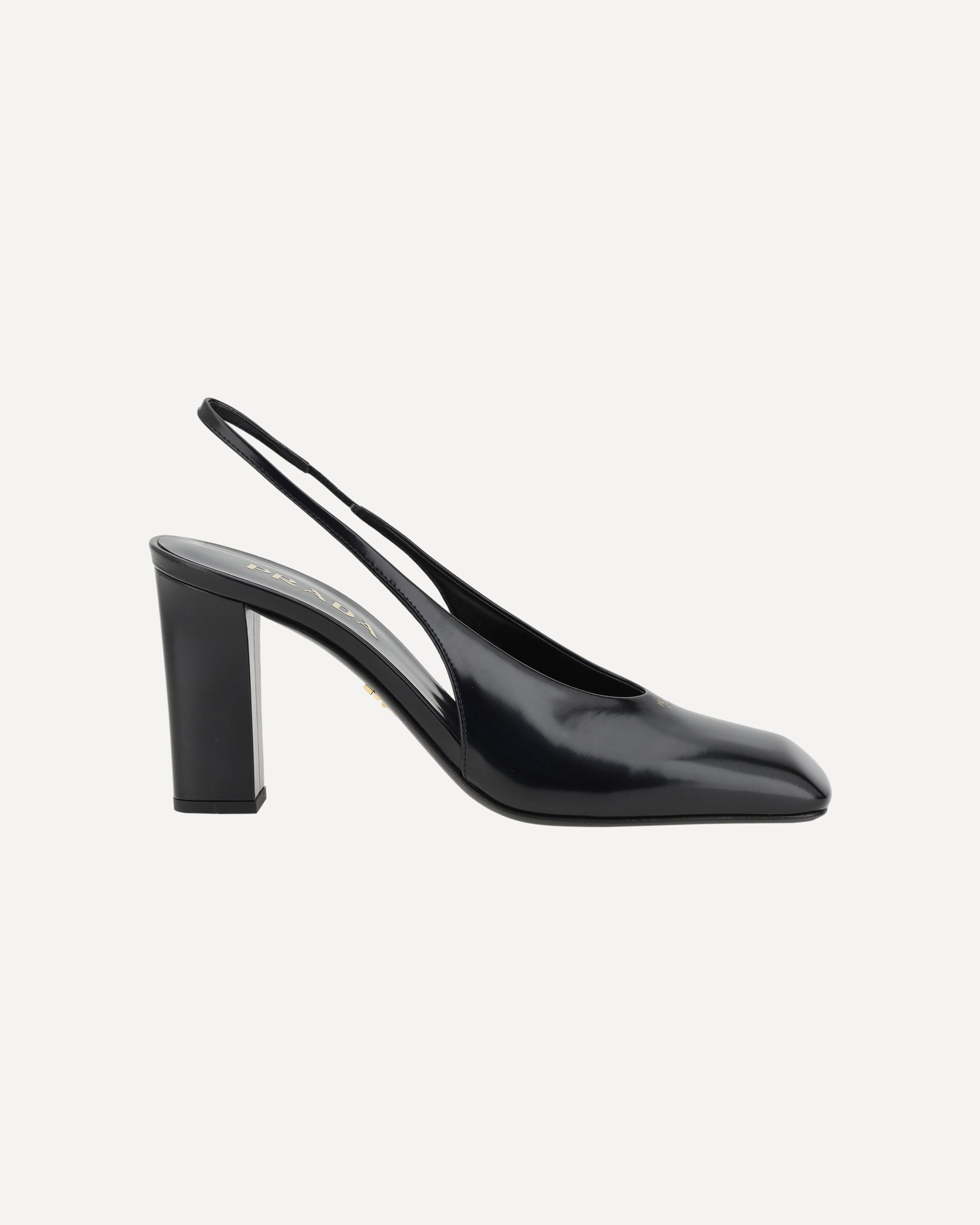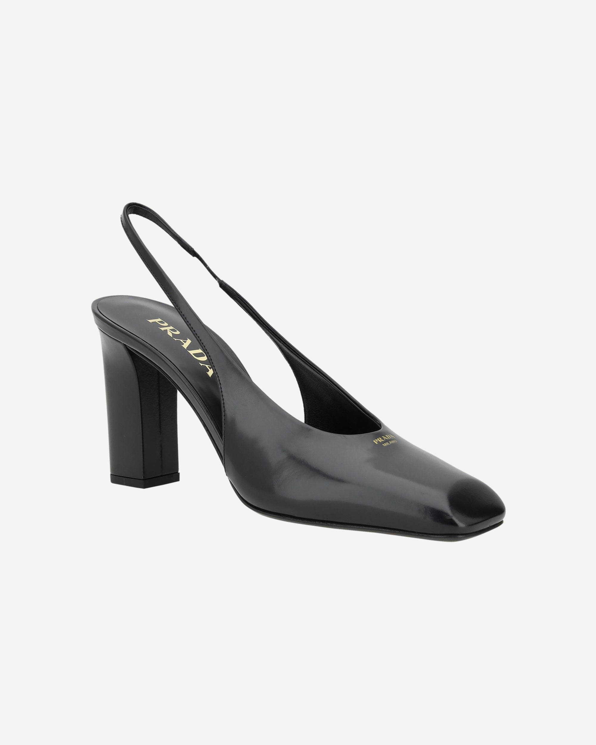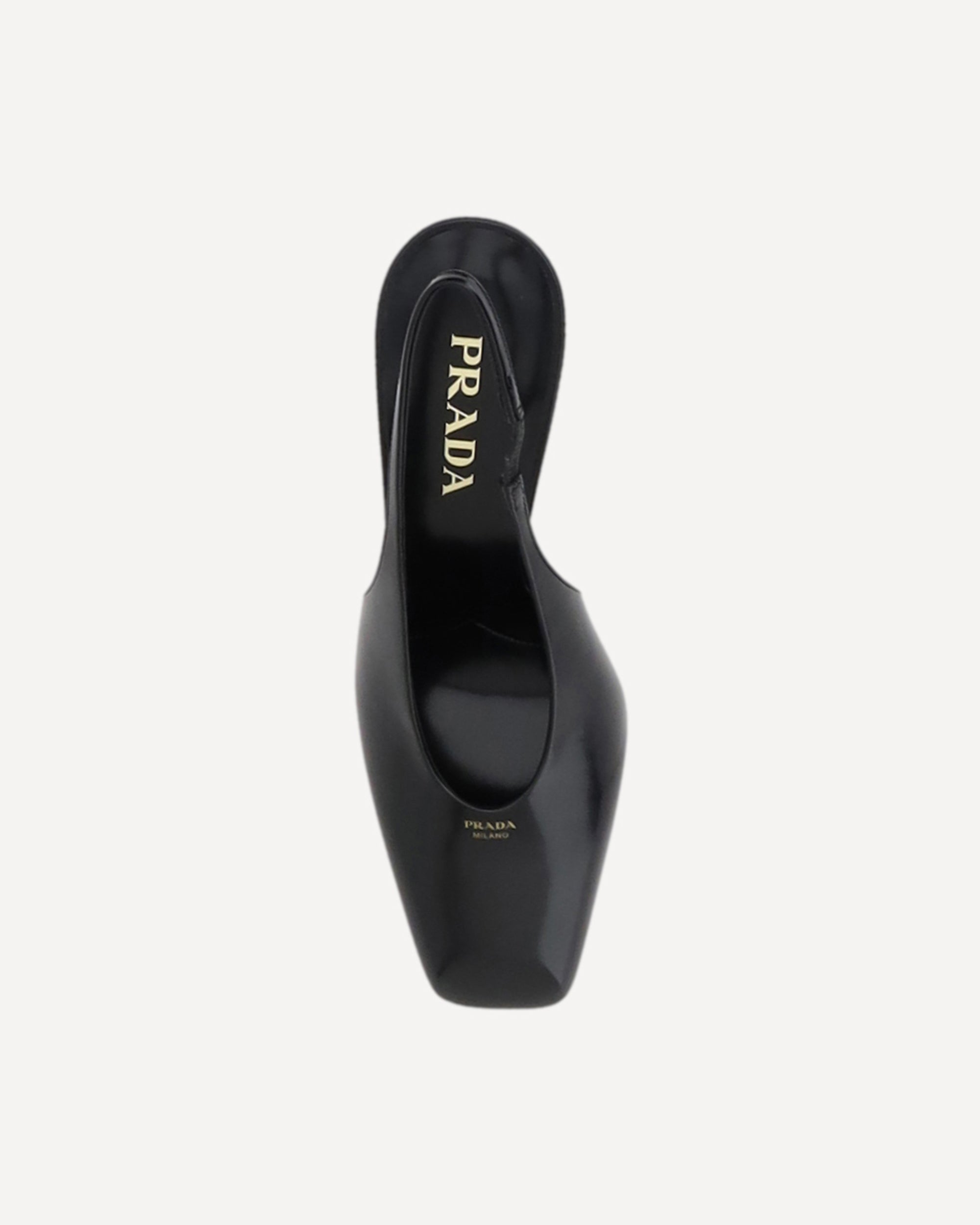 Le Décolleté in pelle di Prada presentano una punta squadrata che conferisce un aspetto moderno e raffinato. L'iconico monogramma stampato a pressione sul fronte aggiunge un tocco distintivo del brand. Il design slingback elasticizzato offre una calzata comoda e sicura, mentre il tacco geometrico in cuoio dona un tocco di originalità e eleganza. La soletta logata completa il look con un accento di lusso.