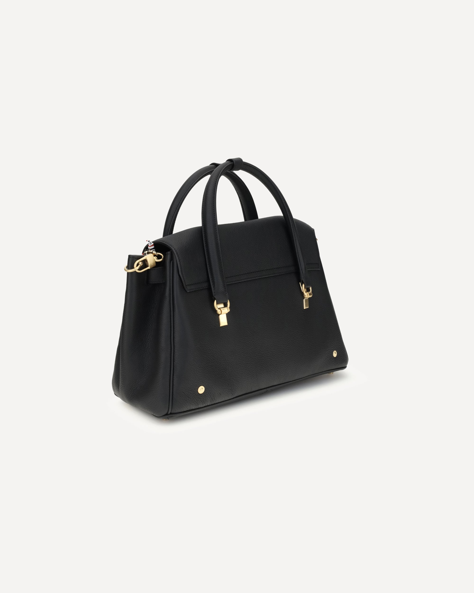 La Borsa a Mano Mrs. Thom di Thom Browne è un'elegante espressione dello stile distintivo della maison. Realizzata in pregiata pelle con grana a ciottolo, presenta l’iconico passante a righe in gros-grain sul retro. La chiusura frontale è impreziosita da un lucchetto in ottone, mentre la tracolla in nastro e i manici superiori offrono versatilità d’uso. All’interno, una tasca con zip assicura funzionalità, completata da rivetti e piedini in ottone che proteggono la base e aggiungono un tocco raffinato.