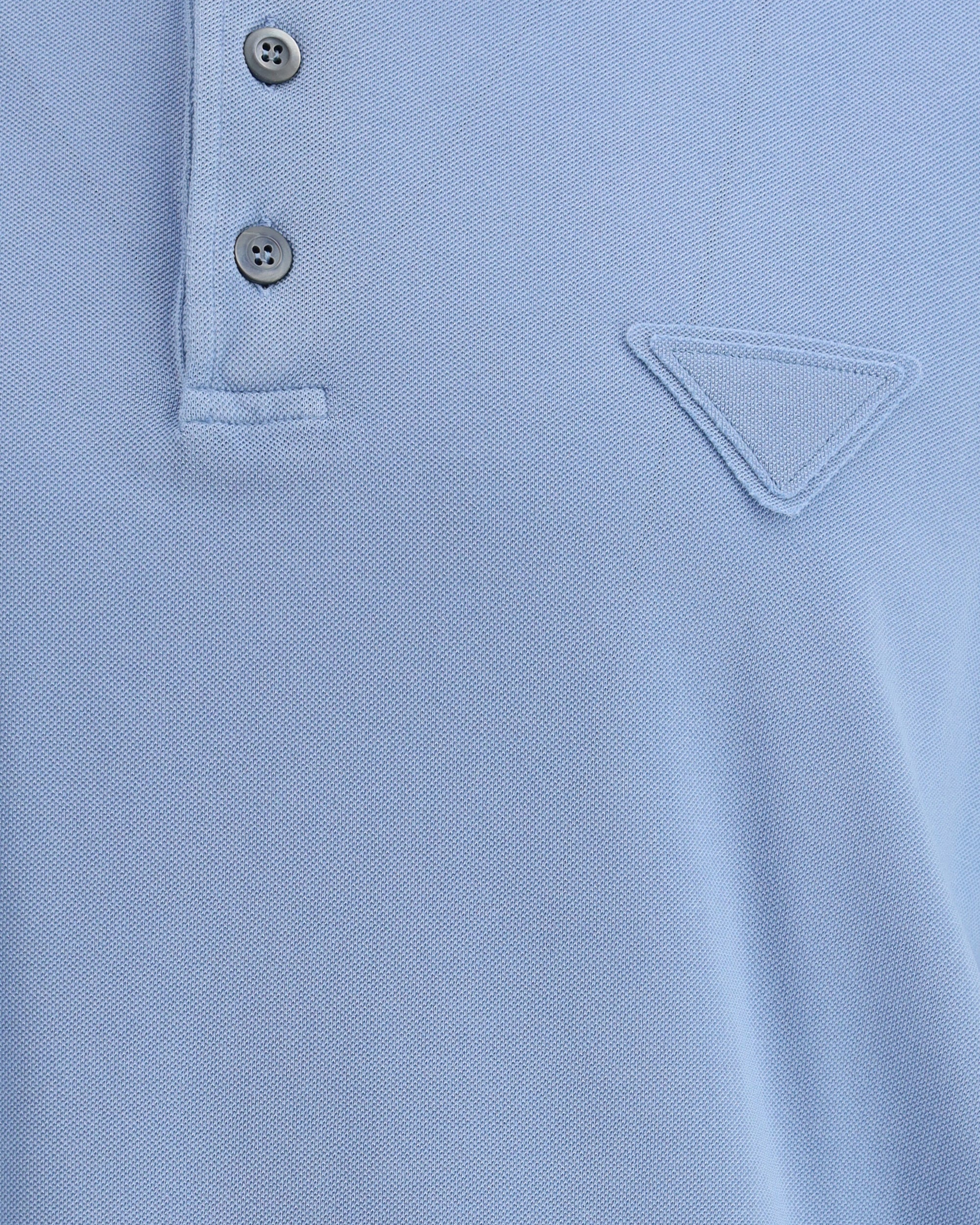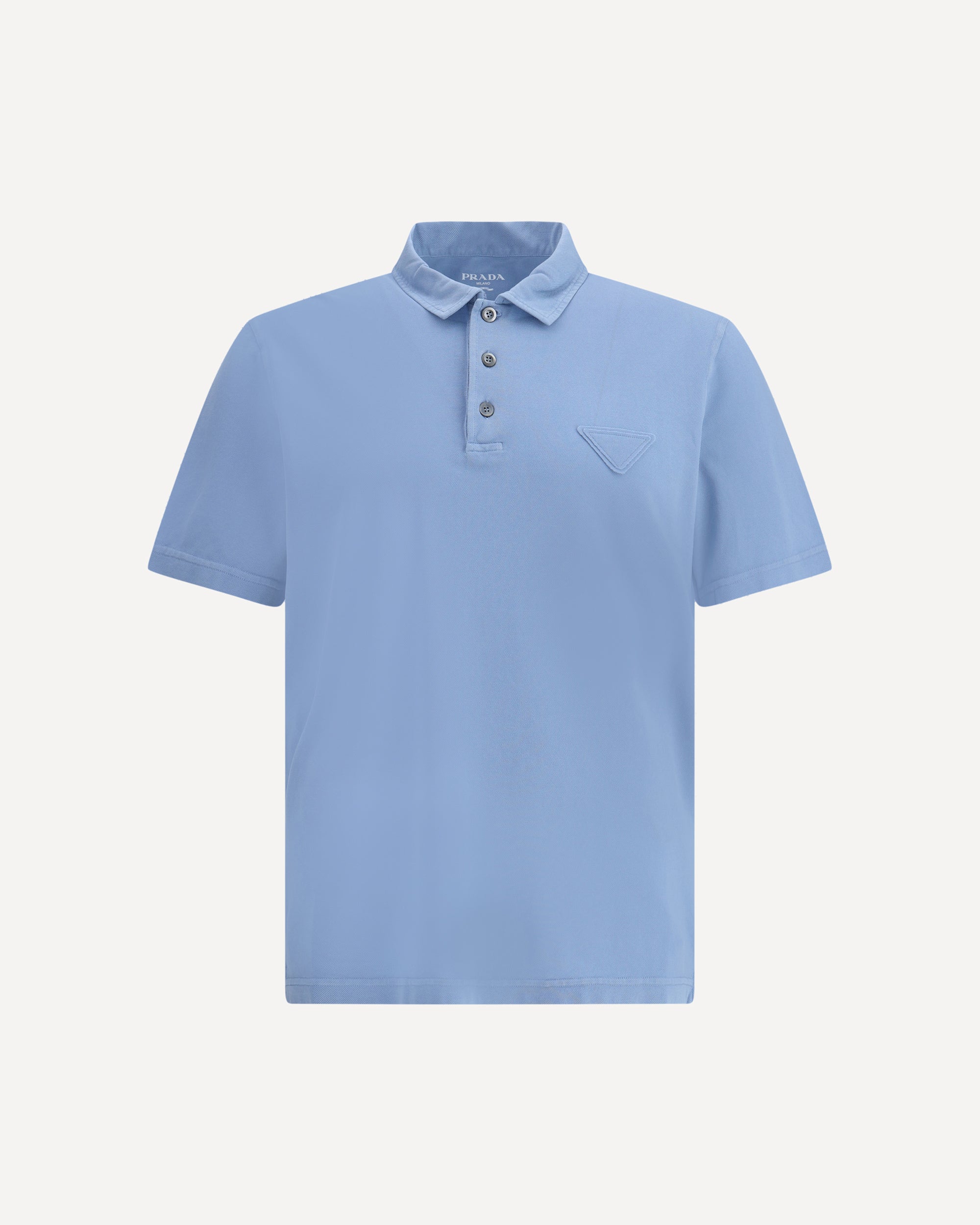 Maglia Polo in cotone di Prada, caratterizzata da un colletto classico e una chiusura frontale con bottoncini. Il design essenziale è arricchito dall’iconica patch triangolare applicata sul fronte, simbolo distintivo del brand. Perfetta per un look elegante e raffinato.