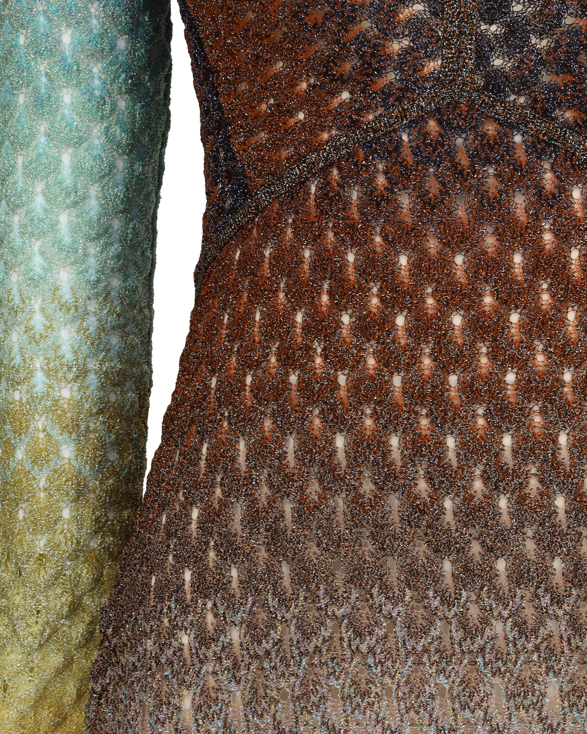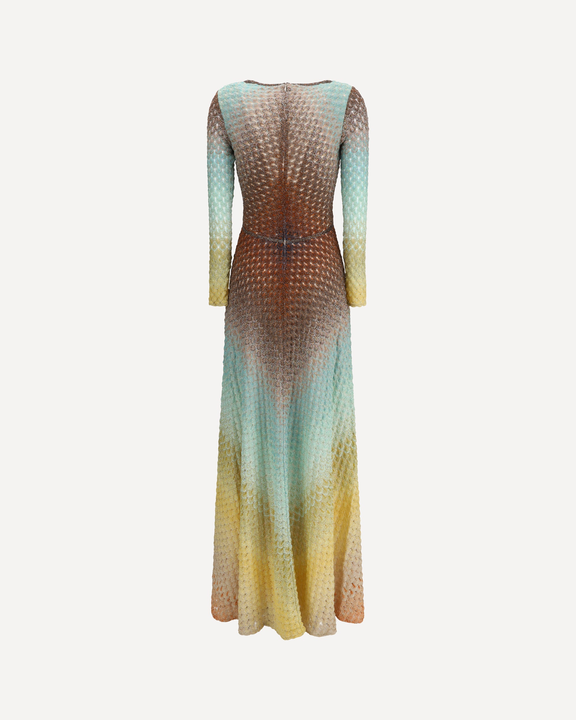 L’Abito lungo in lurex di Missoni è realizzato in un raffinato misto viscosa arricchito da fili in lurex che donano brillantezza e movimento. Caratterizzato da una profonda scollatura a V, presenta una chiusura con zip a scomparsa sul retro e un fondo svasato che conferisce leggerezza e fluidità alla silhouette.