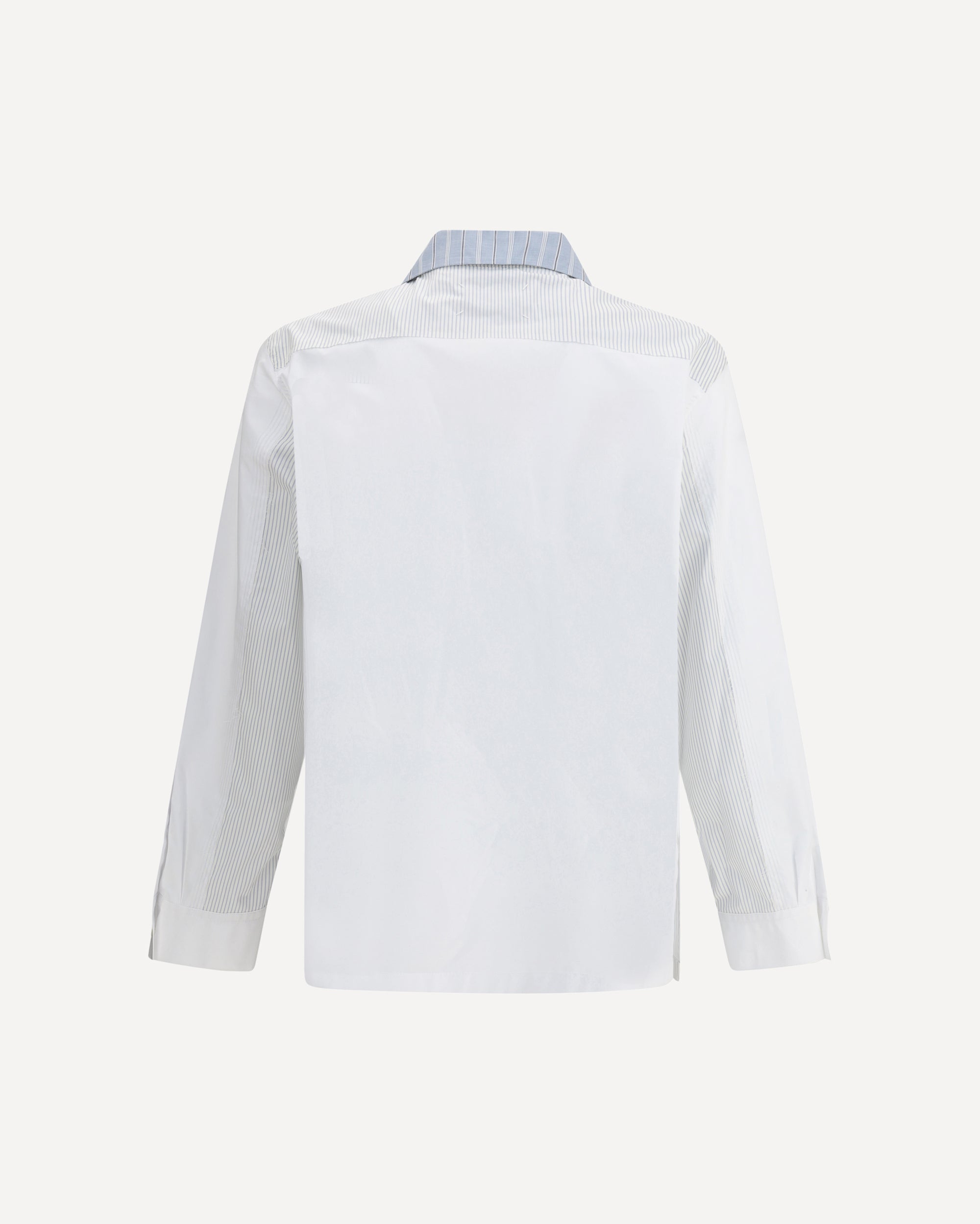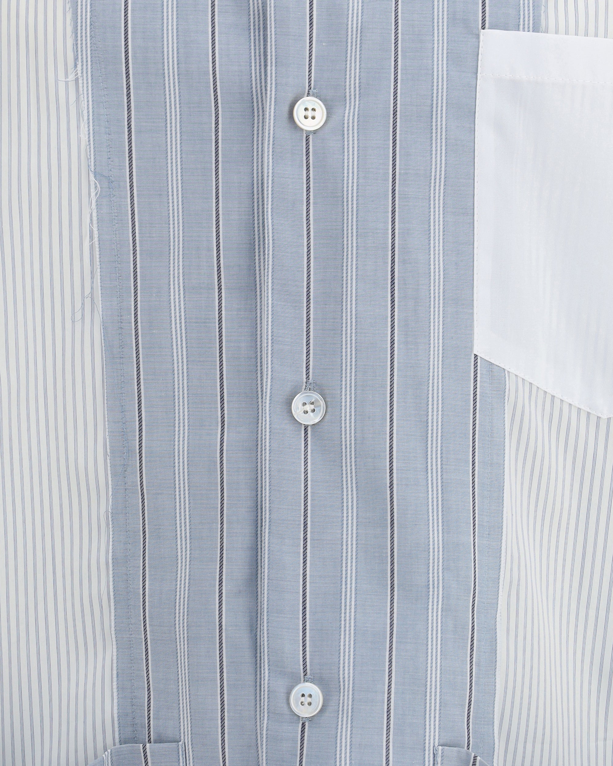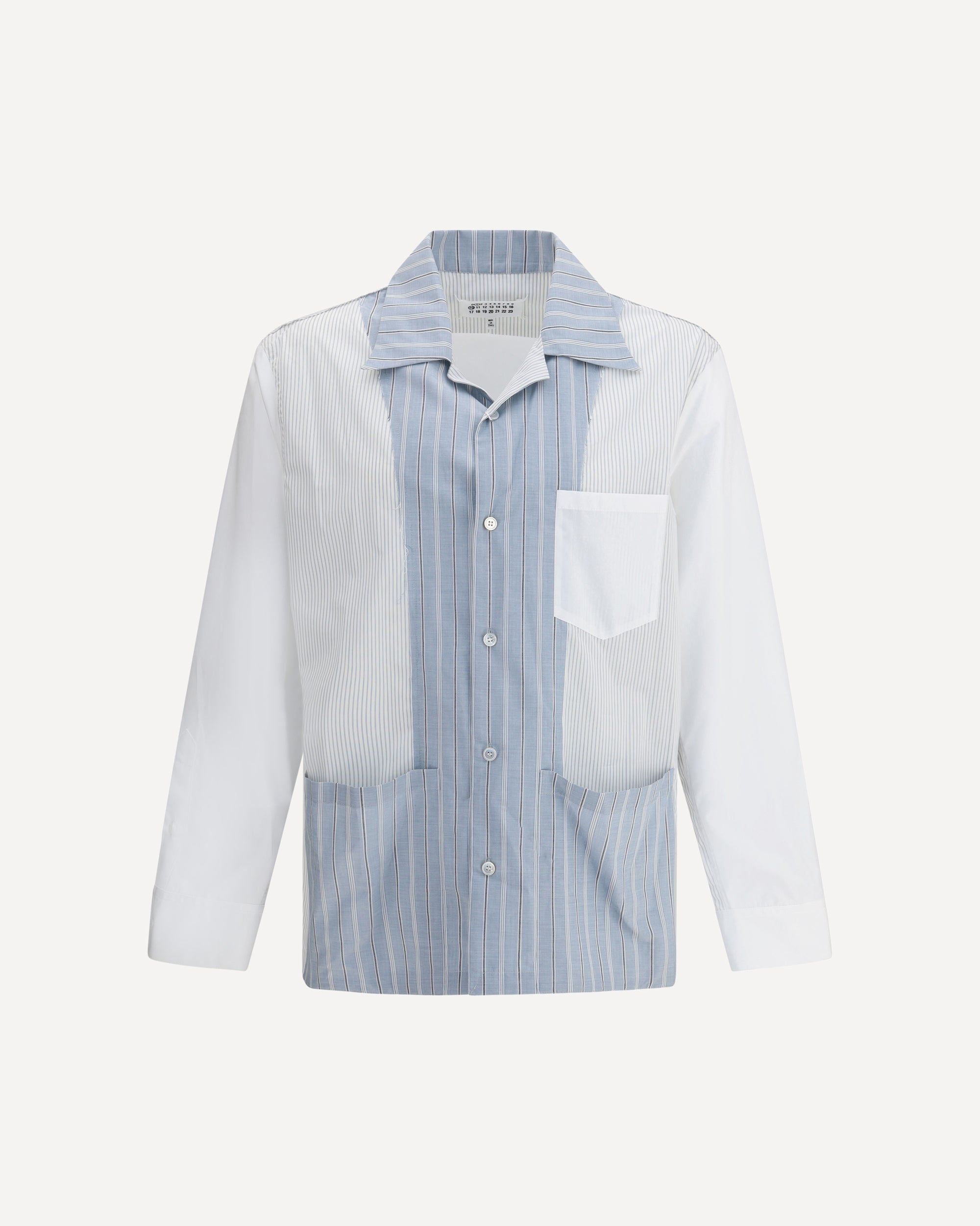 La Camicia patchwork di Margiela fonde spirito rétro e decostruzione contemporanea. Caratterizzata da una stampa a strisce verticali dal gusto eclettico, presenta una chiusura frontale con bottoni, una tasca applicata sul petto e due tasche aggiuntive sul fronte. Il colletto hawaiano completa il look con un tocco disinvolto, in perfetto stile Margiela.