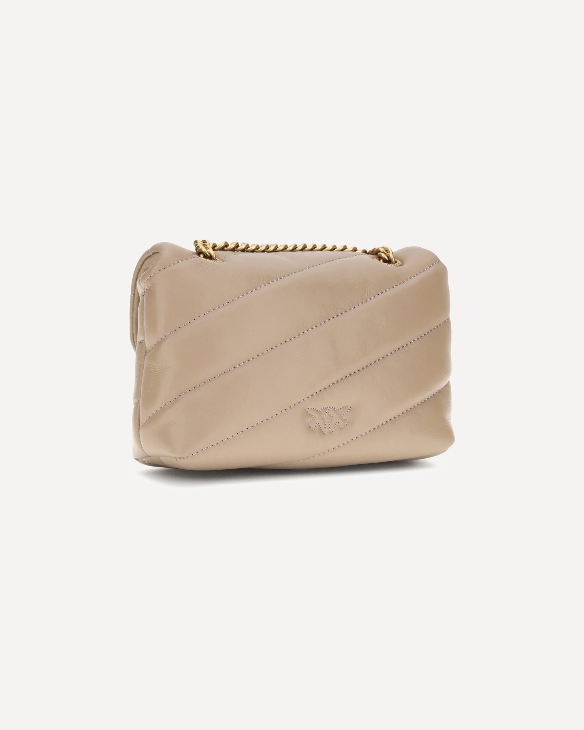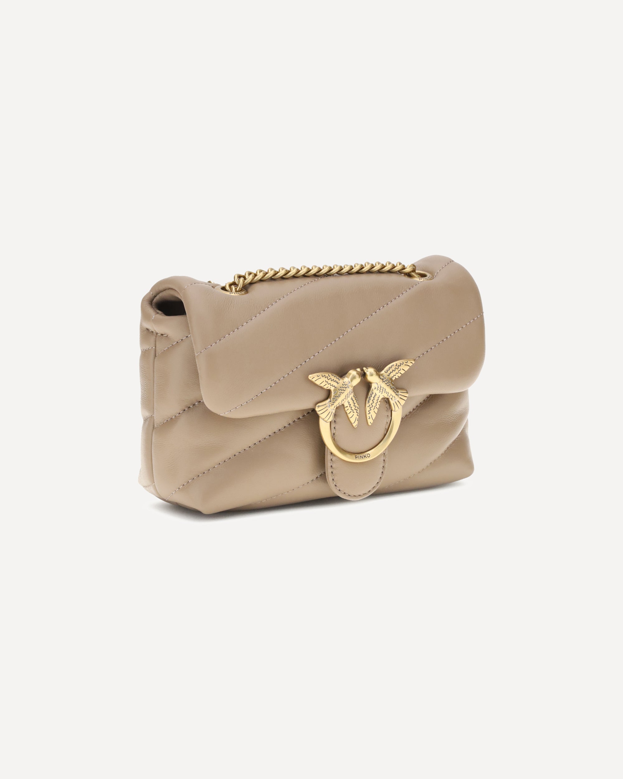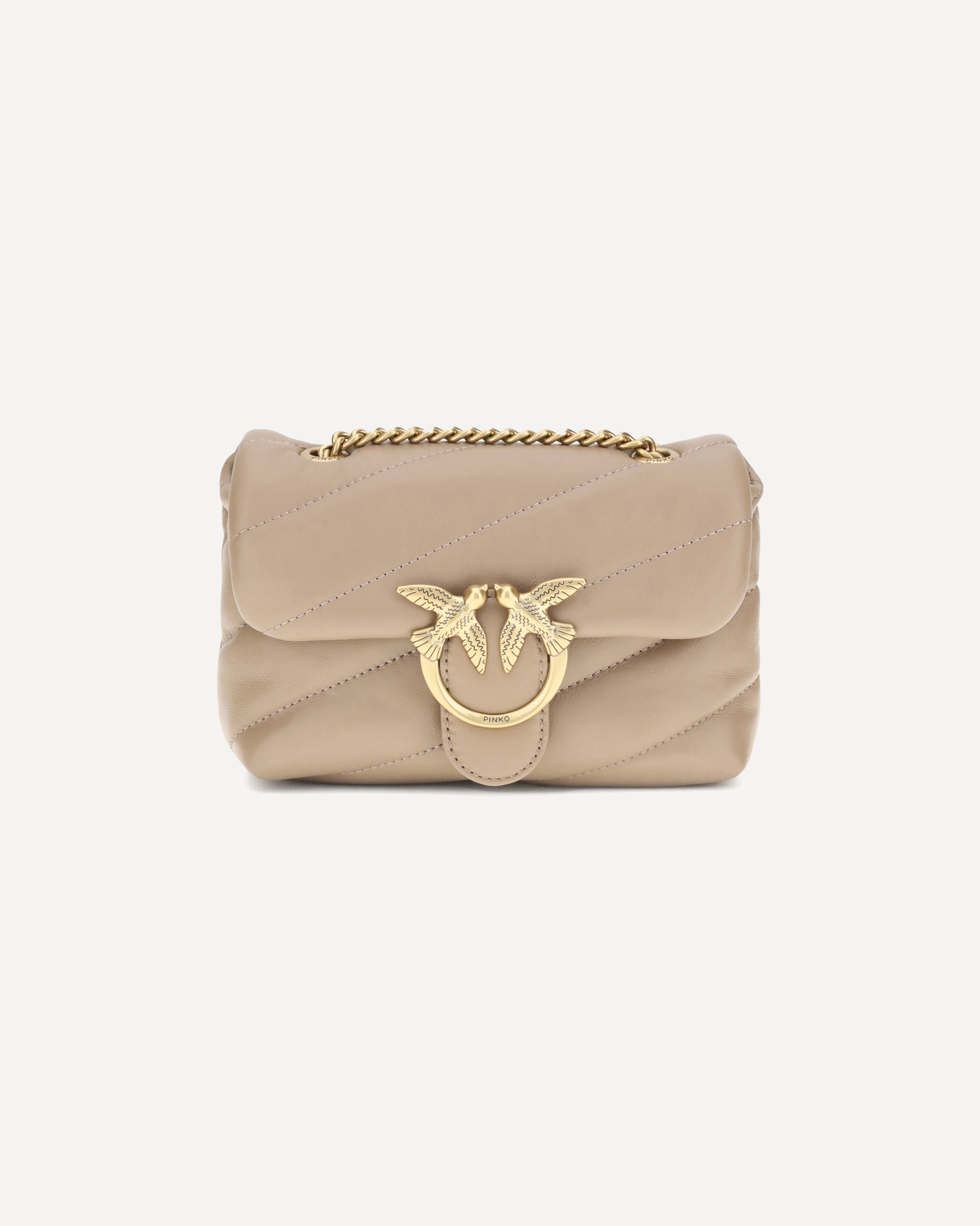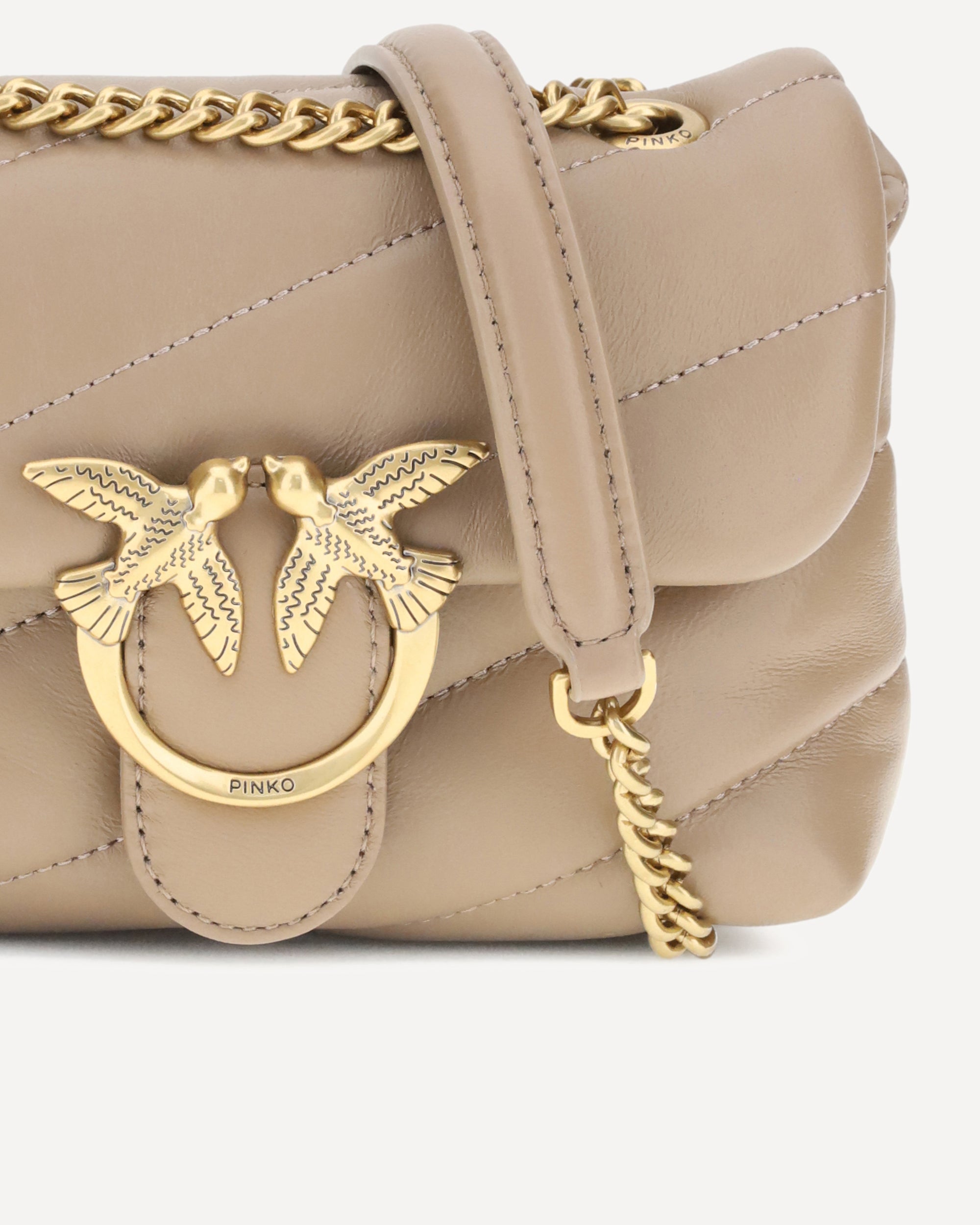 La Borsa a Tracolla Love Baby in Pelle di Pinko, chiusura frontale con bottone magnetico, iconico logo Love Birds placcato oro e applicato in rilievo sul fronte, design trapuntato e imbottito, doppio scomparto interno, tracolla a catena scorrevole, iconico monogramma brand ricamato tono su tono sul retro.