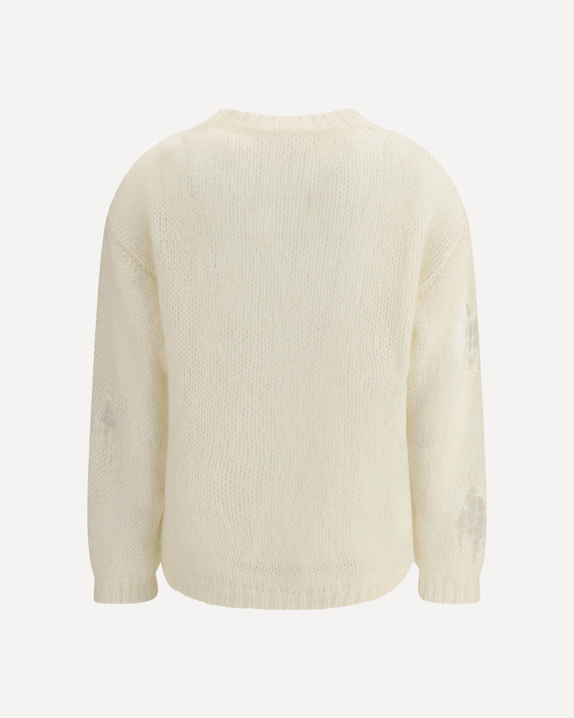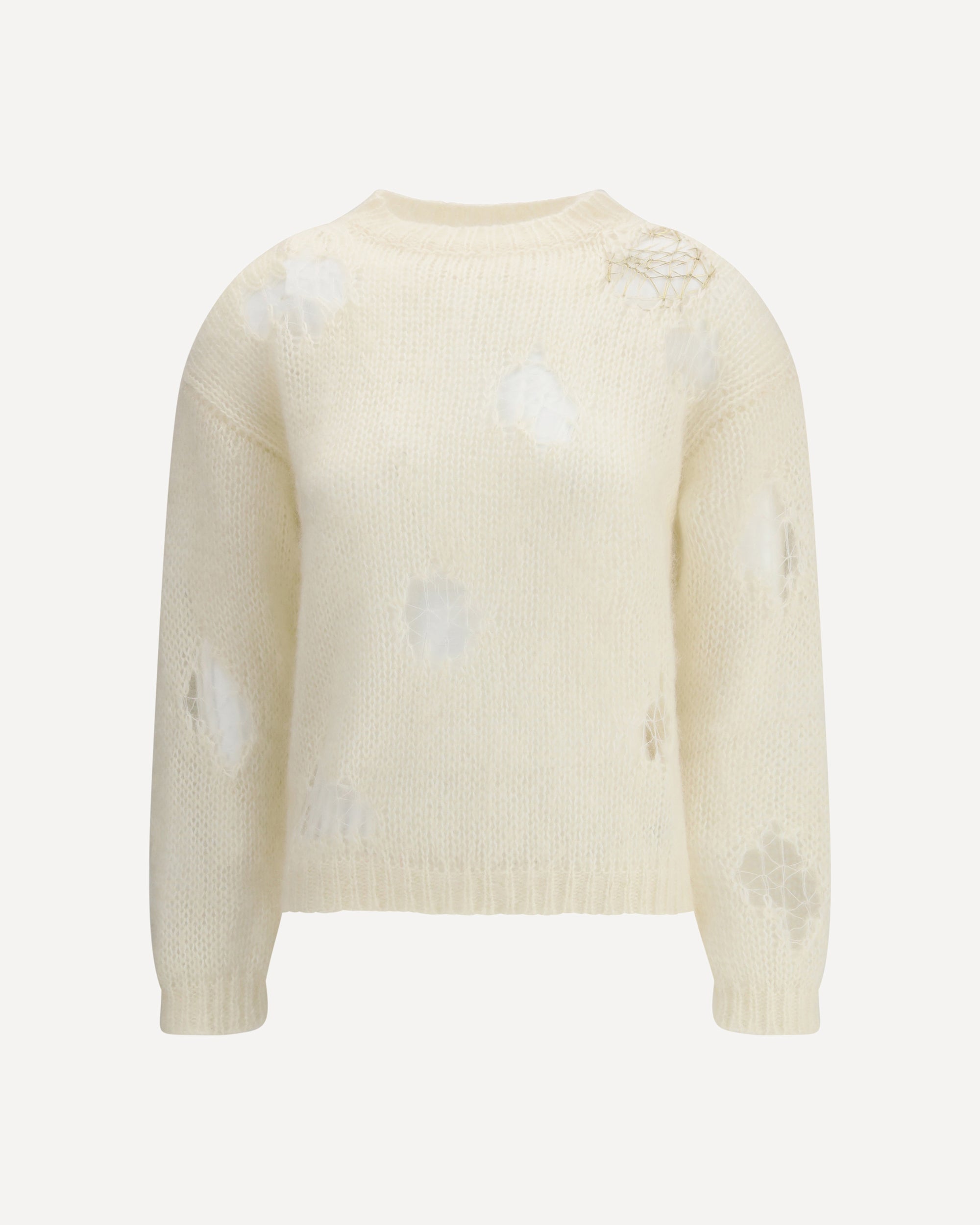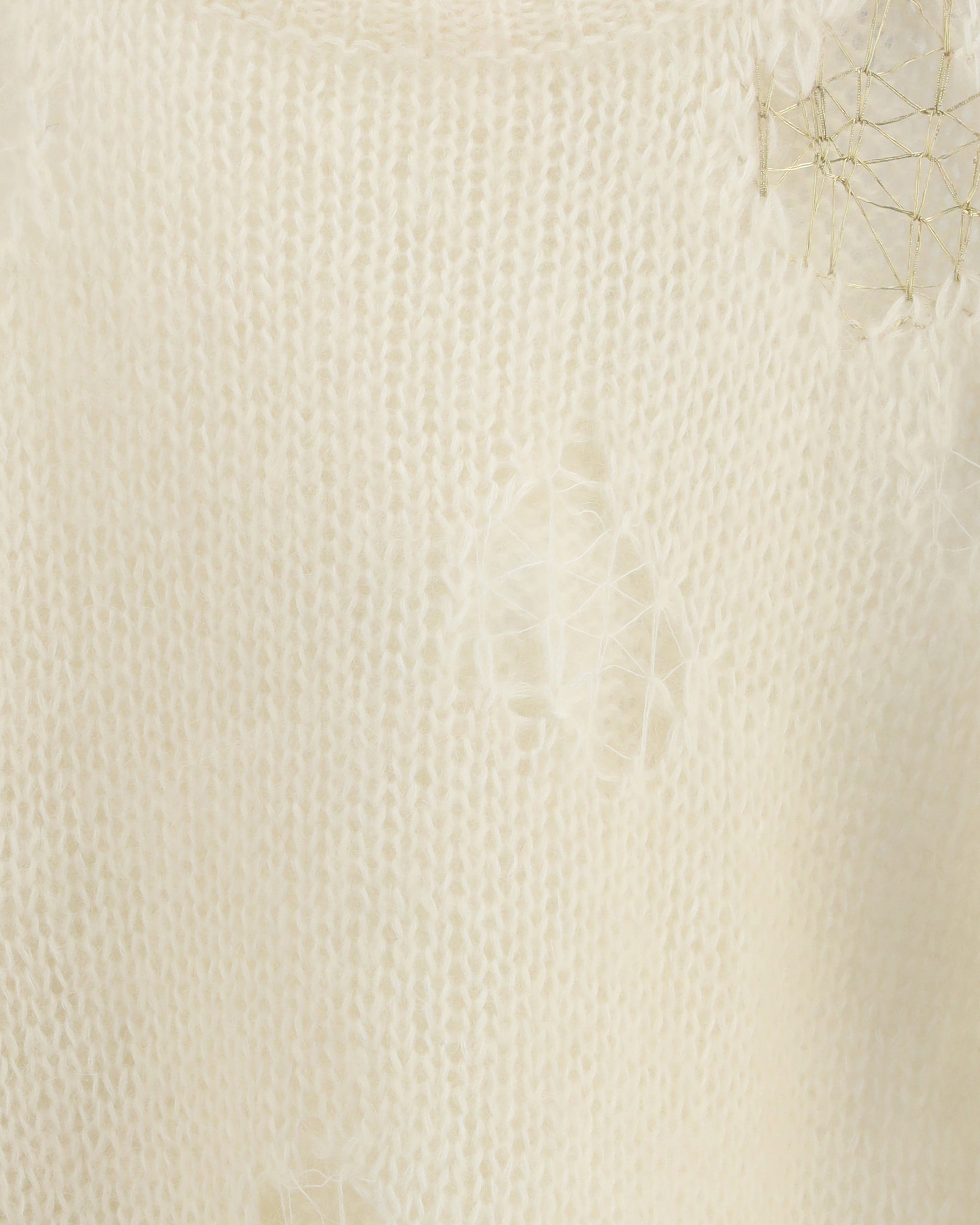 Il Maglione in lana mohair di Fabiana Filippi reinterpreta l'eleganza in chiave contemporanea, con un equilibrio tra delicatezza e audacia. Caratterizzato da uno scollo a barca a coste, presenta polsini e orlo anch’essi a coste, per un finish curato e strutturato. Gli strappi all-over, cifra stilistica audace e moderna, conferiscono al capo un’aria vissuta ma sofisticata; uno di questi è impreziosito da un filato dorato, discreto richiamo alla luminosità tipica del brand. Un capo dall'anima grintosa e raffinata, perfetto per chi ama distinguersi con classe.