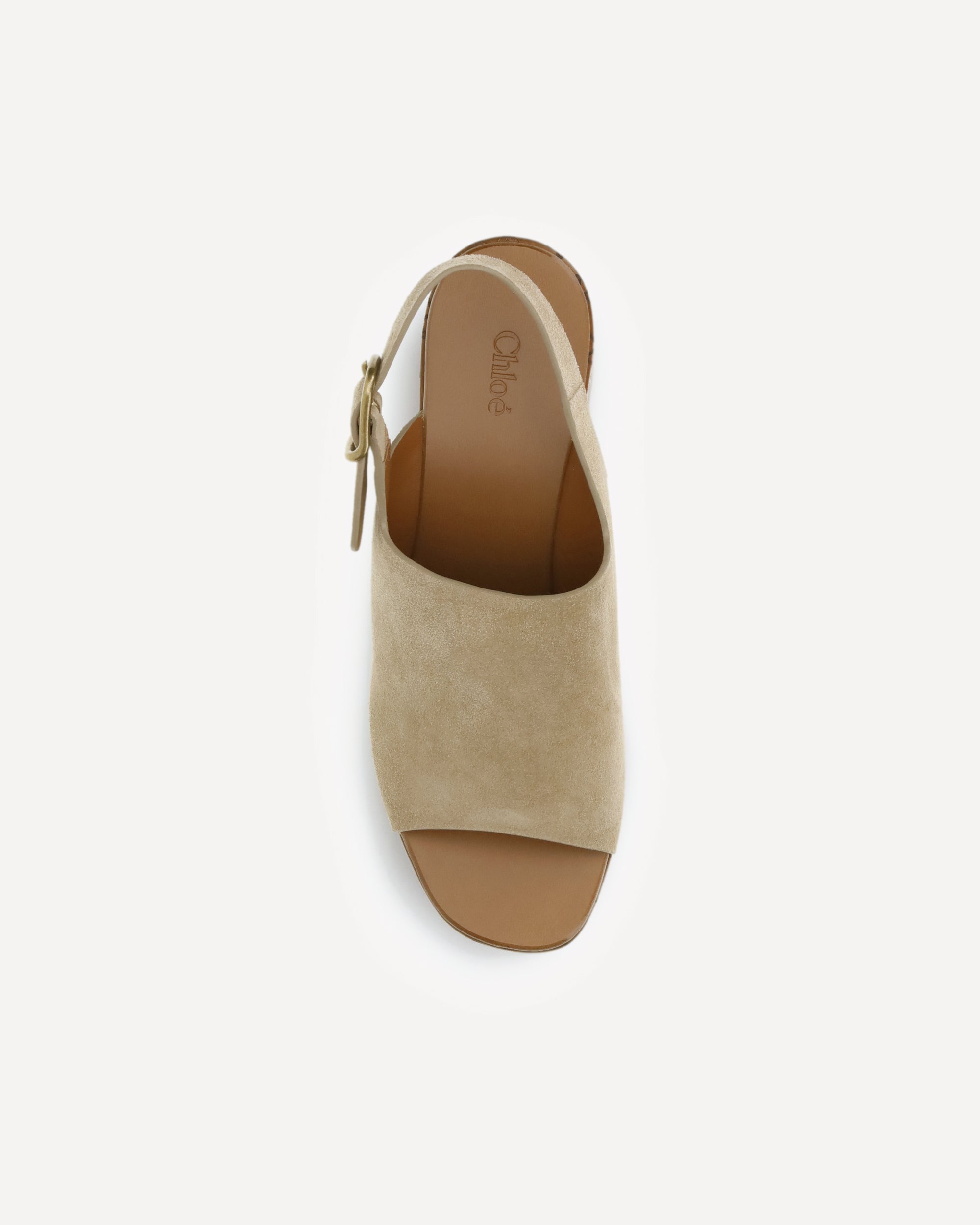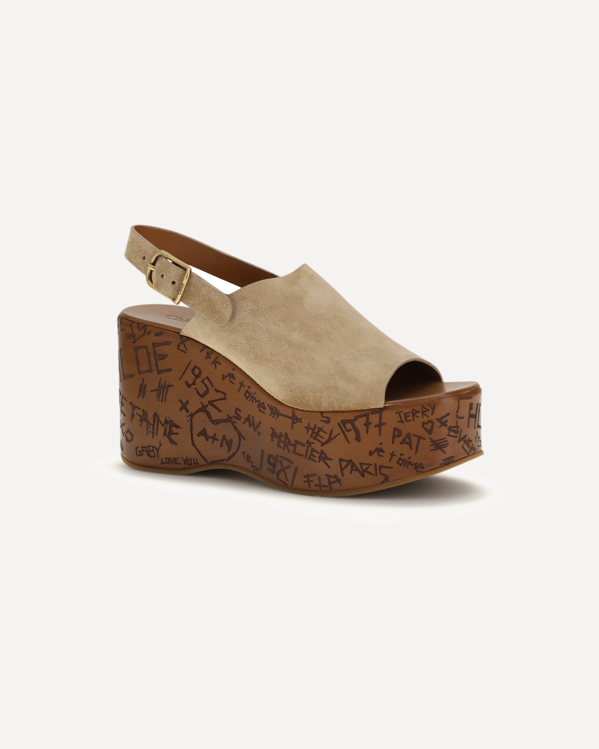 I Sandali con zeppa Maxime di Chloé sono la versione più bassa della linea e presentano una tomaia aperta sul davanti in morbida pelle di vitello scamosciata, abbinata a un plateau con zeppa dall’effetto legno. La suola richiama l’eredità della Maison con un motivo che evoca una dichiarazione d’amore incisa sulla corteccia di un albero, mentre la fibbia laterale con incisione Chloé assicura una calzata confortevole e regolabile. La chiusura con fibbia completa il design, unendo stile e praticità.