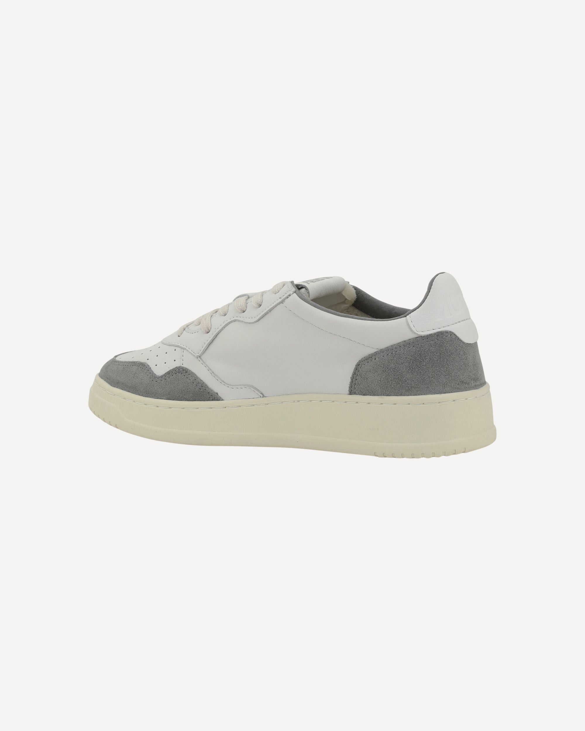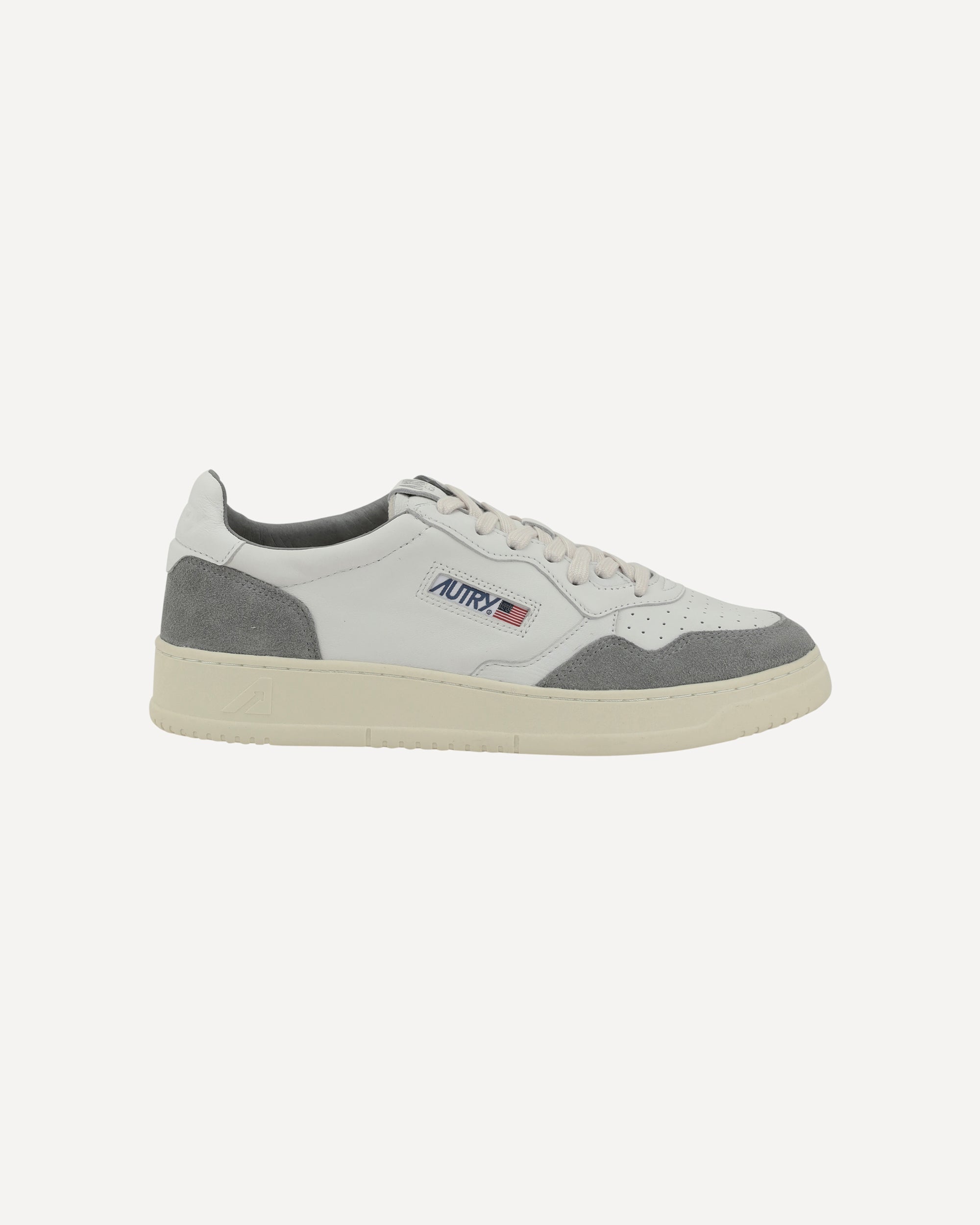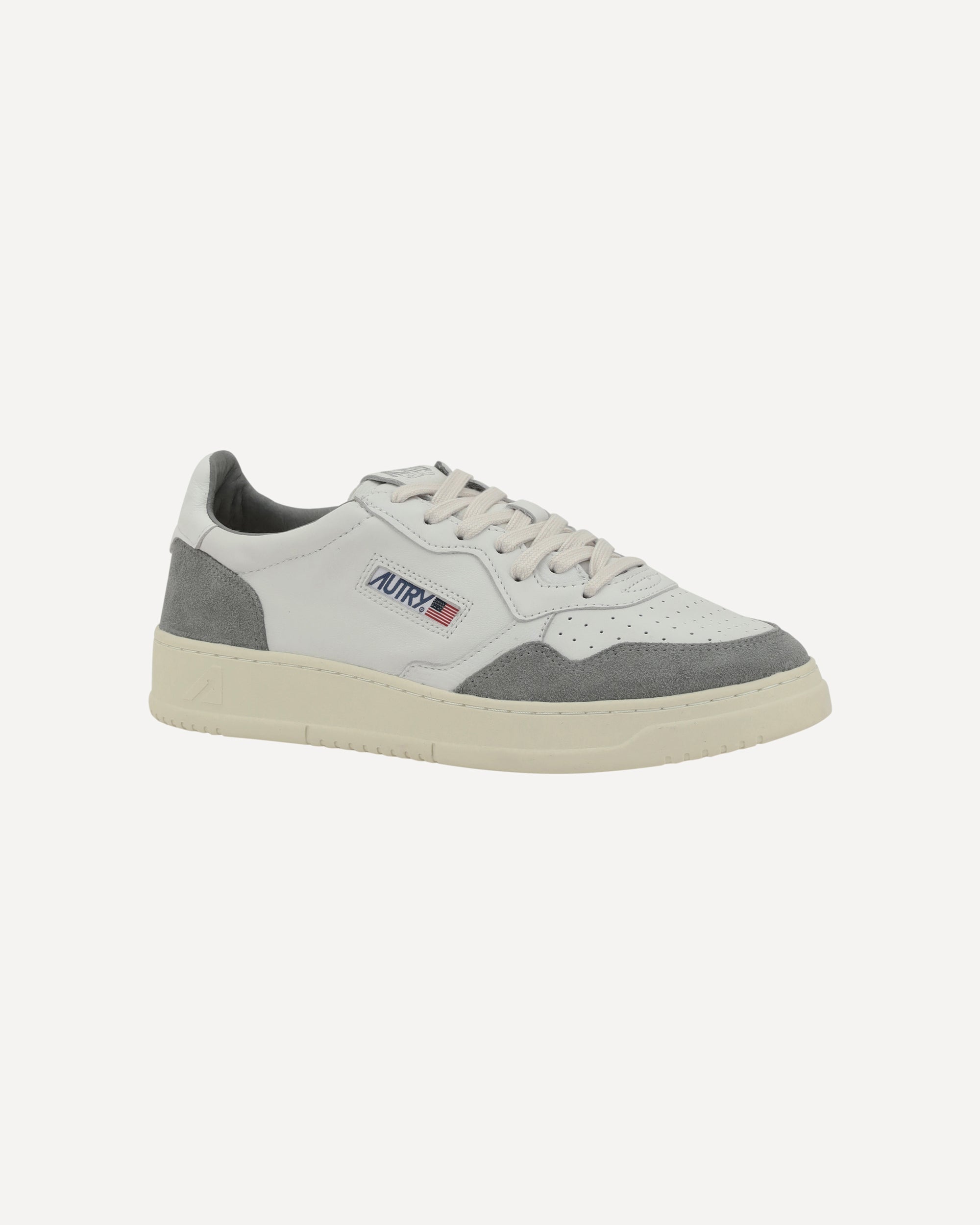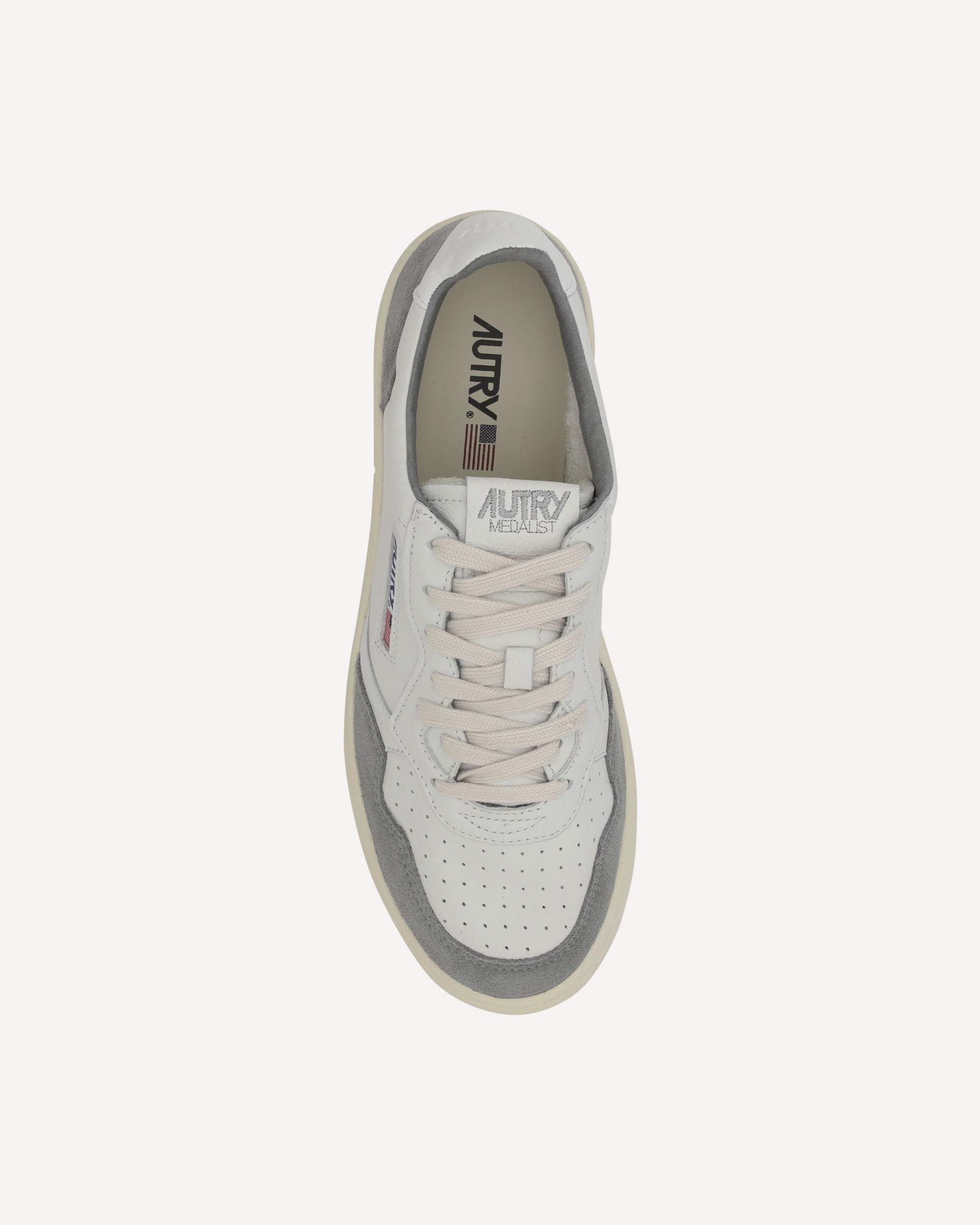 Sneakers Medalist Low in pelle di Autry, con punta tonda traforata per una maggiore traspirabilità. La chiusura frontale è con lacci, mentre la linguetta in pelle presenta un patch logato. L'iconico talloncino sul retro, a contrasto, è decorato con il logo stampato a pressione. La firma e il logo del brand sono visibili sul pannello laterale esterno, completando il design distintivo e casual.