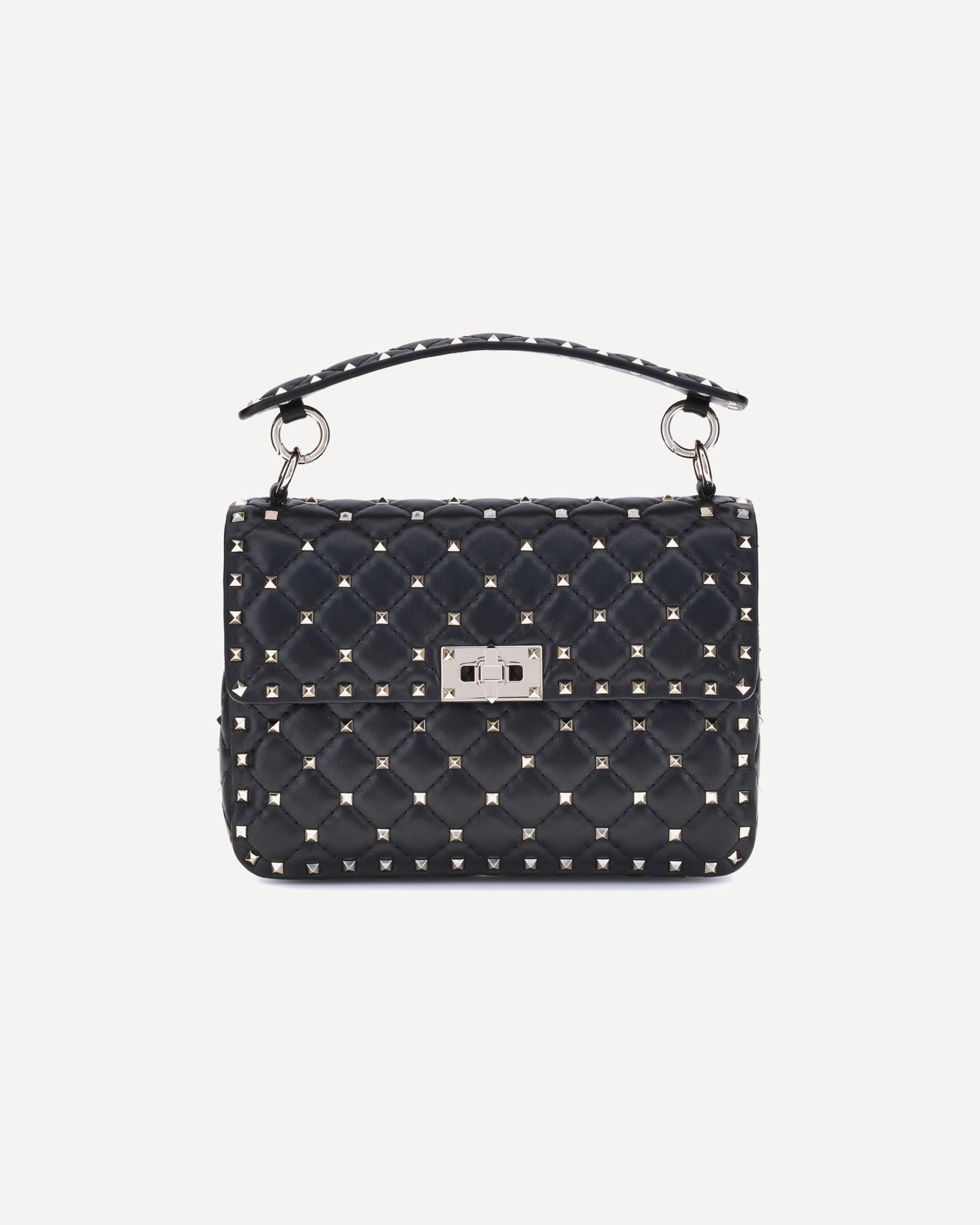 La Borsa a Tracolla Rockstud Spike media di Valentino Garavani è un modello iconico dal carattere deciso, realizzato in pelle trapuntata a rombi e decorata con borchie Rockstud a finitura oro su tutta la superficie. Dotata di manico superiore in pelle nera con borchie removibile e tracolla regolabile in pelle liscia, unisce stile e praticità. L'interno, ben organizzato, presenta due tasche con zip e tre fessure per carte. La chiusura frontale con patta e girello completa il design con un tocco sofisticato.