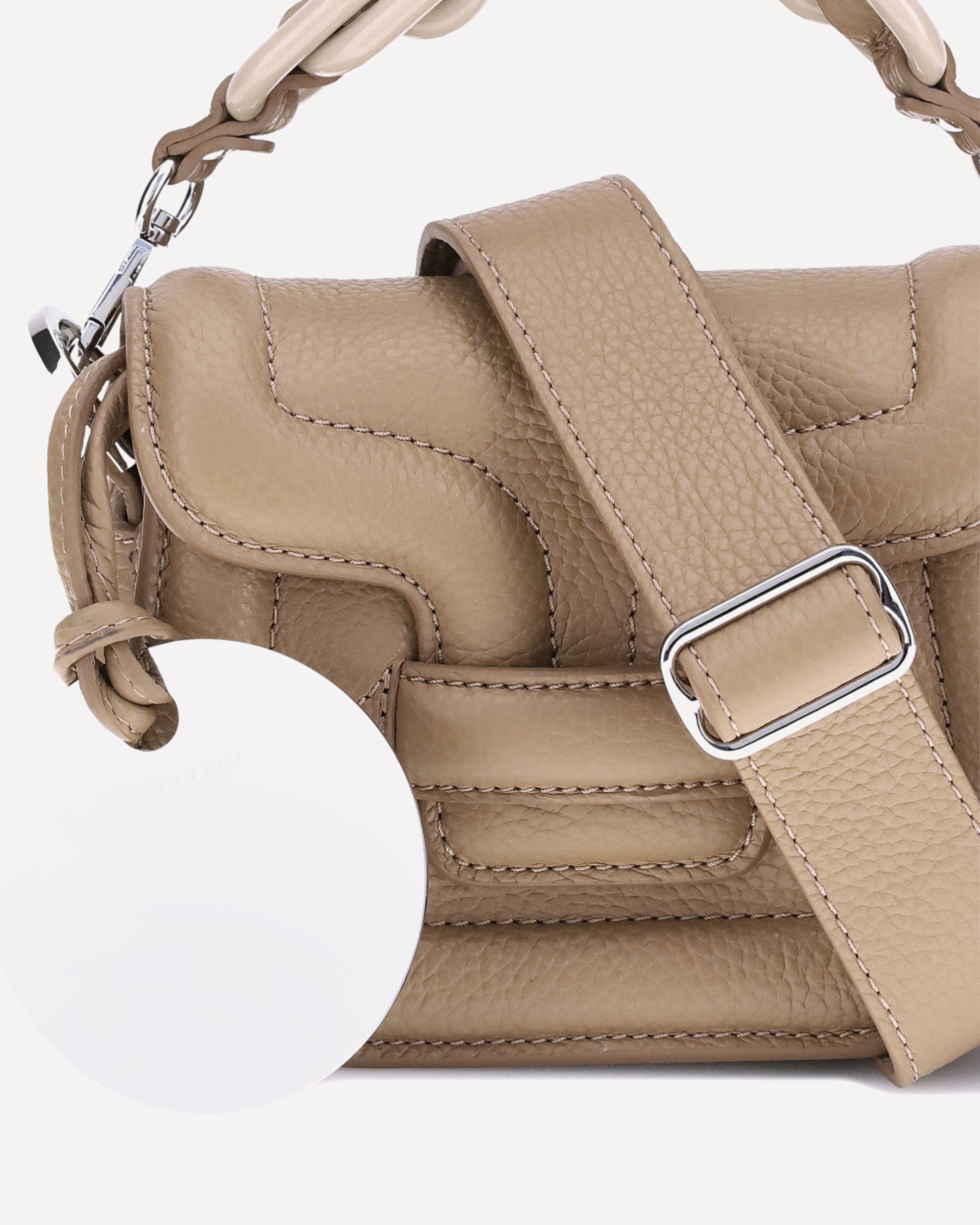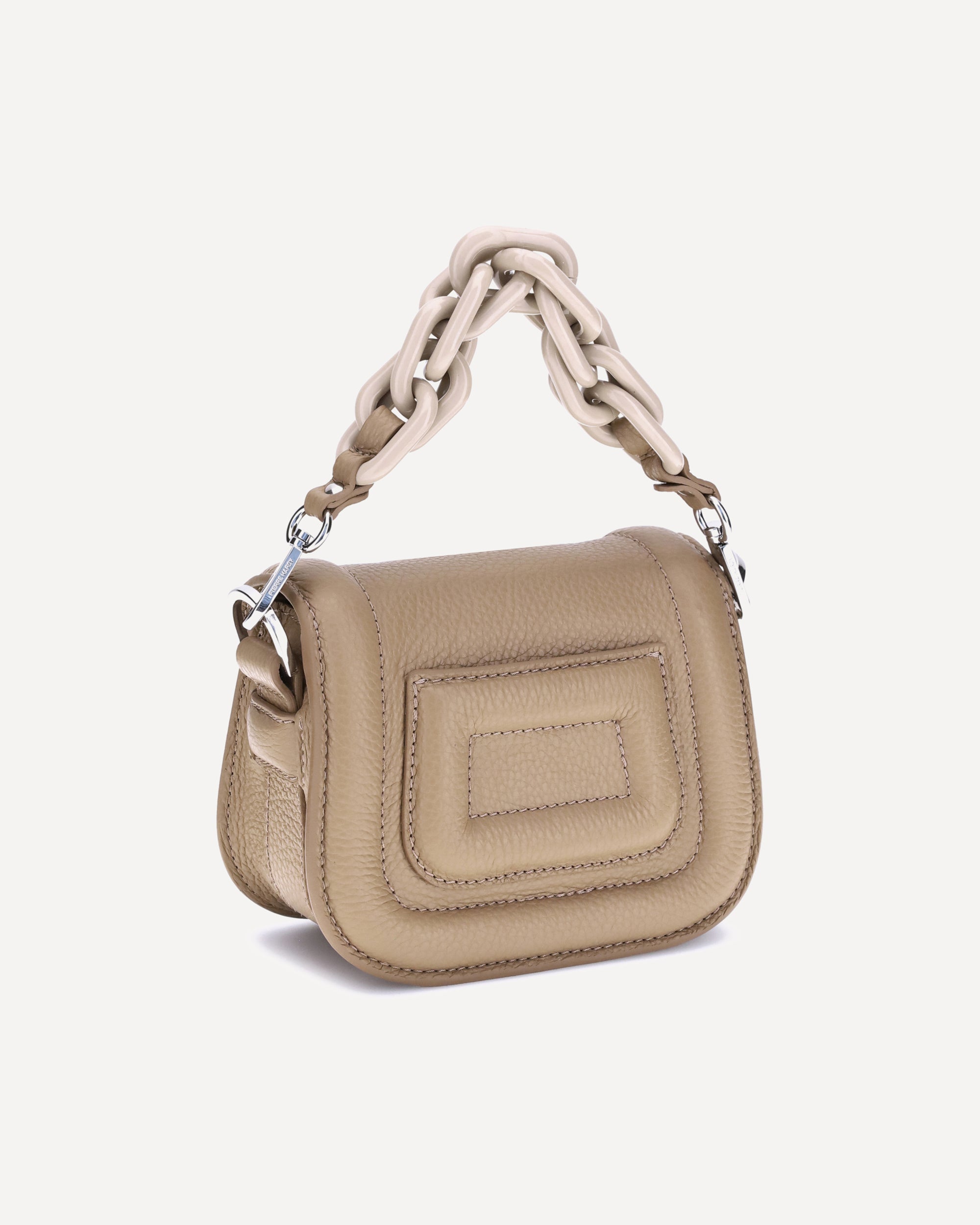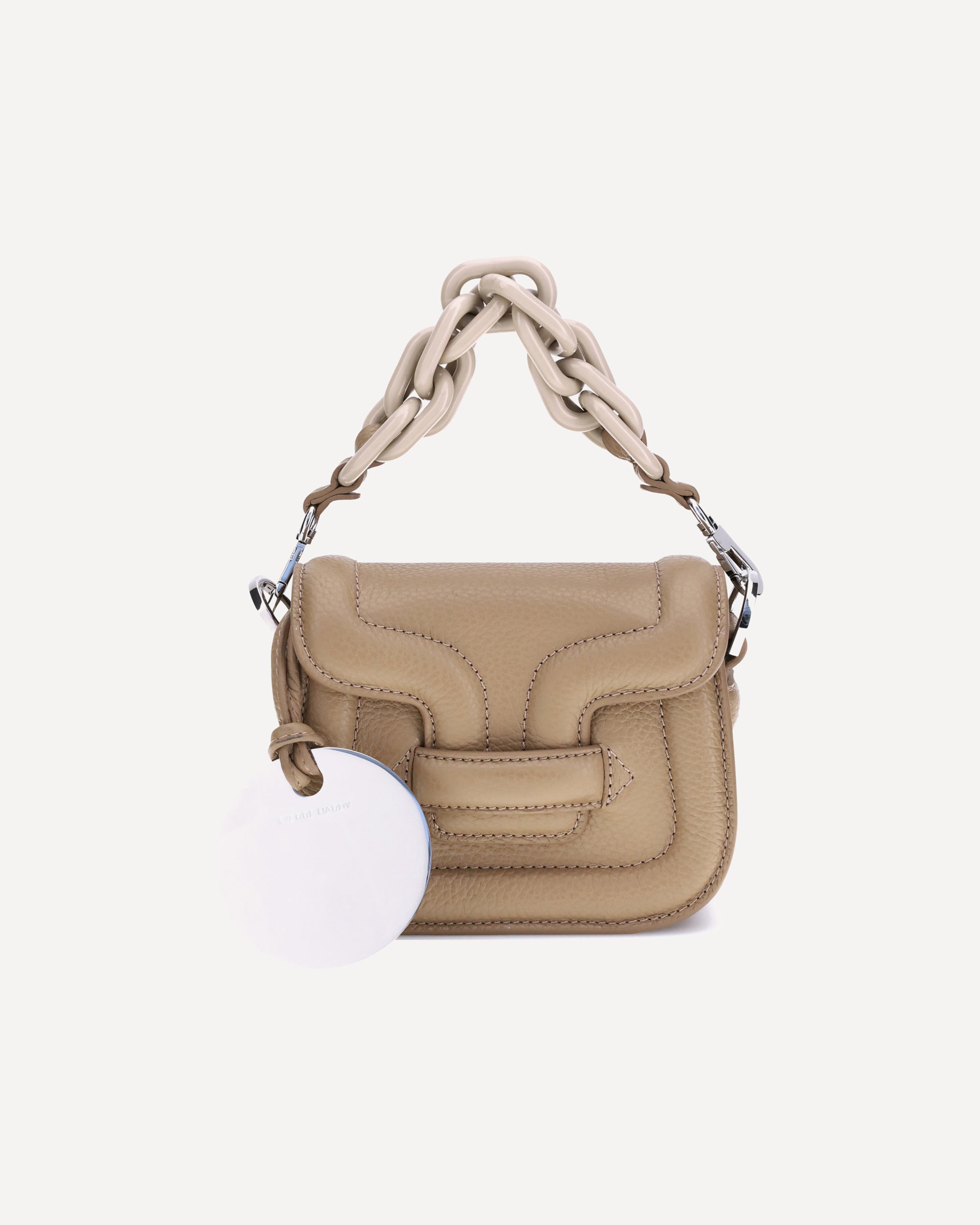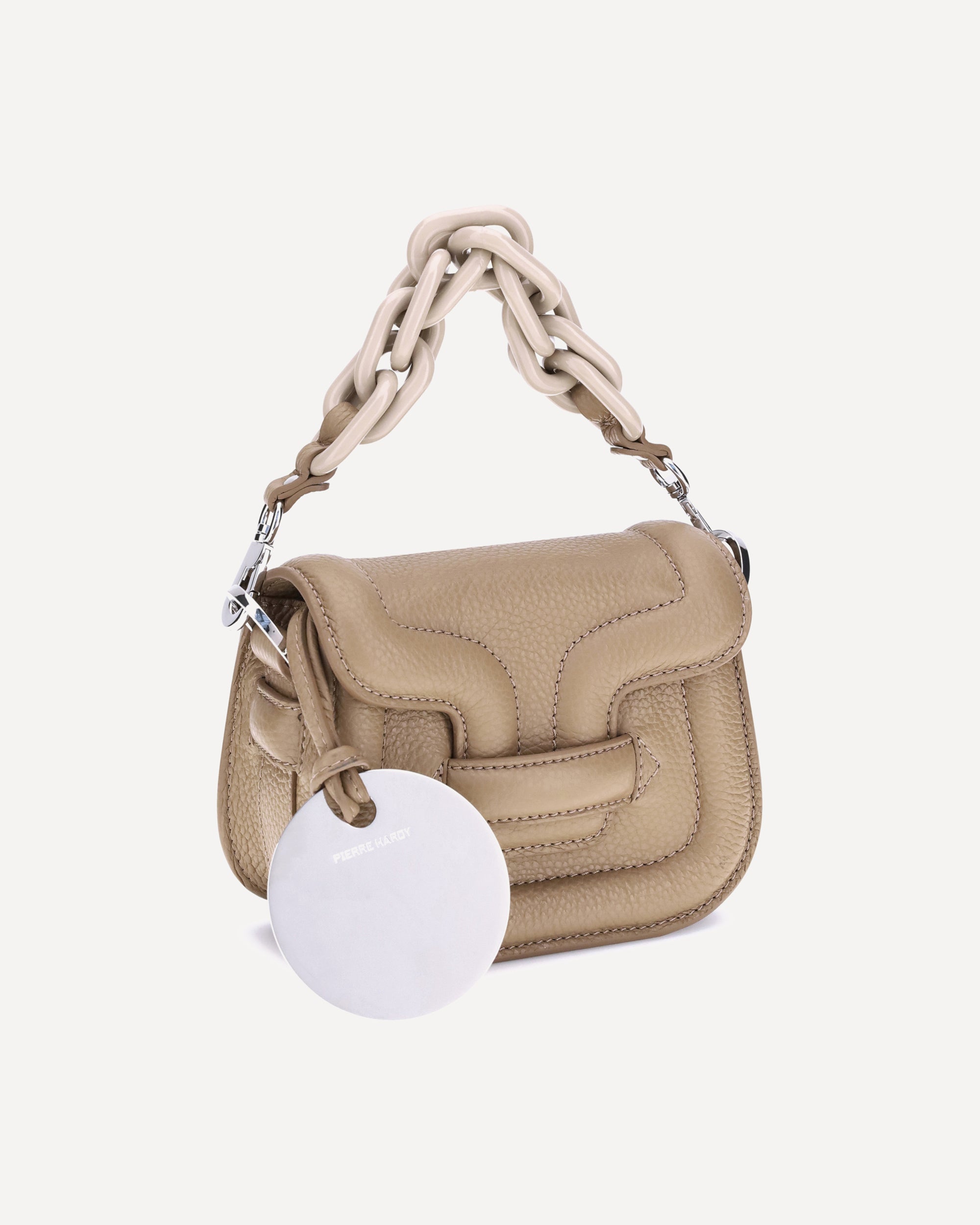 La Borsa a Mano Alphaville in pelle di Pierre Hardy combina eleganza grafica e funzionalità moderna. Dotata di un manico superiore con catena abbinata, presenta una tasca frontale con pattina a incastro e una tasca a fessura sul retro. La tracolla piatta, regolabile e removibile, consente un uso versatile. La chiusura con bottone magnetico apre a un interno ben organizzato con due tasche a fessura, ideale per tenere in ordine gli oggetti essenziali. Un accessorio sofisticato, perfetto per completare look sia da giorno che da sera.