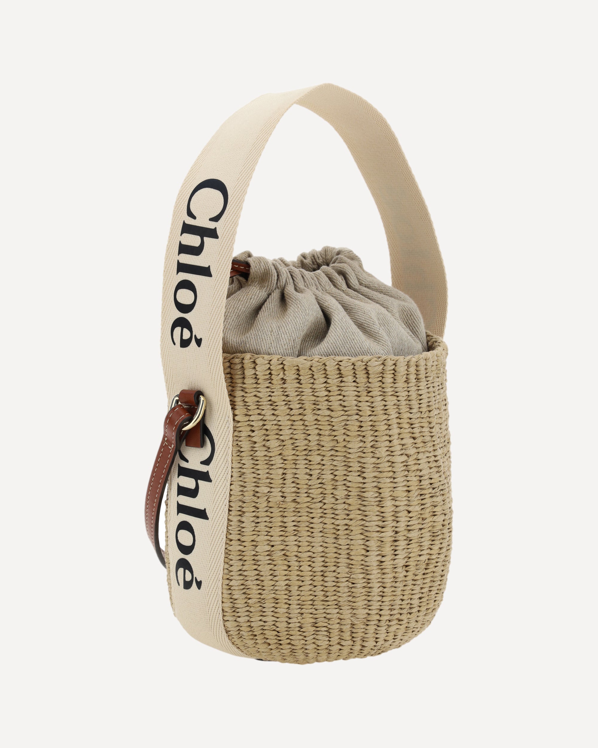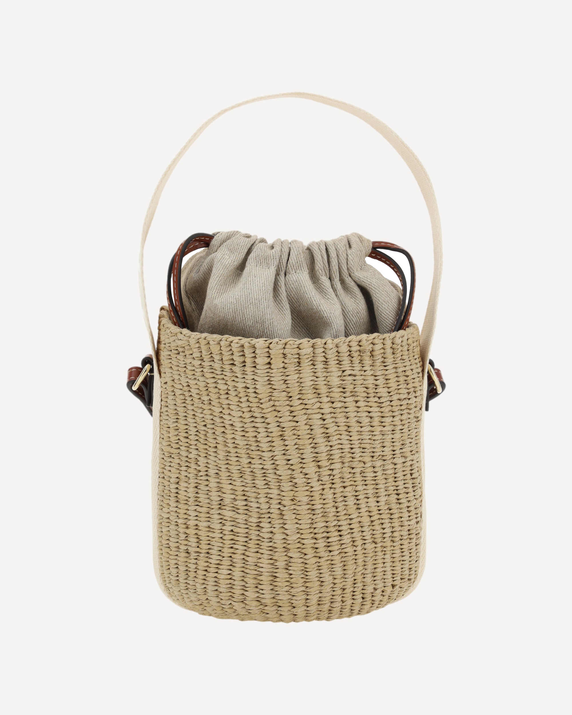La Borsa a Secchiello Mifuko di Chloé unisce artigianalità e stile contemporaneo. Realizzata in rafia, presenta un sacchetto interno con chiusura a coulisse, manico in cotone con logo ripetuto a contrasto e tracolla fissa in pelle. Una tasca in pelle a filetto con logo stampato a pressione completa il design, rendendo l’accessorio pratico e distintivo.