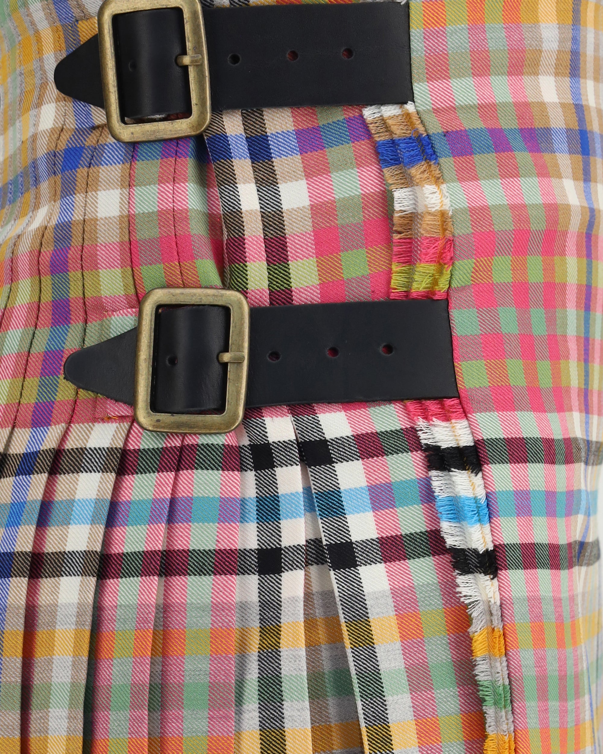 La Gonna Heather Kilt mini a quadri di Vivienne Westwood incarna l’iconico equilibrio del marchio tra eredità punk e sartorialità scultorea. Realizzata in morbida lana a quadri scozzesi, presenta vita alta e costruzione a pieghe che definiscono una silhouette strutturata ma dinamica. I cinturini laterali in pelle con fibbia e la fascia elastica in jacquard con logo introducono elementi distintivi che richiamano il linguaggio ribelle e sofisticato della maison. Il taglio leggermente svasato completa il design con un’attitudine contemporanea e decisa.