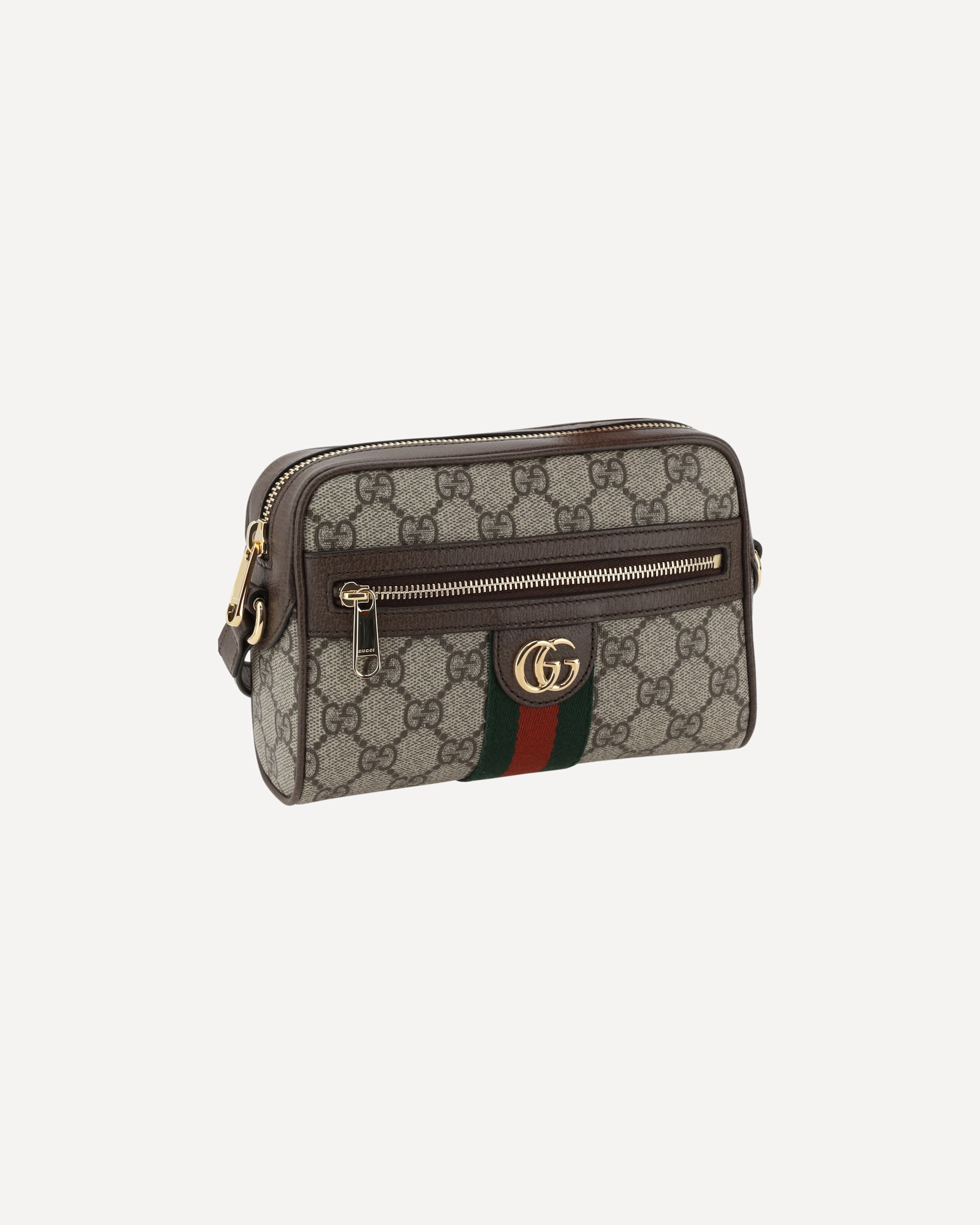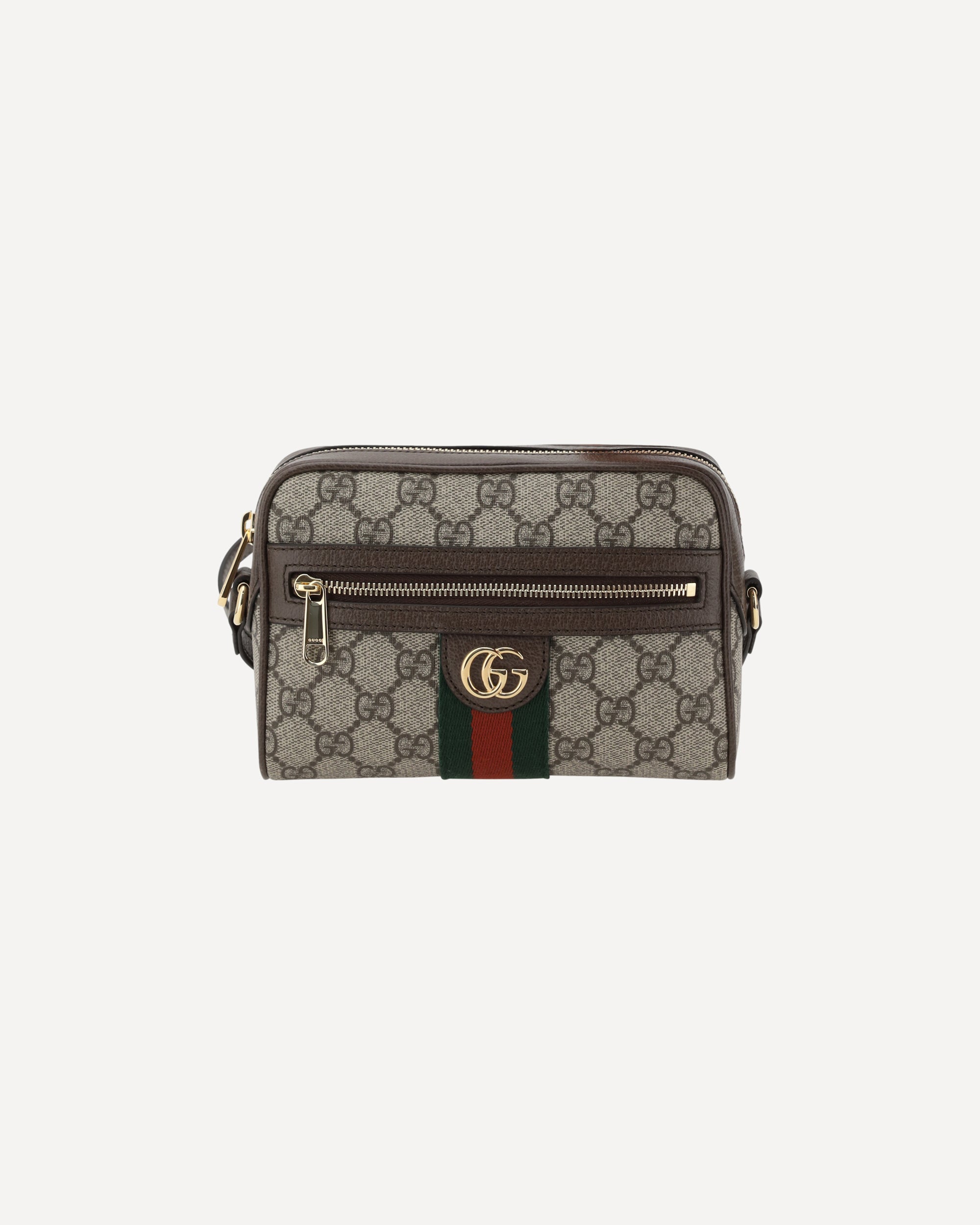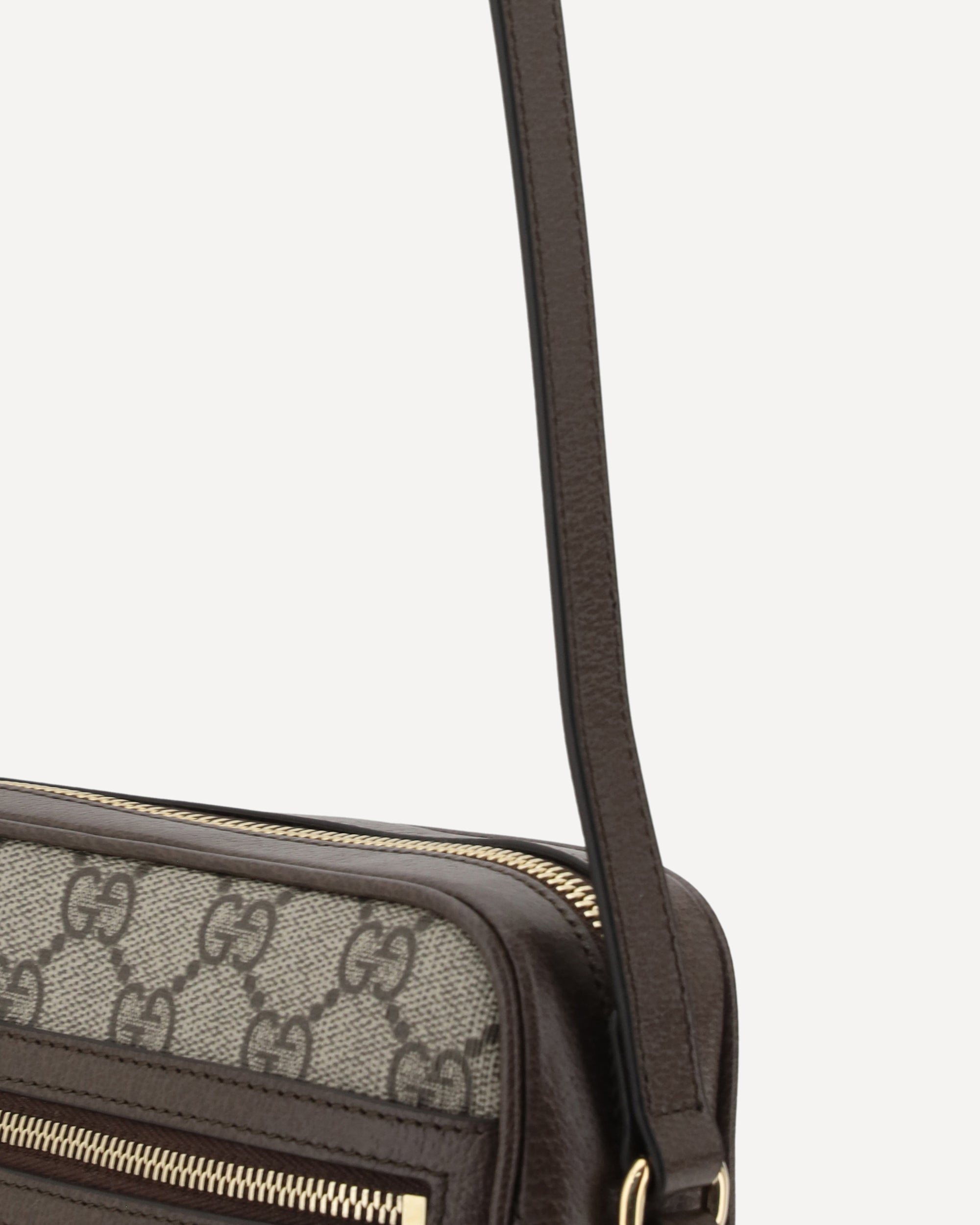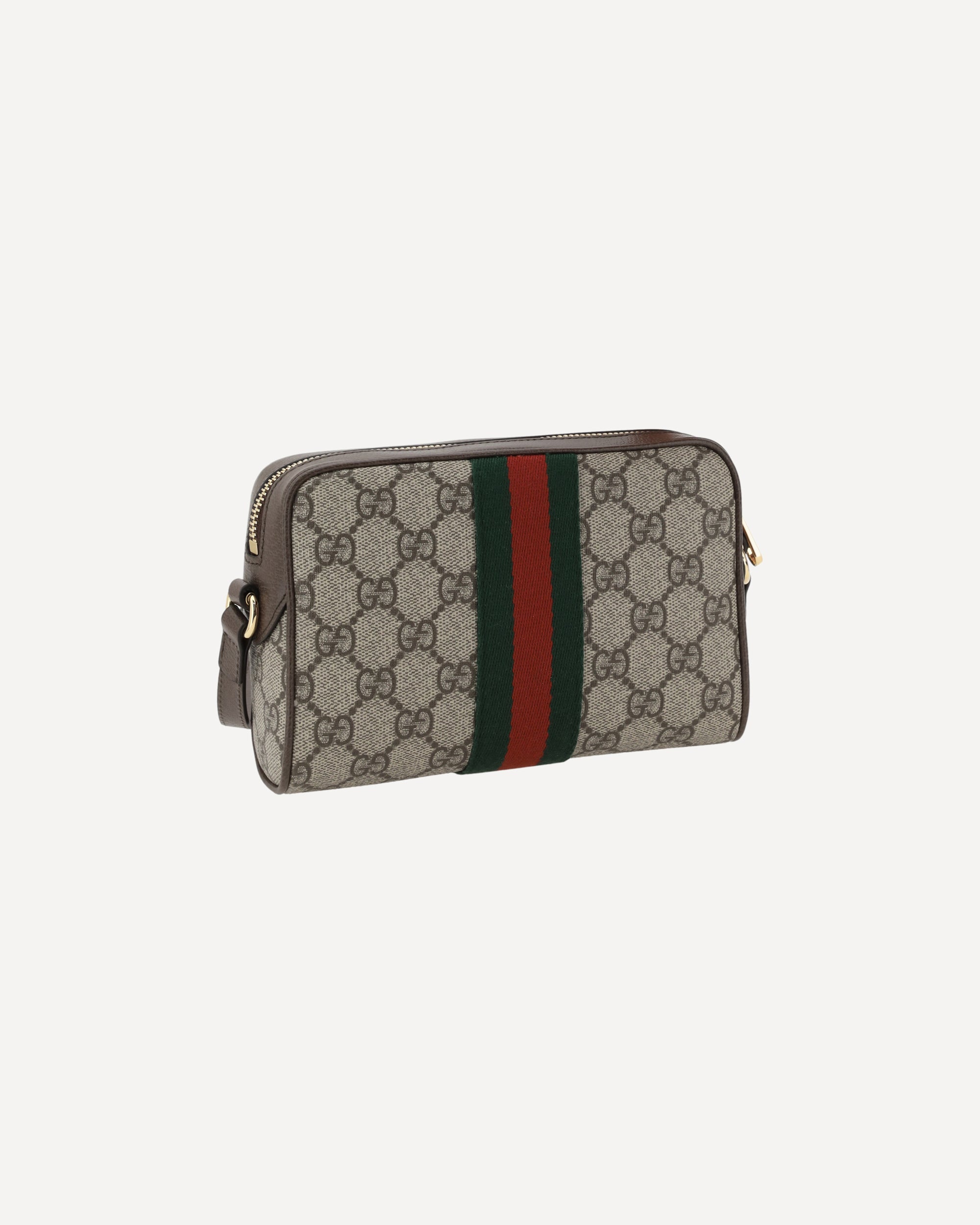 La borsa a tracolla mini Ophidia di Gucci è un accessorio elegante e versatile, realizzato in tessuto GG Supreme con finiture in pelle di alta qualità. La tracolla regolabile permette di adattarla facilmente a diverse lunghezze, mentre la chiusura superiore con cerniera garantisce praticità e sicurezza. Una tasca a filetto con cerniera frontale offre spazio extra per piccoli oggetti, mantenendo l'ordine all'interno. L'iconica placca metallica GG applicata sul fronte aggiunge un tocco distintivo e di lusso, mentre il dettaglio del nastro webbing con le bande colorate, applicato sul fronte e retro, conferisce un accento vibrante e riconoscibile, tipico dello stile distintivo di Gucci.