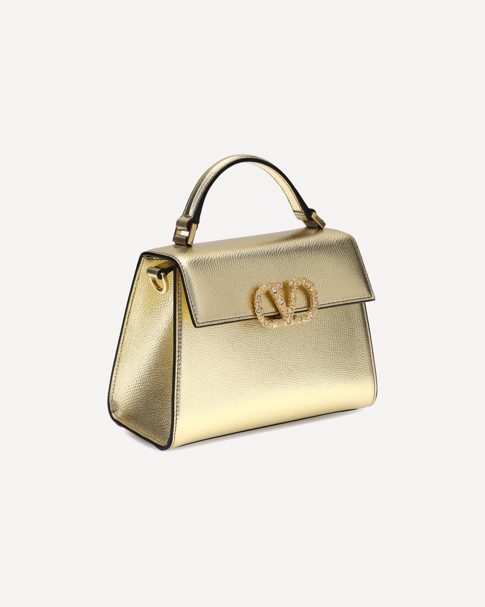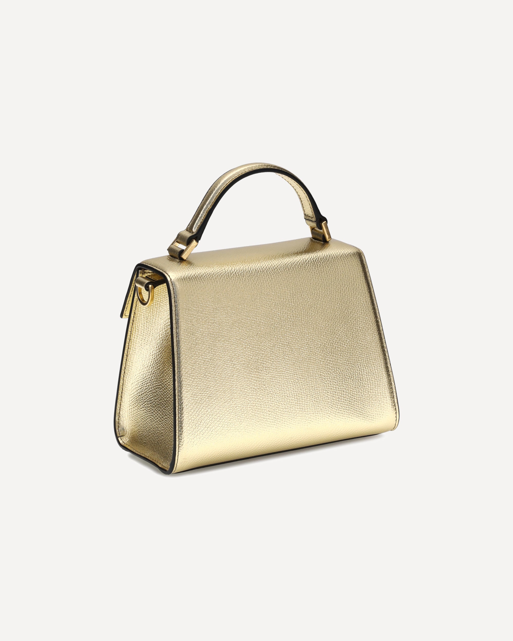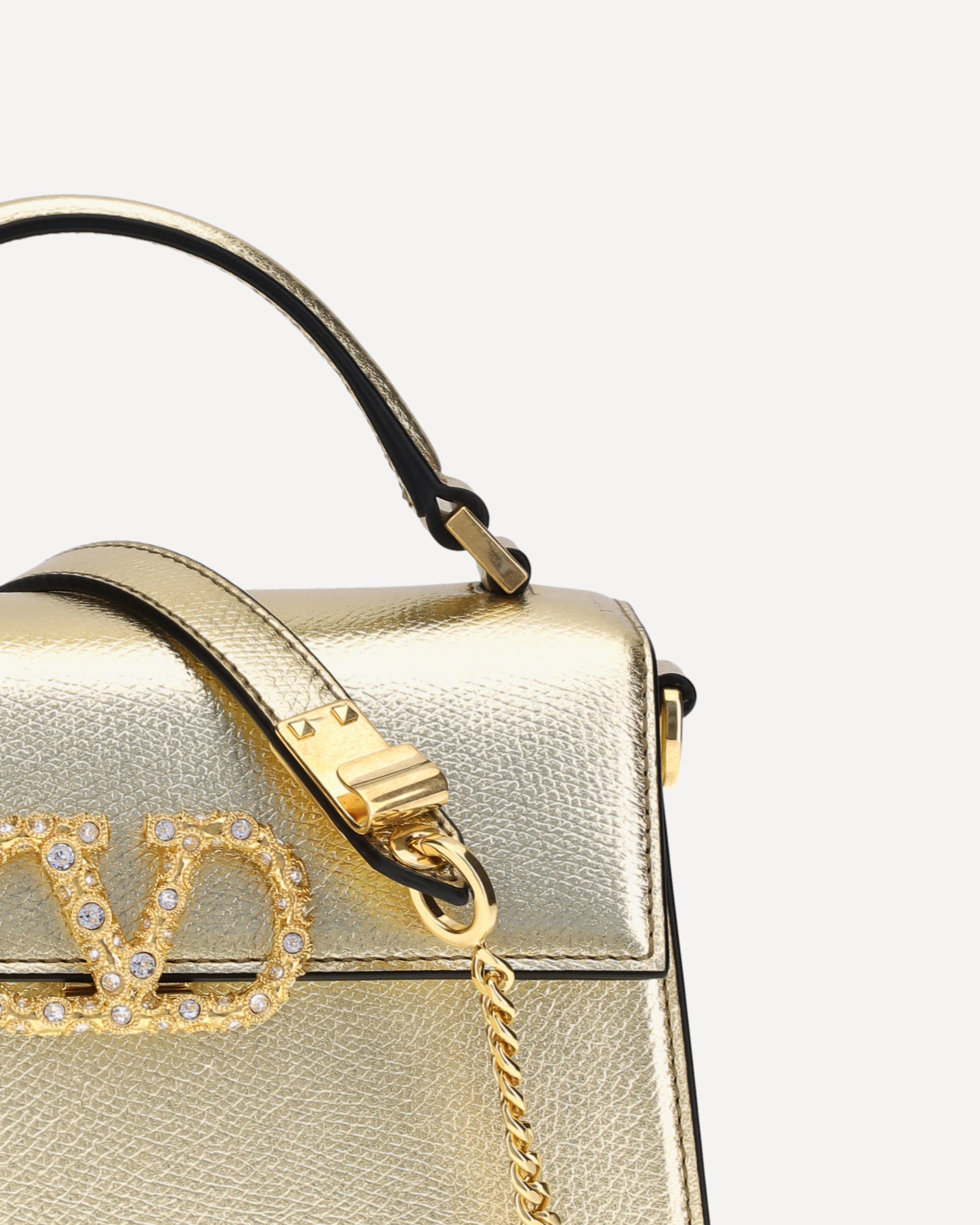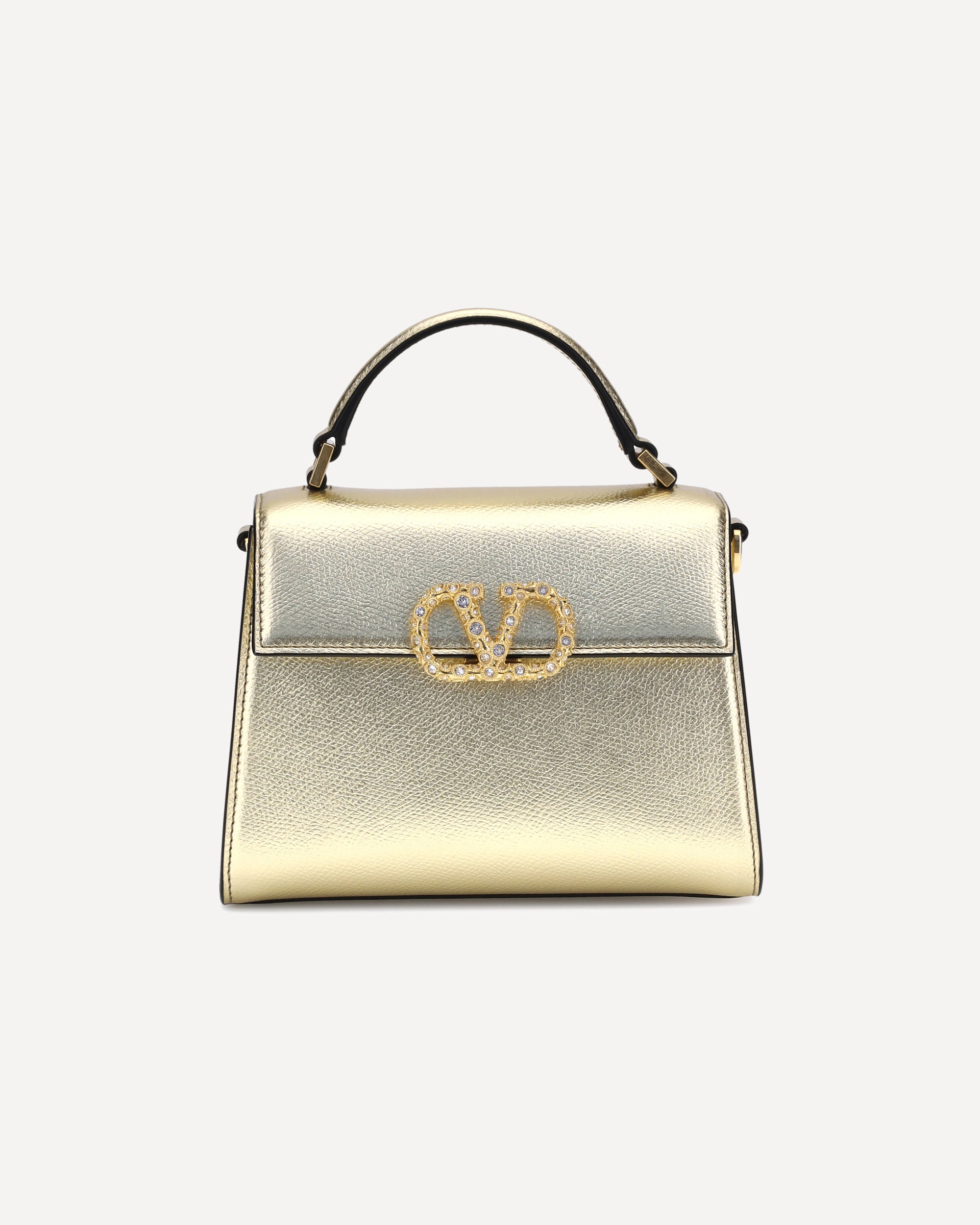 La Borsa a Mano mini di Valentino Garavani è realizzata in pregiato vitello granato metallizzato e si distingue per la chiusura gioiello con VLogo Signature. Versatile e raffinata, può essere portata a mano grazie al manico o a spalla/crossbody tramite la tracolla estendibile. La chiusura magnetica con logo e i piedini protettivi completano il design con funzionalità ed eleganza.