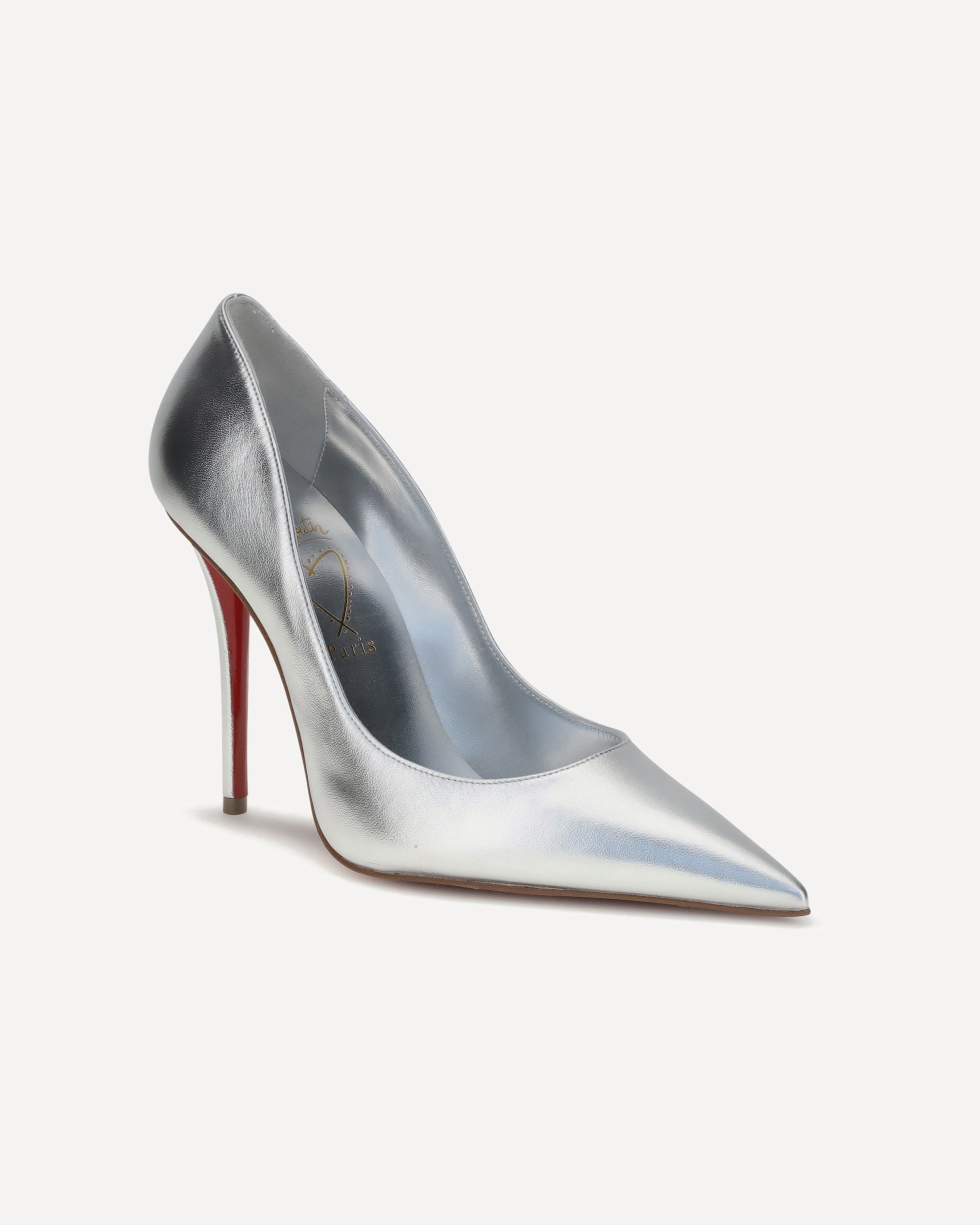 Le Décolleté Miss Z di Christian Louboutin incarnano eleganza e femminilità in una silhouette slanciata e raffinata. Realizzate in pelle argentata dal finish laminato, presentano una punta a mandorla che aggiunge un tocco delicato e senza tempo. Il tacco a stiletto esalta la figura, mentre la celebre suola rossa completa il design con l’inconfondibile firma della Maison.
